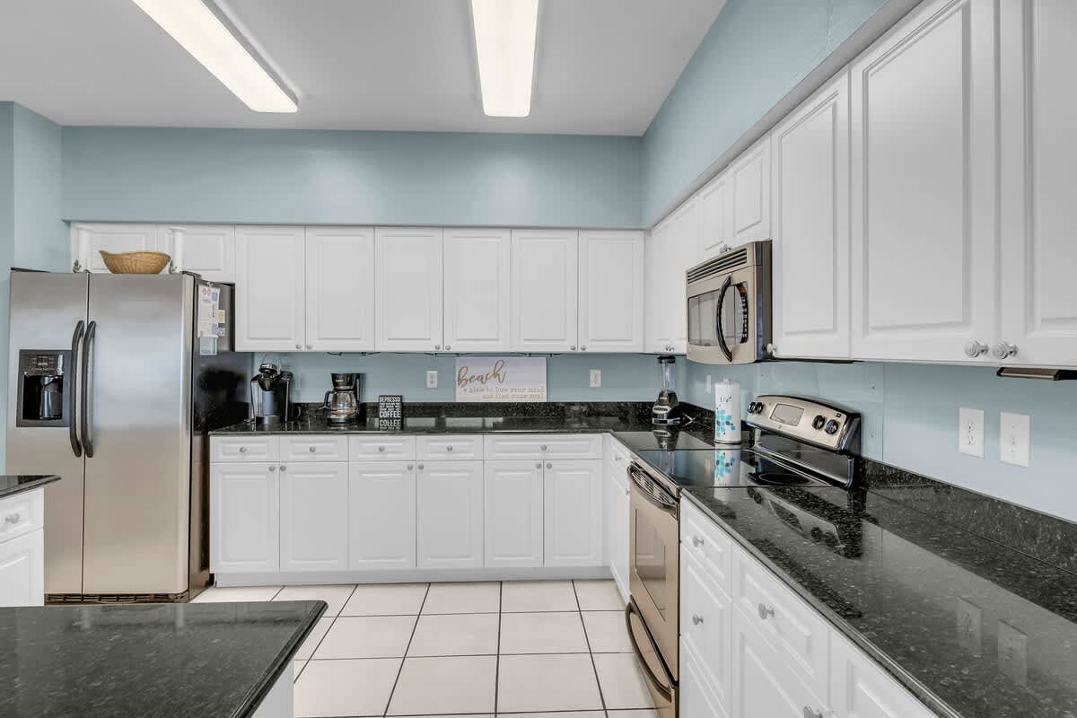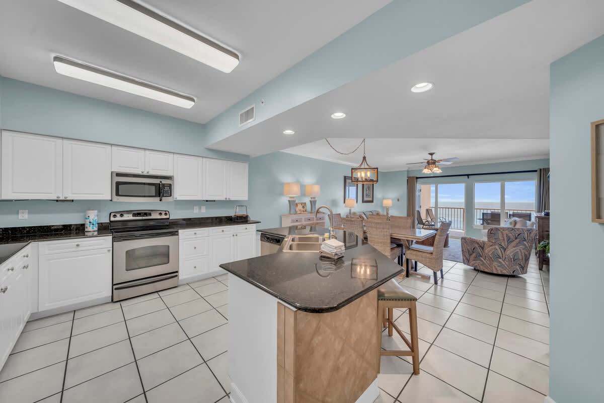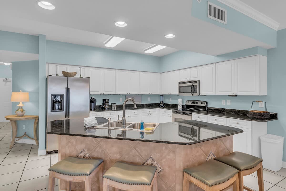 This 2-bedroom, 2.5-bath condo offers 1,500 square feet of living space and sleeps up to 6 guests. The living room features comfortable seating, a queen sleeper sofa, a 42” HDTV, Blu-ray player, and stereo system. A wet bar with a wine chiller adds convenience, and the dining area seats six with additional seating at the breakfast bar. The fully equipped kitchen includes stainless steel appliances, granite countertops, and everything needed for simple meals or full dinners. A full-size washer and dryer are also included.