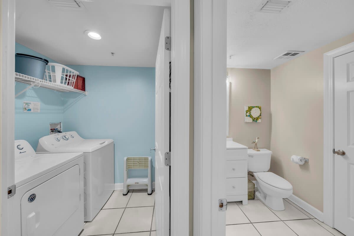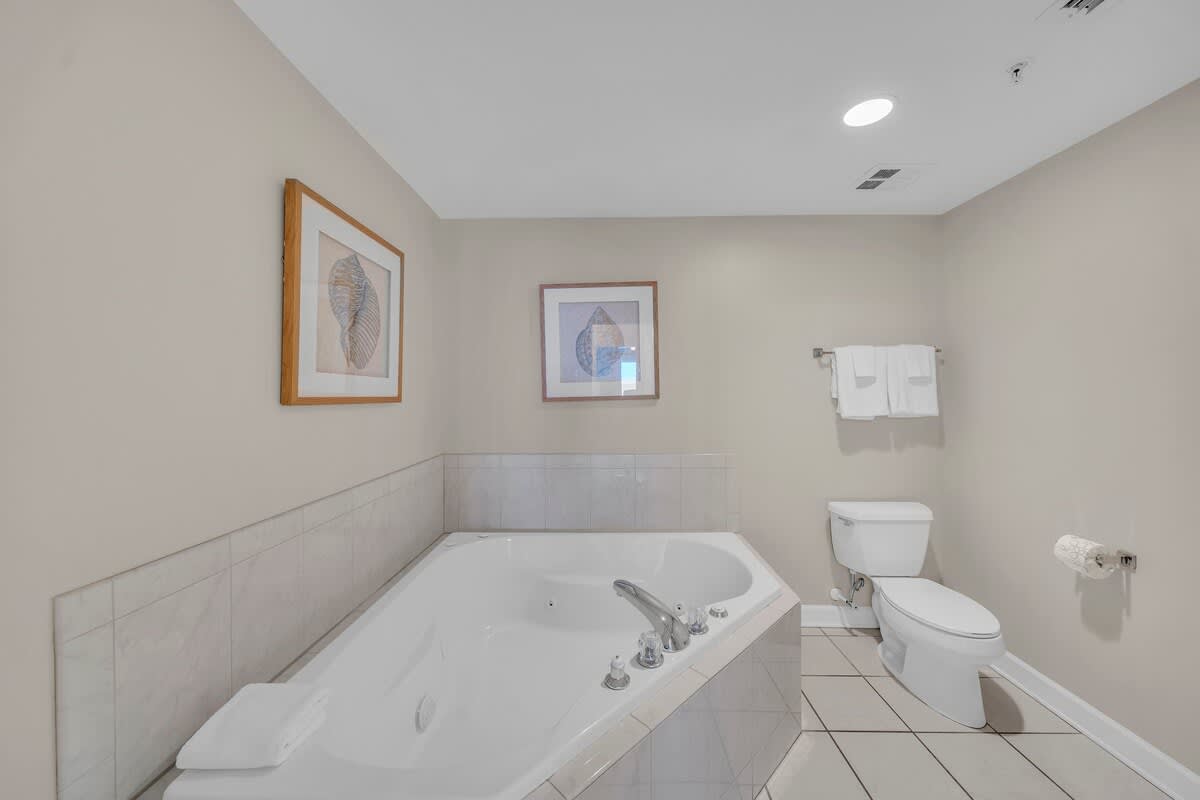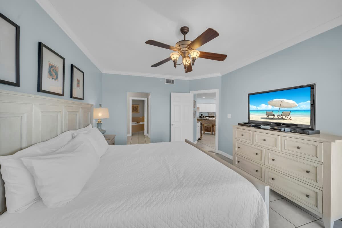The primary bedroom includes a king bed, TV, balcony access, and a private bathroom with double vanities, a whirlpool tub, and a walk-in shower. The guest bedroom also features a king bed, TV, and private bathroom, along with ample storage. An additional half bath provides extra convenience for families or groups.