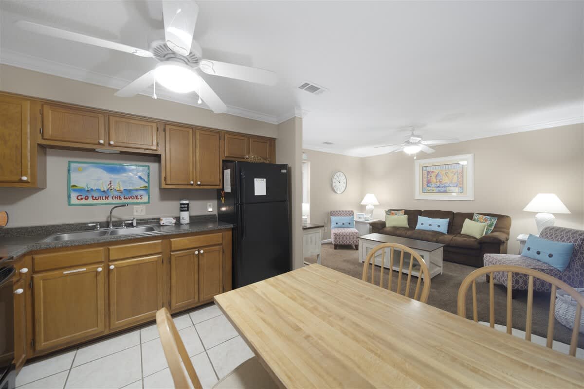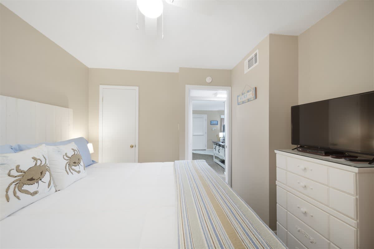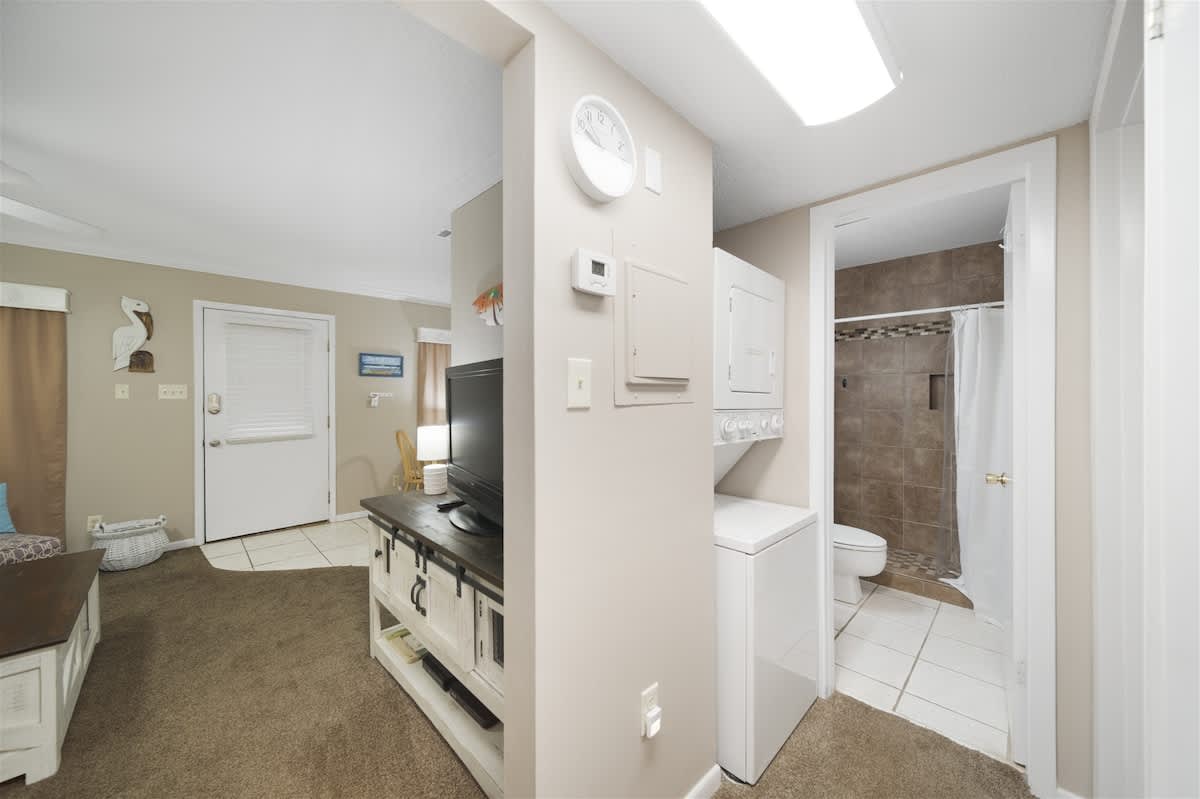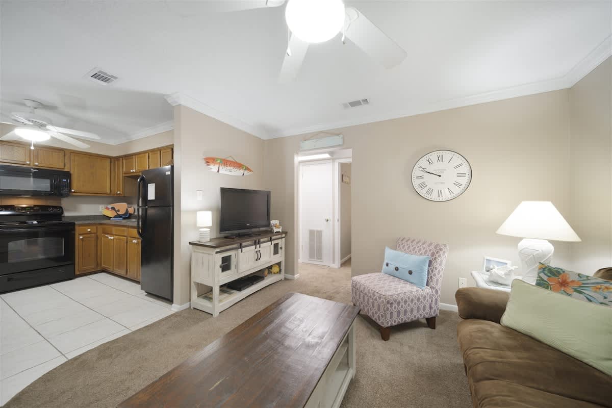 This 2-bedroom, 1-bath condo sleeps up to 5 guests and features an open-concept living, dining, and kitchen area that works well for couples or small families. The space is set up for comfort and practicality, with flat-screen TVs in every room, fast WiFi, and a washer and dryer to make longer stays more convenient. The layout is easy and functional, perfect for spending time together after a day at the beach.