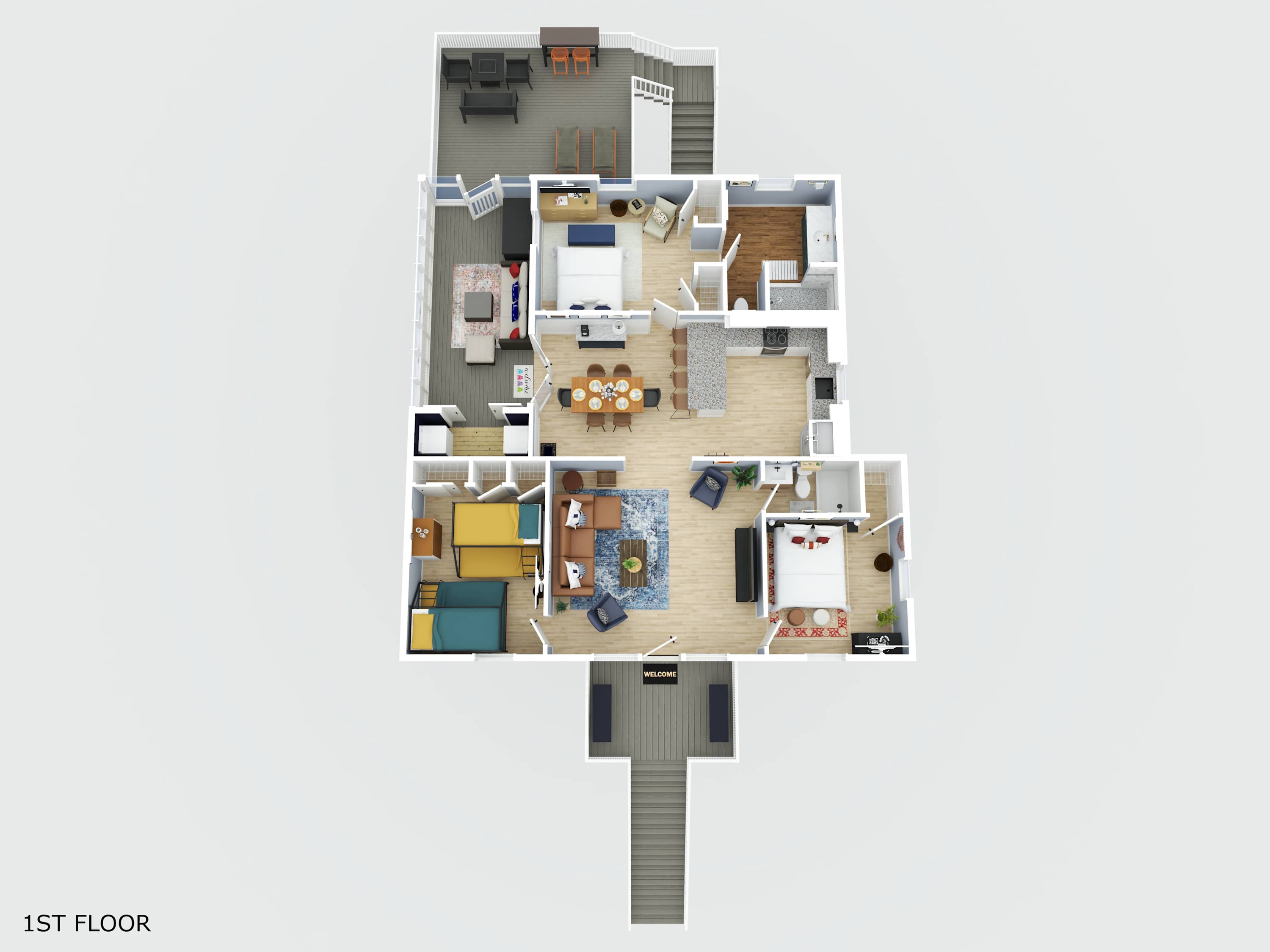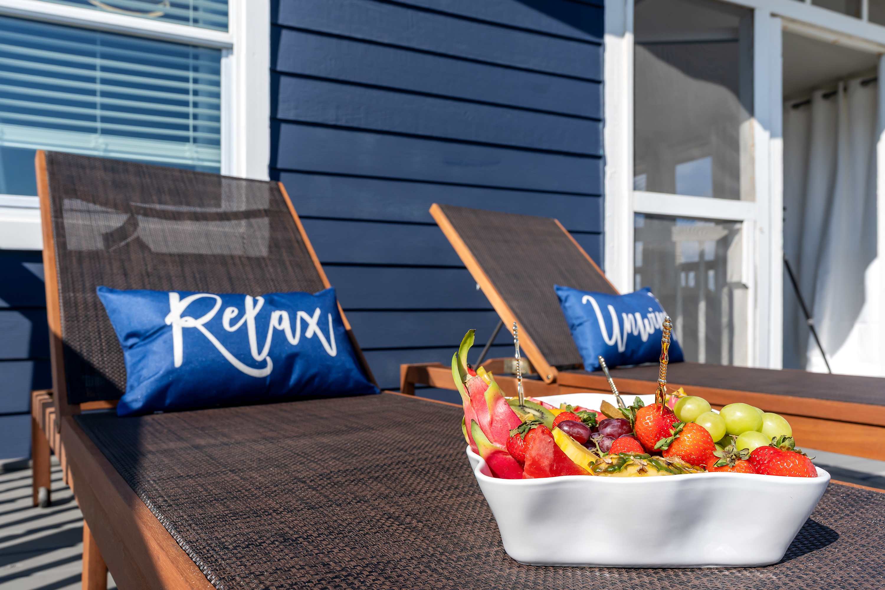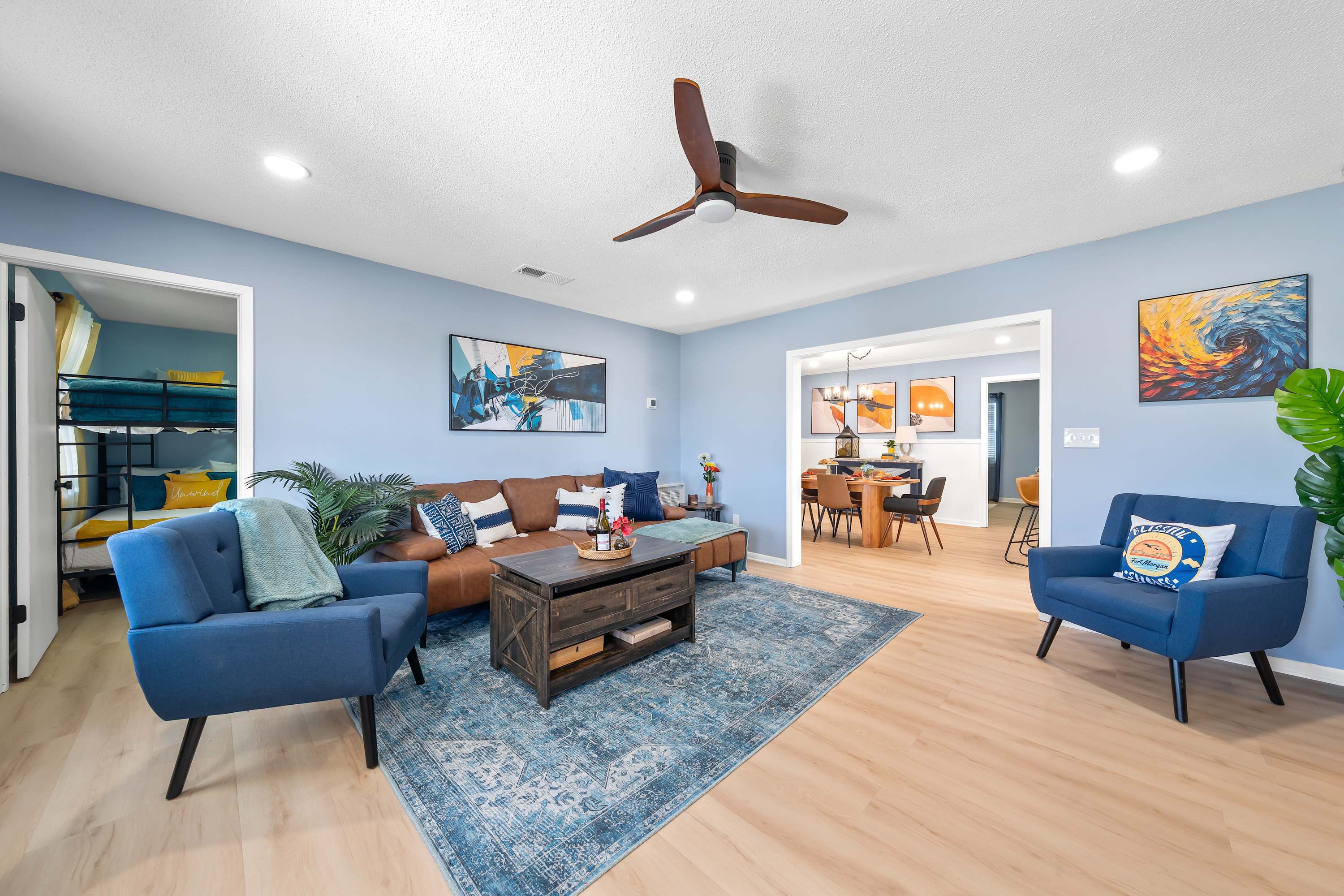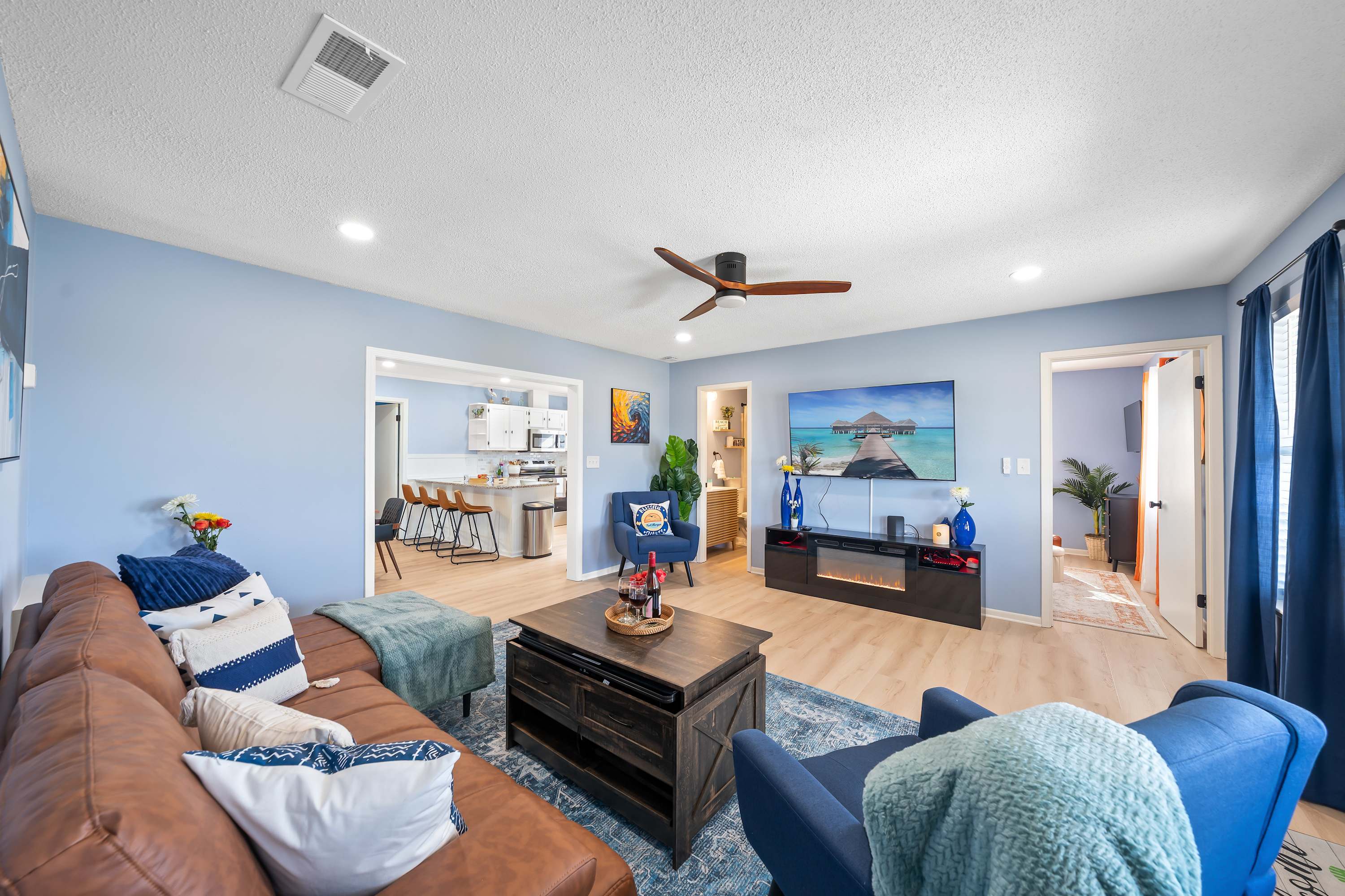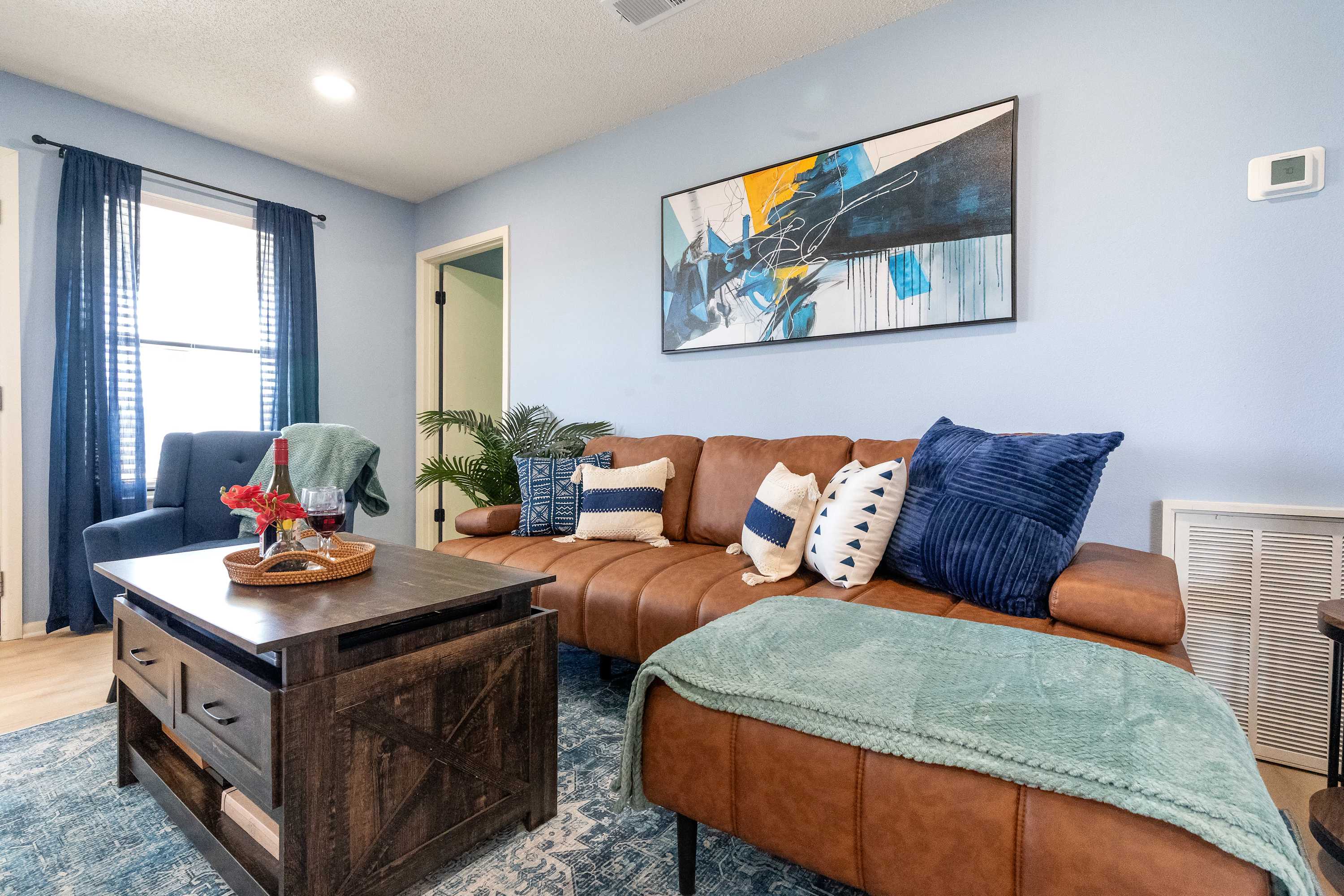 The home's exterior boasts a modern coastal house design, painted in vibrant blue accented by clean lines of whites and yellow front door that contrast the emerald, green colors of the gulf coast yet complement the softness of the ocean breeze. The driveway offers ample parking space for you and your companions.