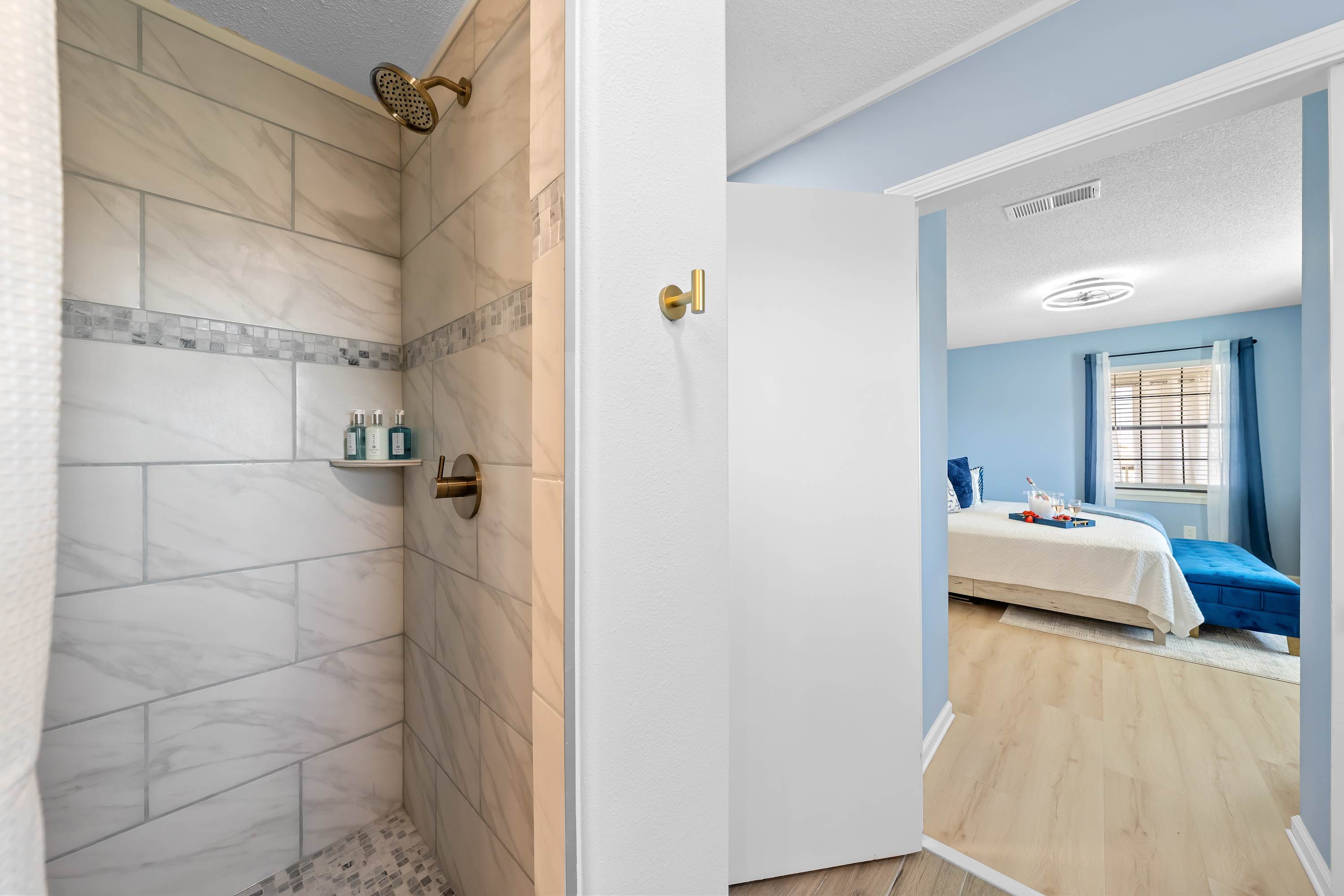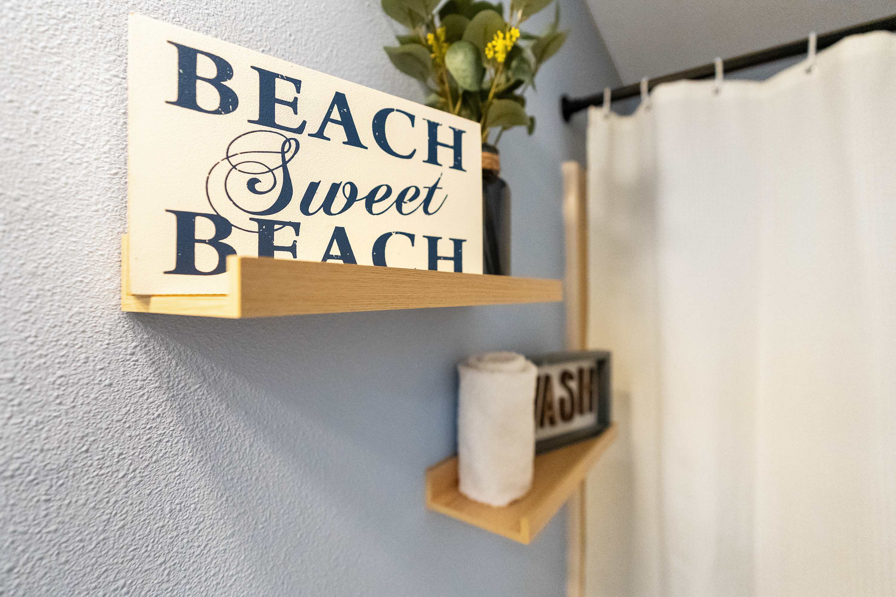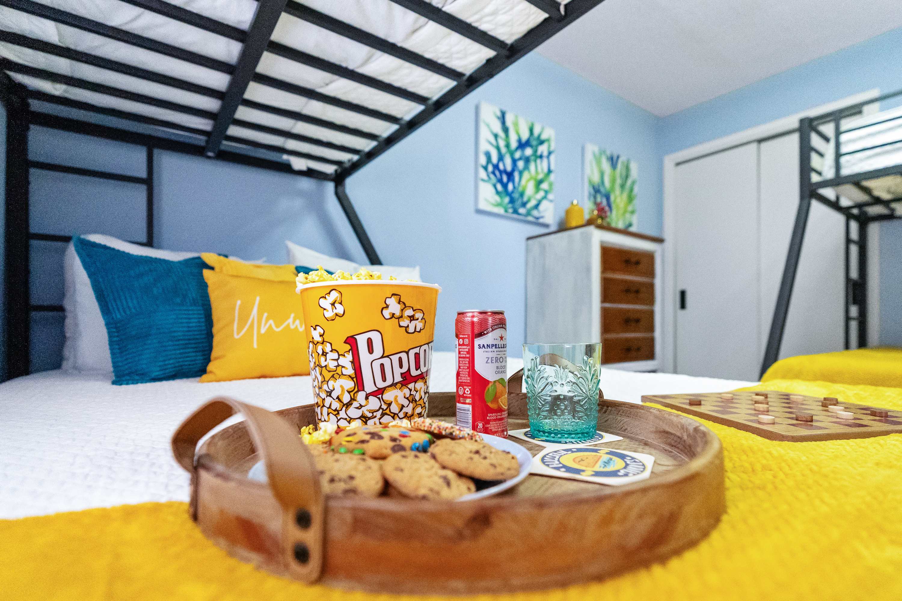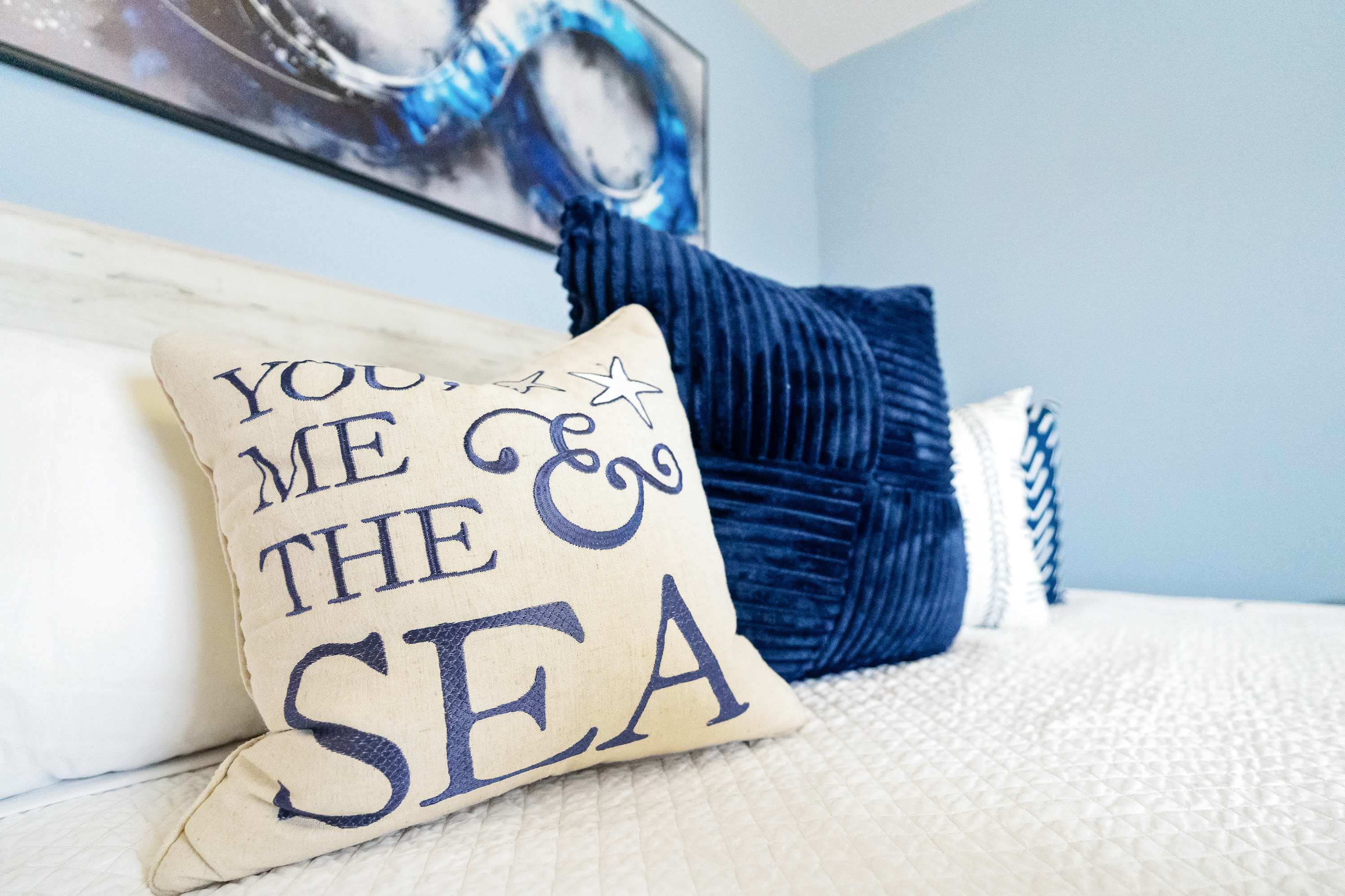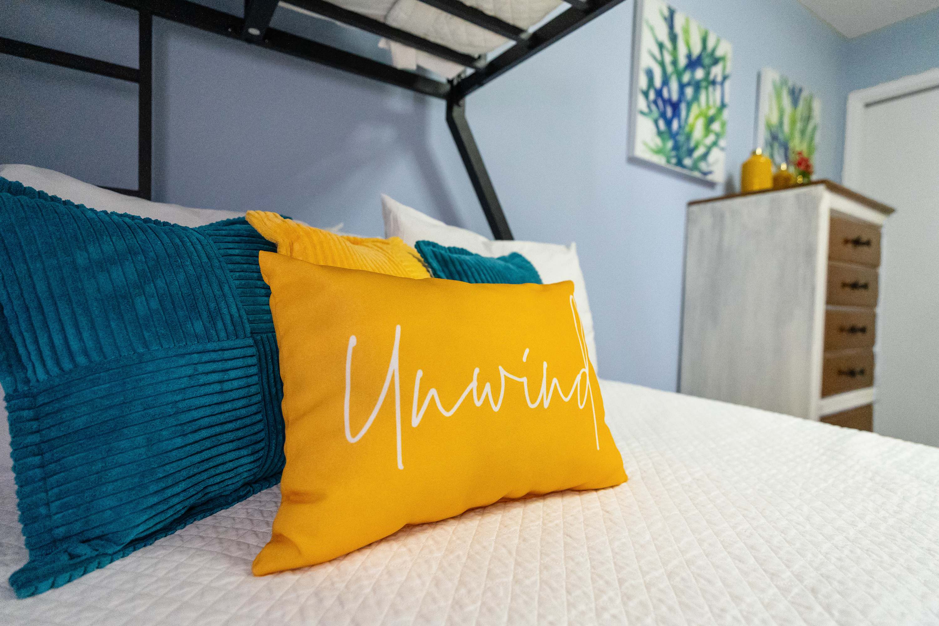 As you explore the bedrooms, you're greeted by the tasteful decoration and thoughtfully chosen furnishings. Each room exudes a unique modern design with plush bedding and ample storage to make your stay feel like an escape from the ordinary. The primary bedroom boasts a king bed, TV, a seating area, and an en-suite bathroom, adding a touch of luxury to your vacation experience. Equally relaxing is the second bedroom furnished with a king bed with plush bedding and décor that embody the beautiful colors of the sunset to help its dweller unwind. The third bedroom is set-up for those who appreciate adventure boasting two twin over queen bunk beds and surrounded with framed local attractions intentionally placed in this room to remind you of the adventure that awaits you with parasailing, kayaking, boating, fishing, jet-skiing, hiking and historic forts visit.