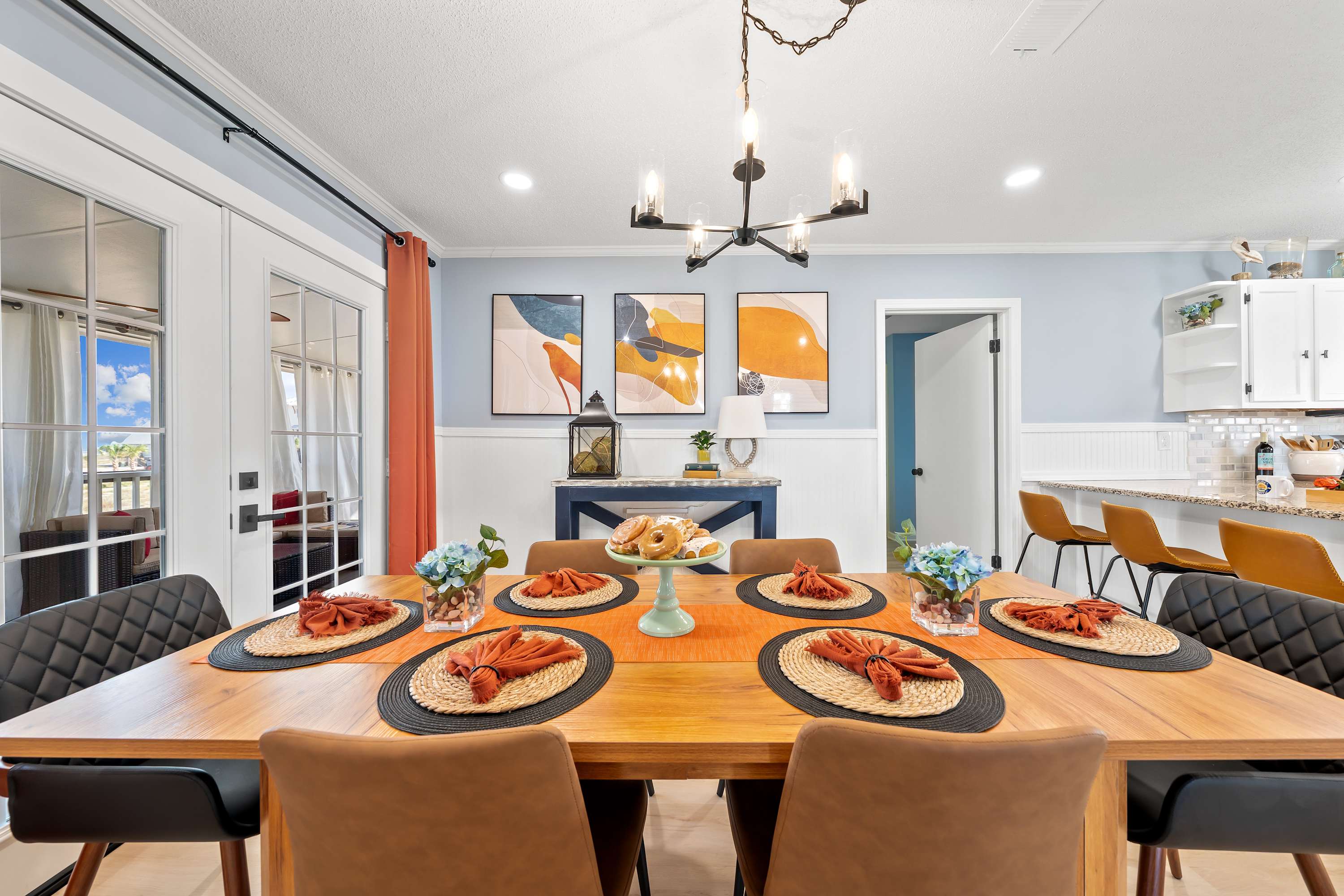 The kitchen is a focal point, equipped with modern appliances, granite countertops, and ample cabinetry stocked with essential cookware. You can envision preparing leisurely breakfasts and hearty beachside picnics within its confines. A spacious dining area adjacent to the kitchen features a large dining table that exudes simplicity and comfort where you and your friends and/or family can gather for meals or play board games while sharing stories and laughter.