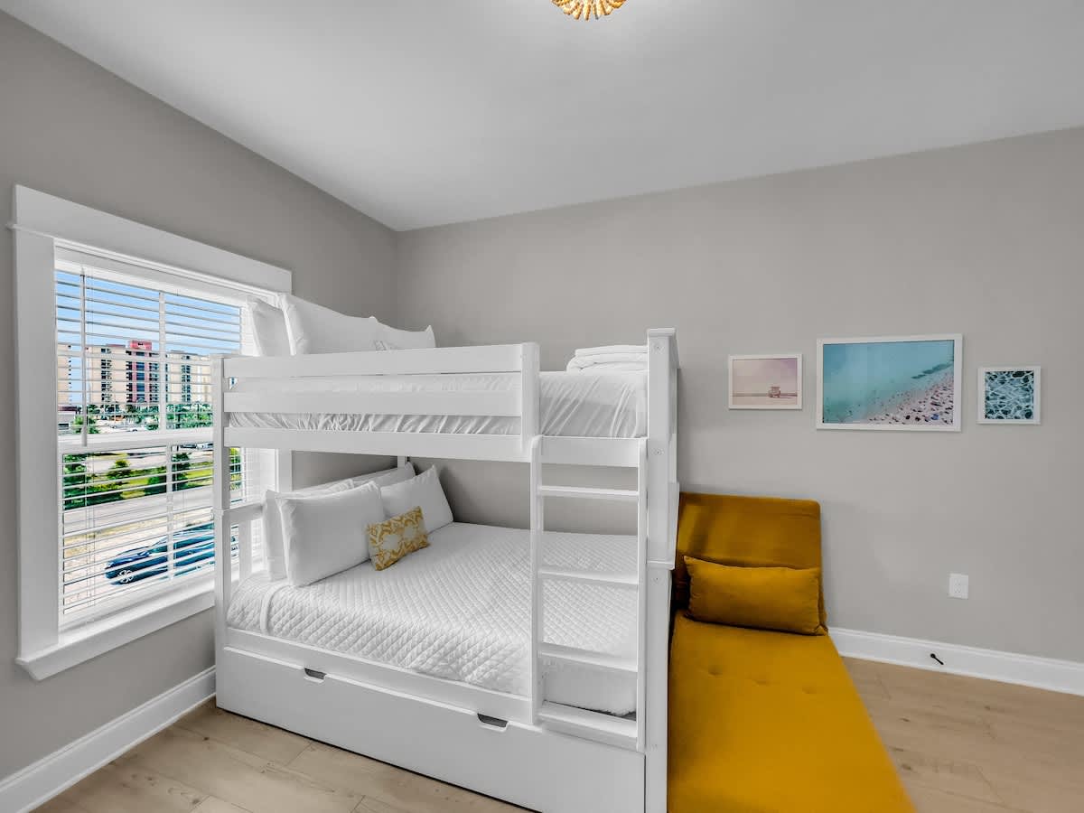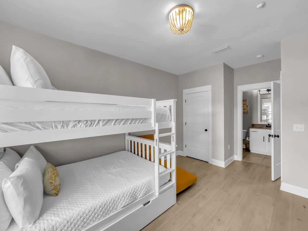 The sleeping arrangements are as comfy as they are versatile! The primary bedroom offers a king-size retreat fit for royalty, while the first guest room features a cozy queen bed. The second guest room brings the fun with a double-over-double bunk bed and a trundle—perfect for kids or groups. Each bedroom has its own private bath, plus there’s an extra full bath on the main floor for everyone’s convenience.