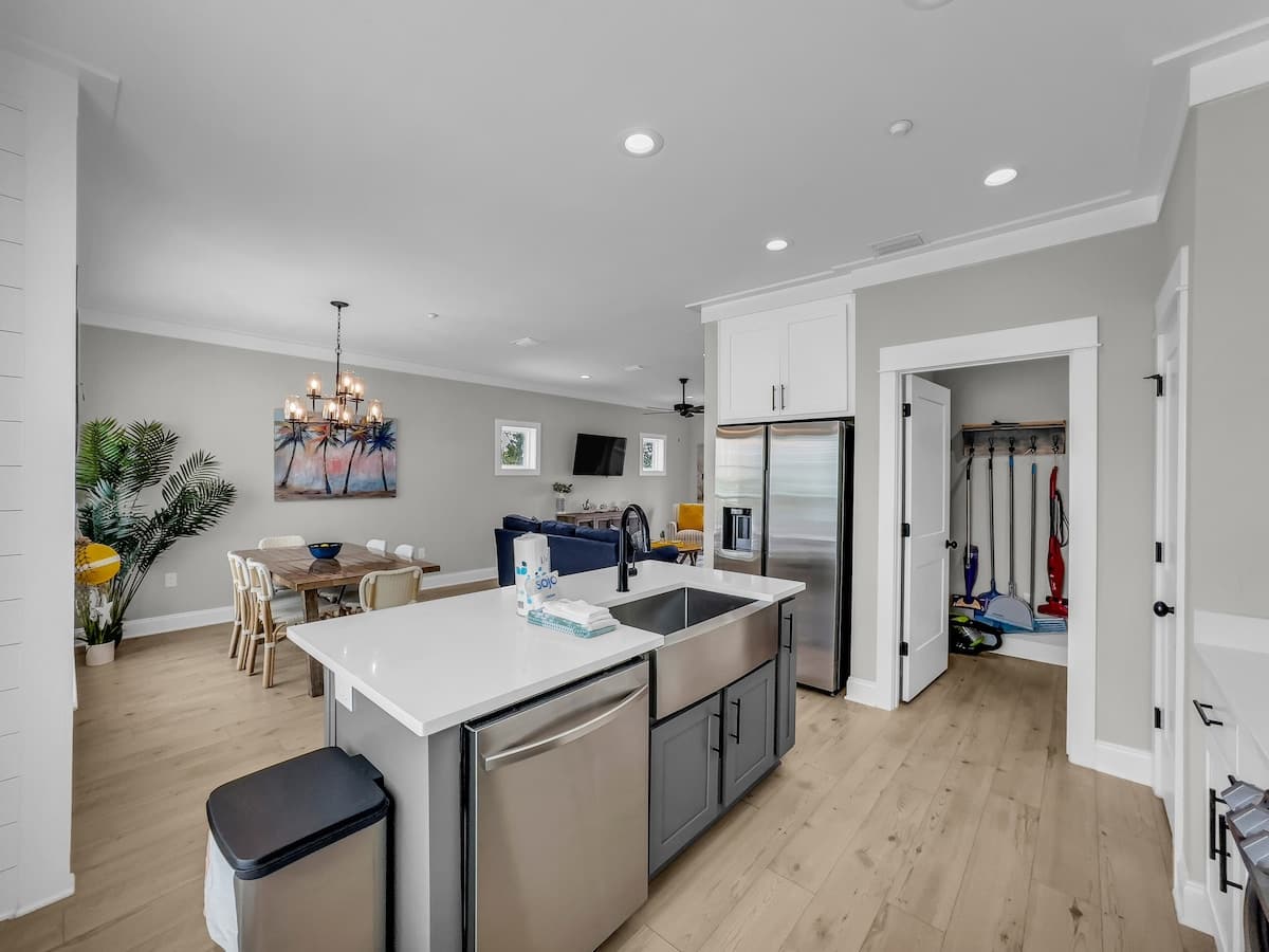 Inside, you’ll find a dream kitchen with stainless steel appliances, granite countertops, and a 5-burner gas stove—perfect for whipping up a seafood feast or snacks for a movie night in the cozy open-concept living and dining areas.