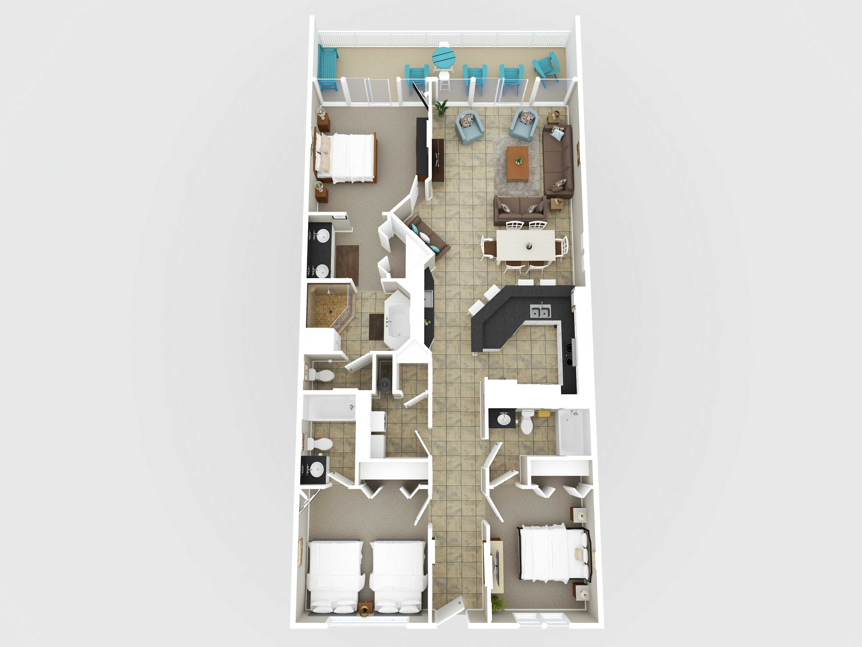 The primary bedroom includes a king bed, Gulf views, balcony access, and a private bathroom with dual vanities, a jetted tub, and walk-in shower. The first guest bedroom features a king bed and access to a shared bathroom, while the second guest bedroom includes two queen beds and a private bathroom. A washer and dryer are also included for added convenience.