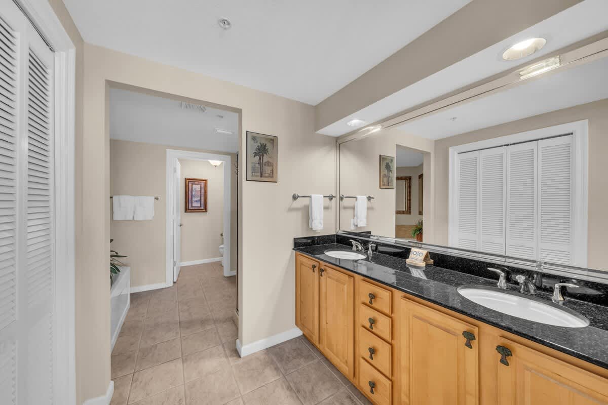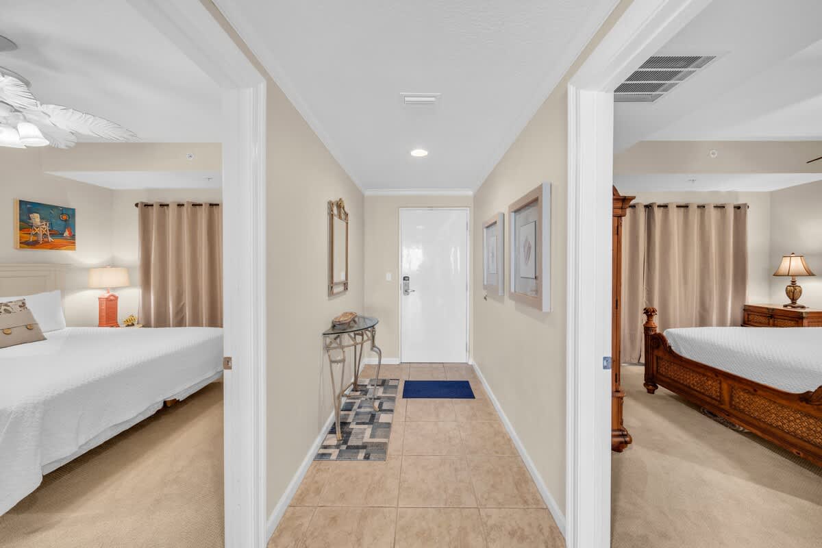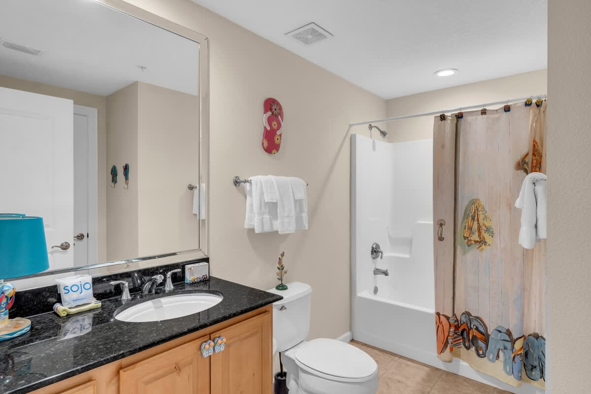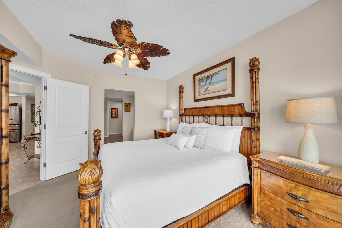 Wake up in the spacious primary suite, complete with a king-sized bed, private balcony access, and an en-suite bathroom featuring a jetted garden tub, walk-in shower, and double vanity. The first guest bedroom offers a cozy queen bed and its own en-suite bathroom, while the second guest bedroom boasts a king-sized bed and access to a nearby guest bath, making this retreat perfect for family or friends.