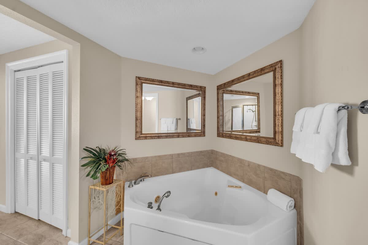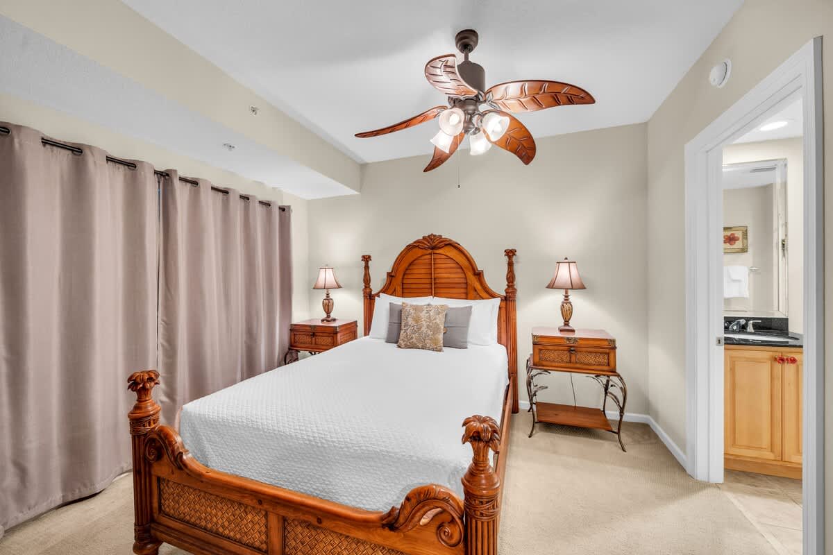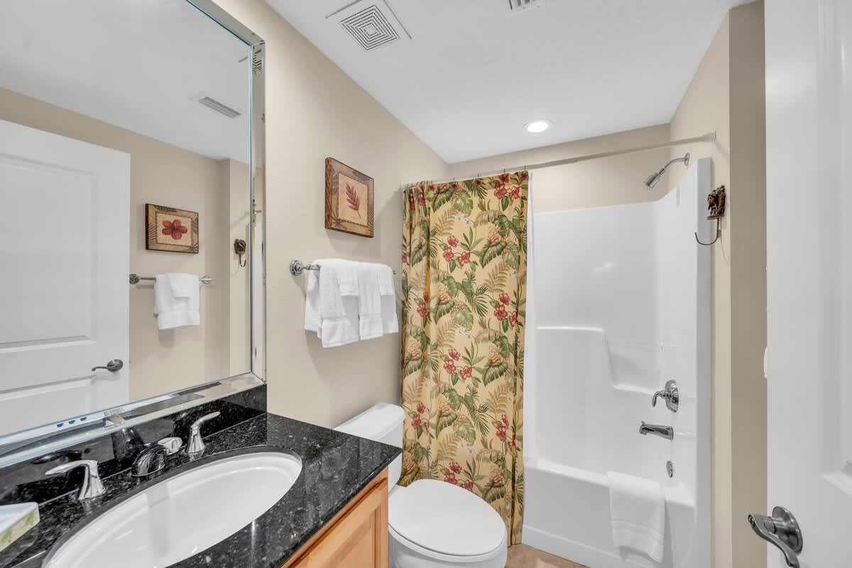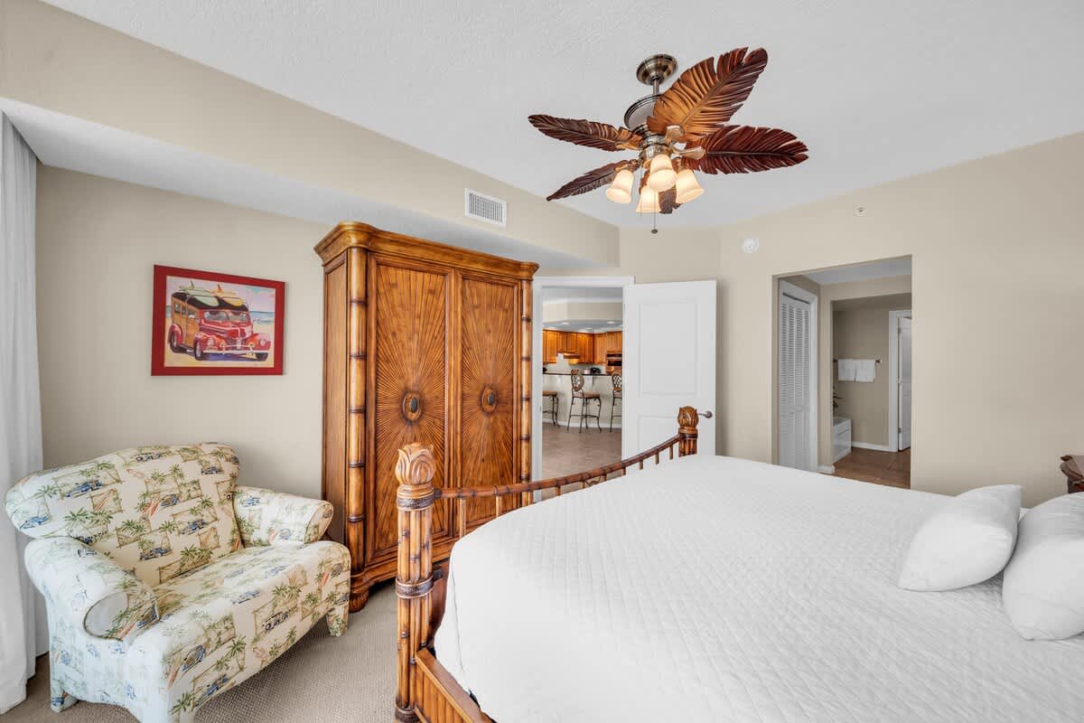 Wake up in the spacious primary suite, complete with a king-sized bed, private balcony access, and an en-suite bathroom featuring a jetted garden tub, walk-in shower, and double vanity. The first guest bedroom offers a cozy queen bed and its own en-suite bathroom, while the second guest bedroom boasts a king-sized bed and access to a nearby guest bath, making this retreat perfect for family or friends.