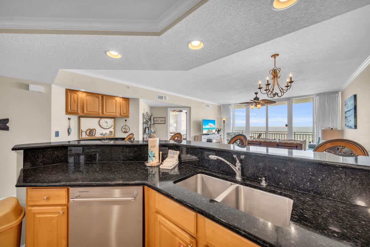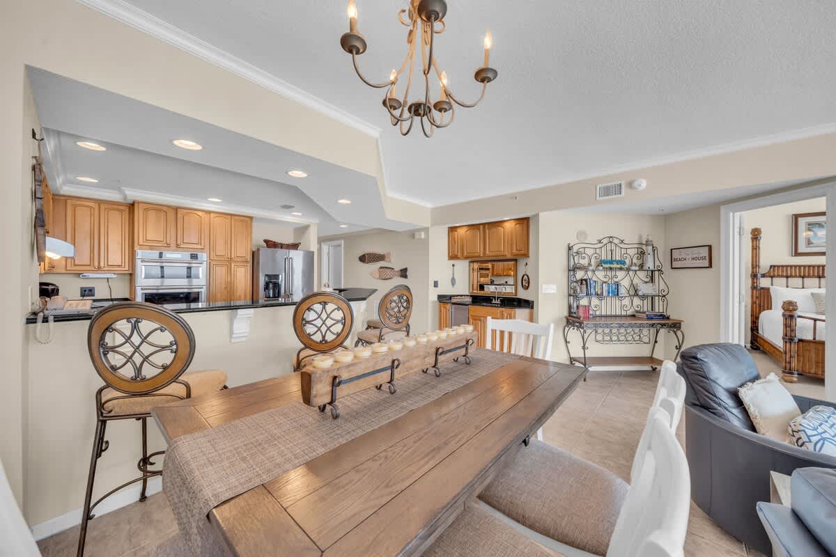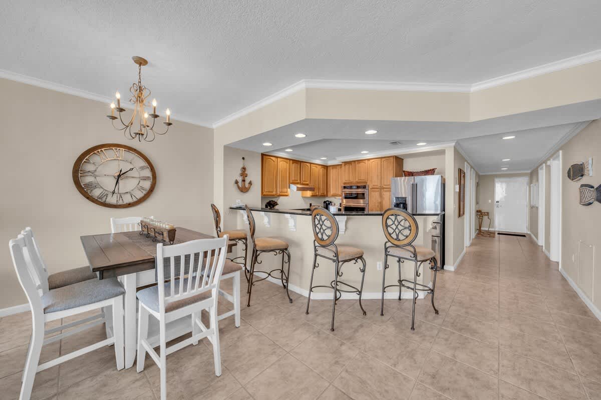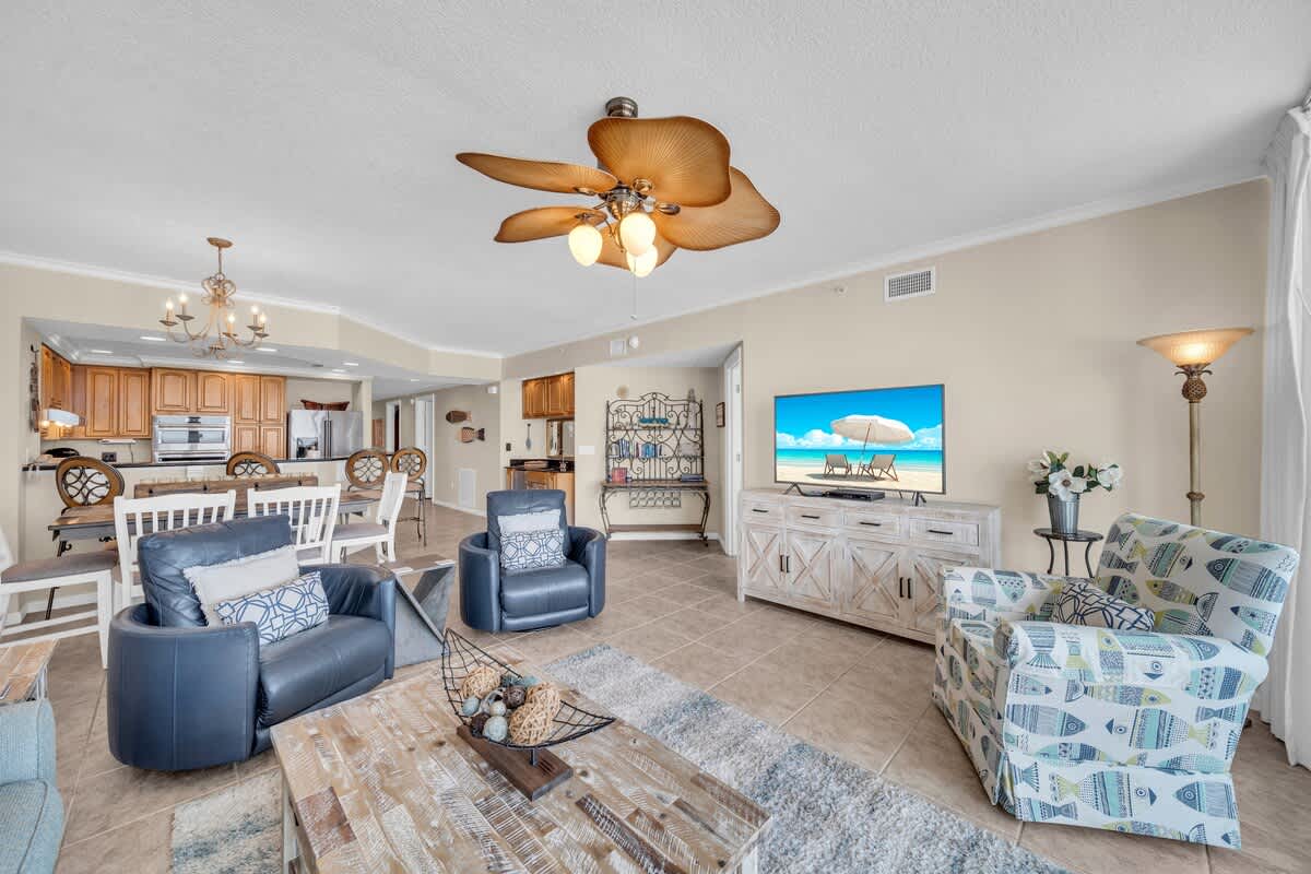 The living area is filled with natural light from expansive windows, framing picture-perfect Gulf views. Kick back and enjoy the smart TV or stay connected with reliable Wi-Fi. The dining room comfortably seats six, with room for four more at the breakfast bar—perfect for gathering after a day on the beach.