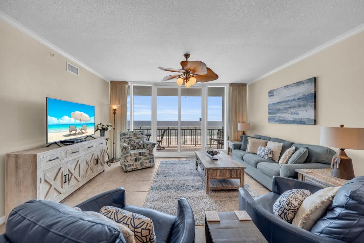 Perched on the 5th floor with stunning views of the Gulf, this luxurious 3-bedroom, 3-bath condo offers more than just a stay—it’s a lifestyle. With its mix of Southern charm, beach vibes, and touches of palm tree elegance, every detail invites you to relax and enjoy.