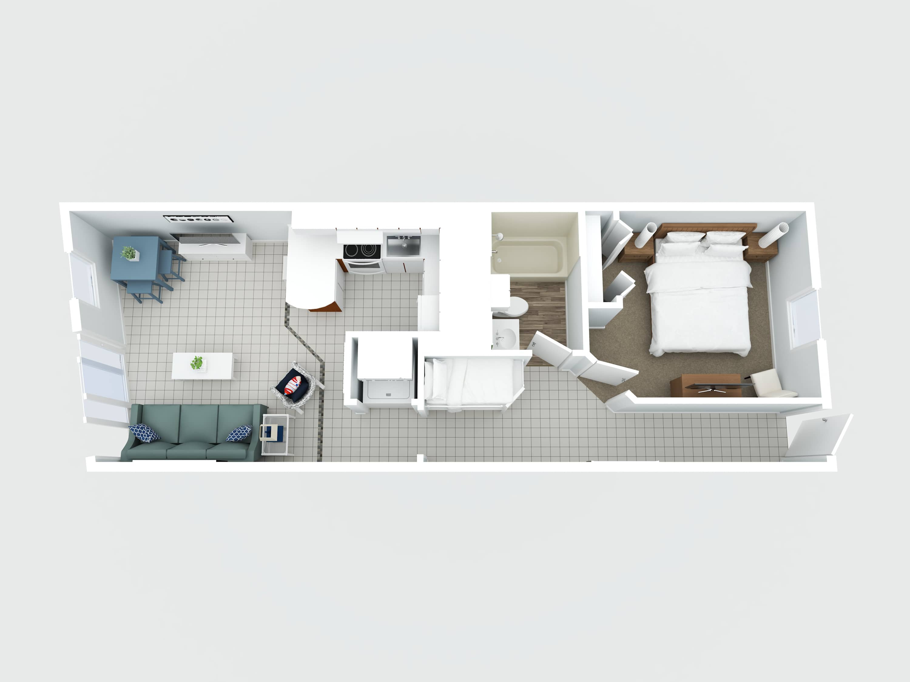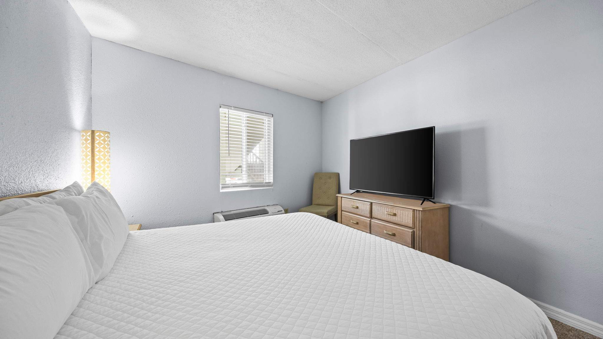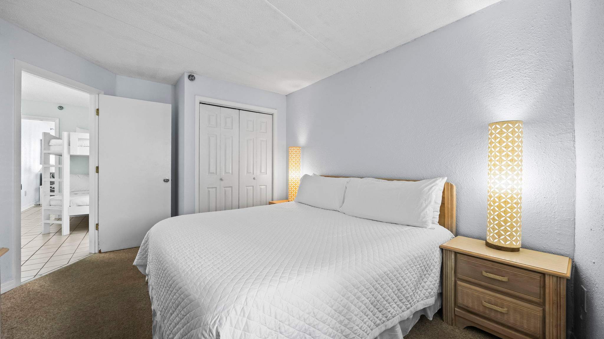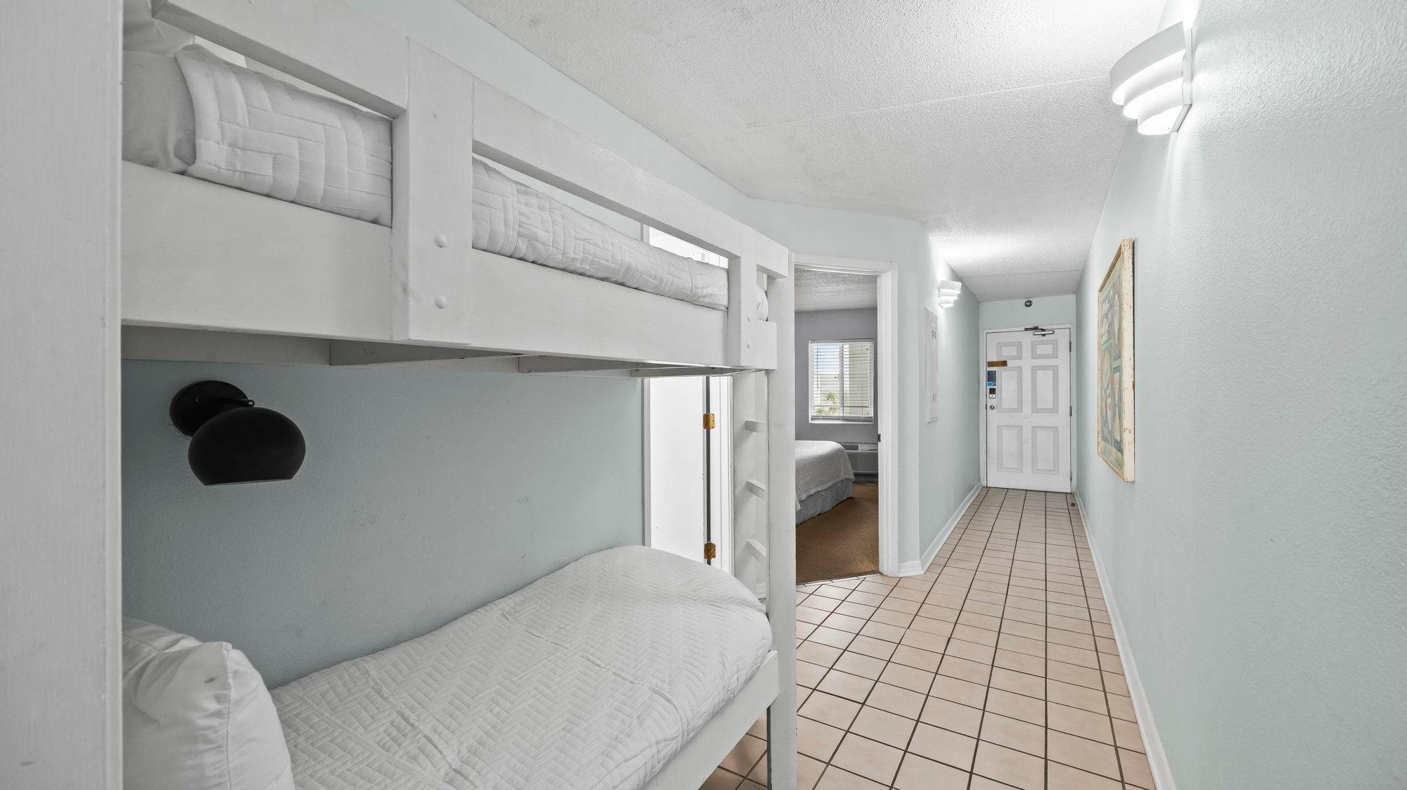 This unit is designed to sleep 6 guests comfortably, with a king bed in the primary bedroom and built-in hallway bunks for additional sleeping space. The open living area includes comfortable seating, a TV, and a fully equipped kitchen with everything needed for simple meals or snacks. A full bathroom and a stacked washer and dryer add convenience, especially for longer stays.