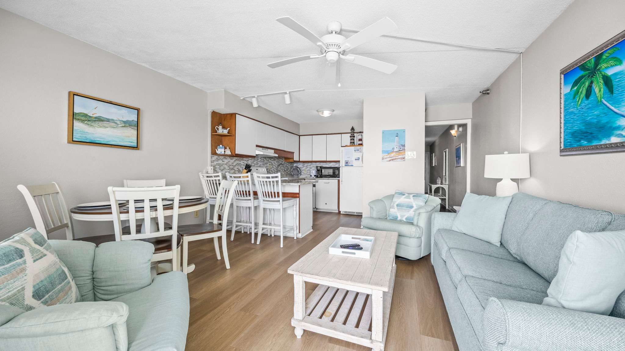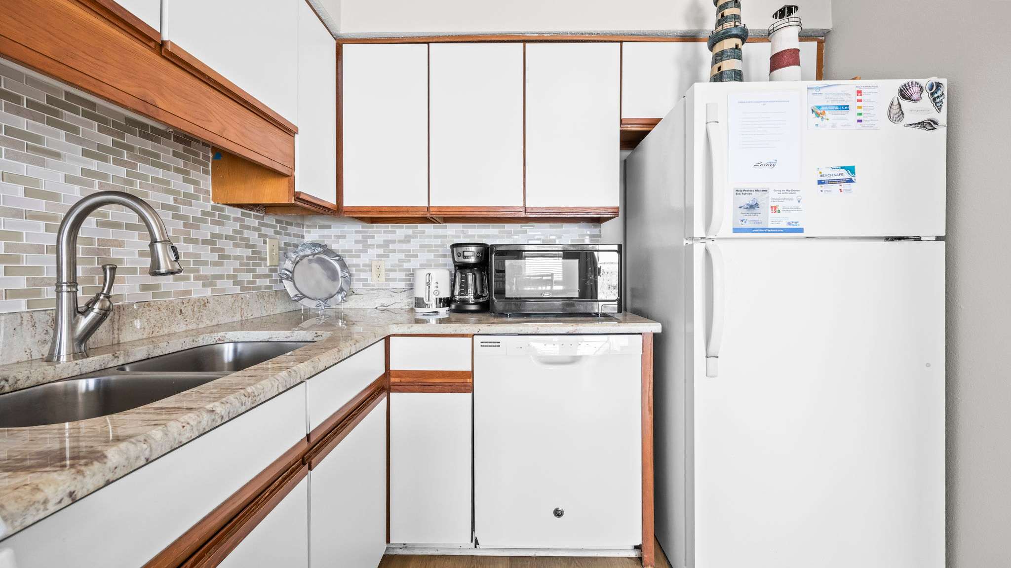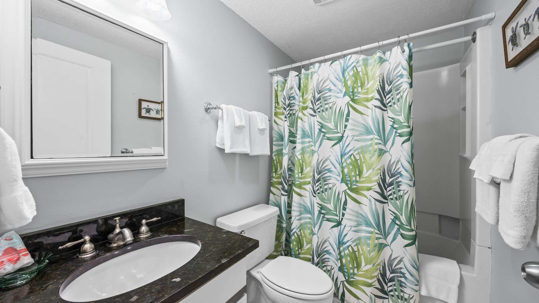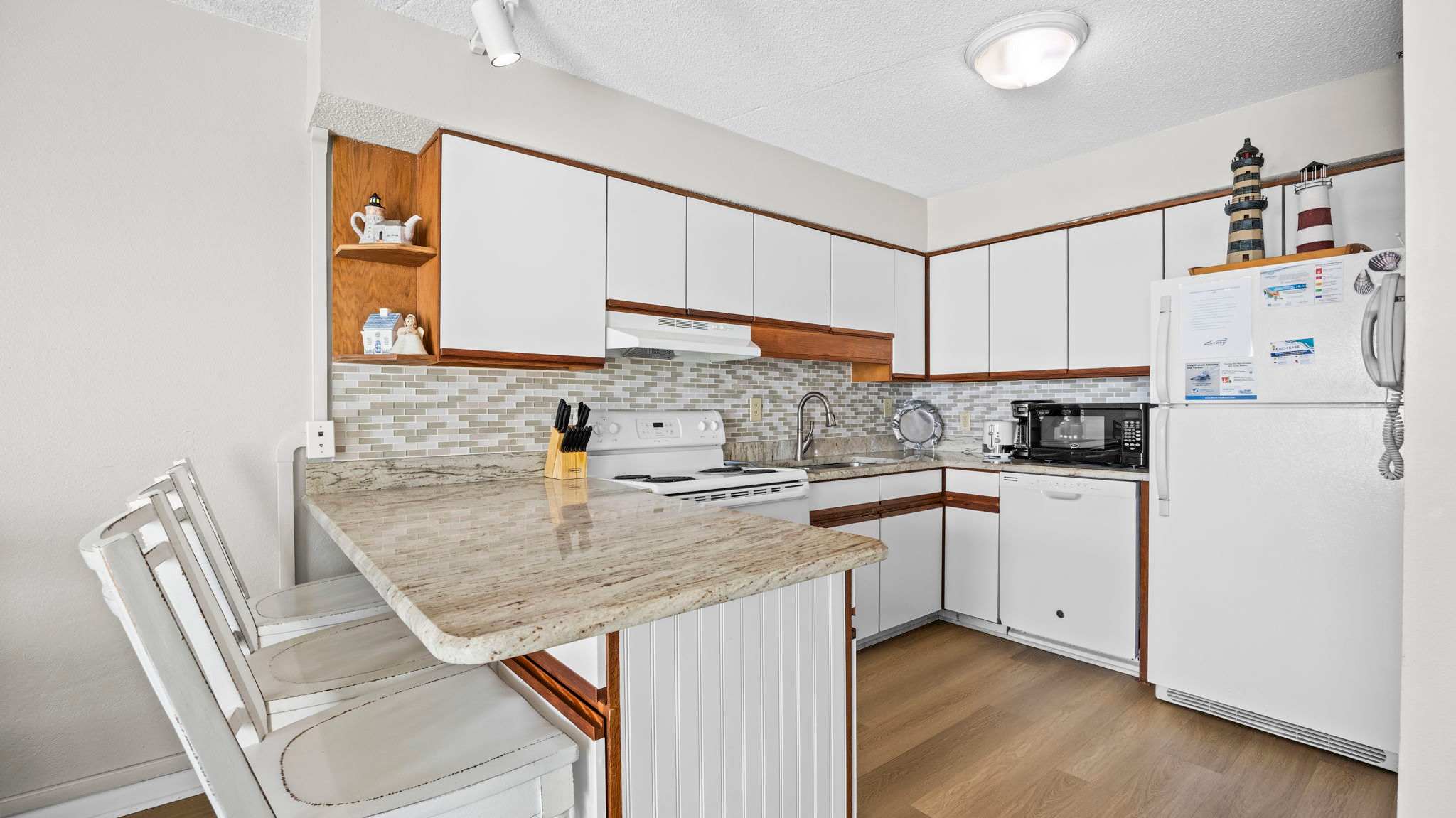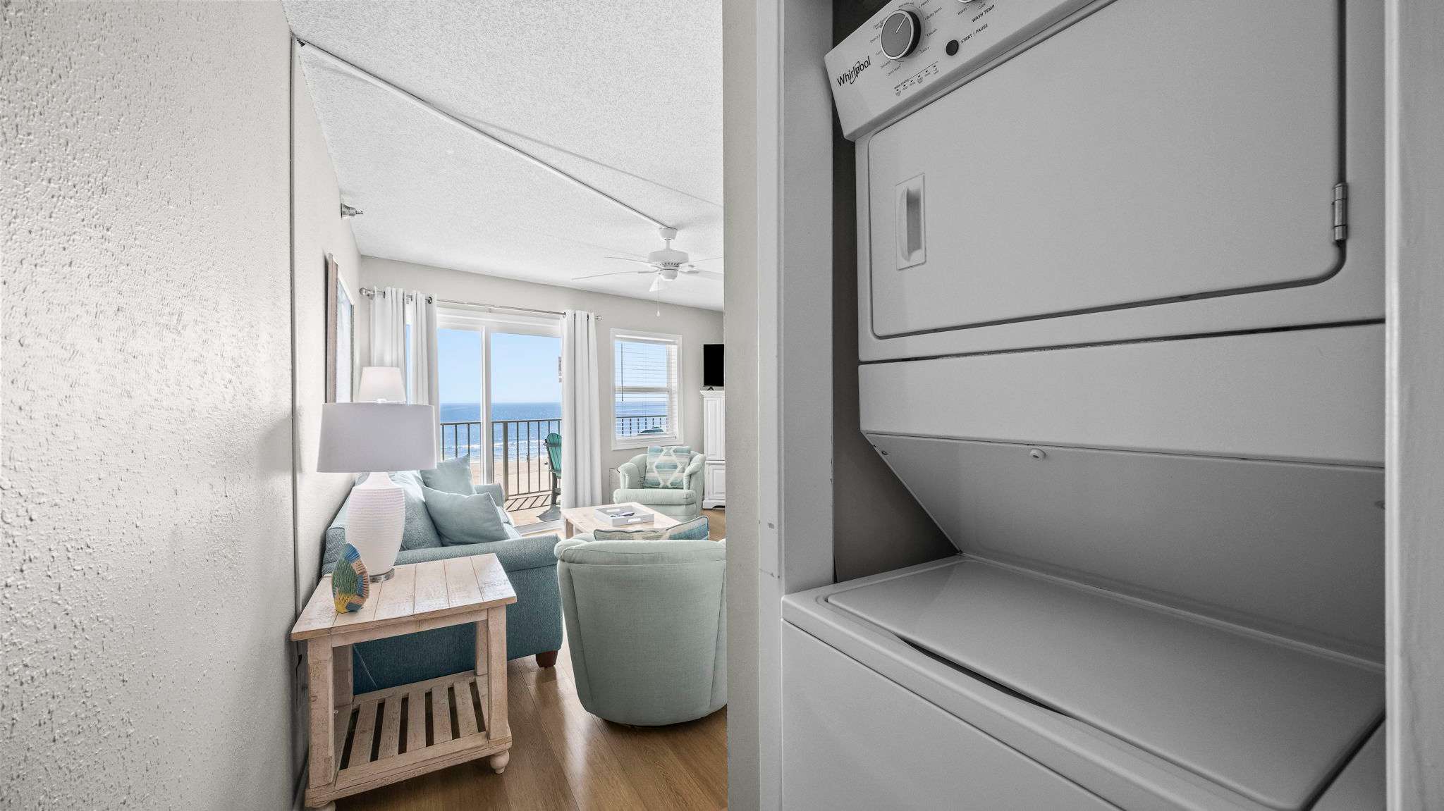 The fully equipped kitchen provides everything you need to prepare meals, from full-sized appliances to cookware and a coffee maker. A dining area and breakfast bar offer plenty of seating to enjoy your meals together. The condo includes one full bathroom and an additional half bath for added convenience. A stacked washer and dryer make it easy to refresh your beach towels after a day in the sun.