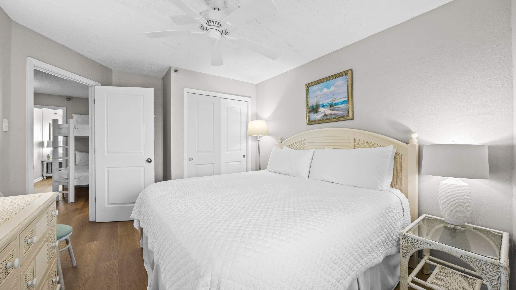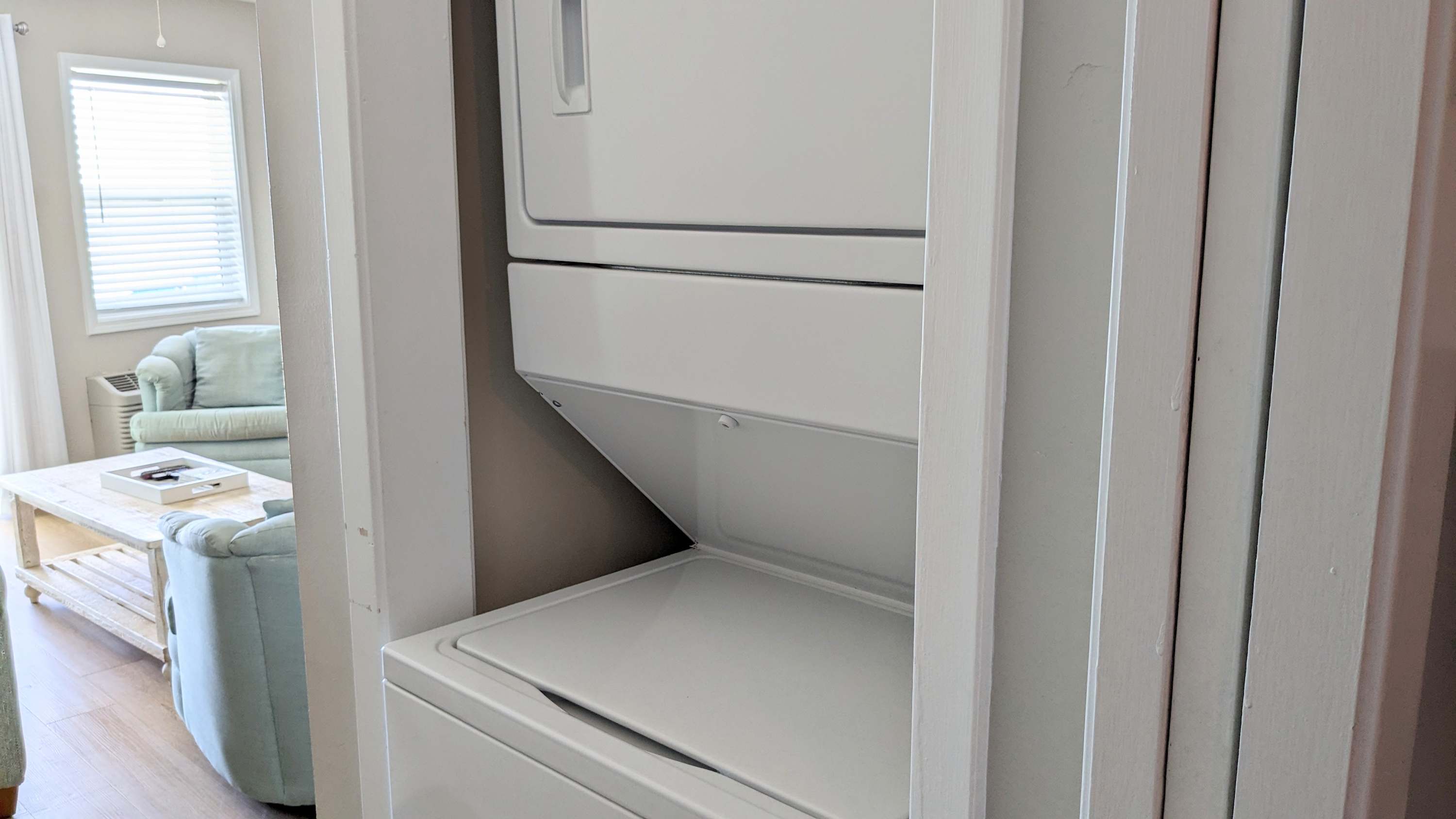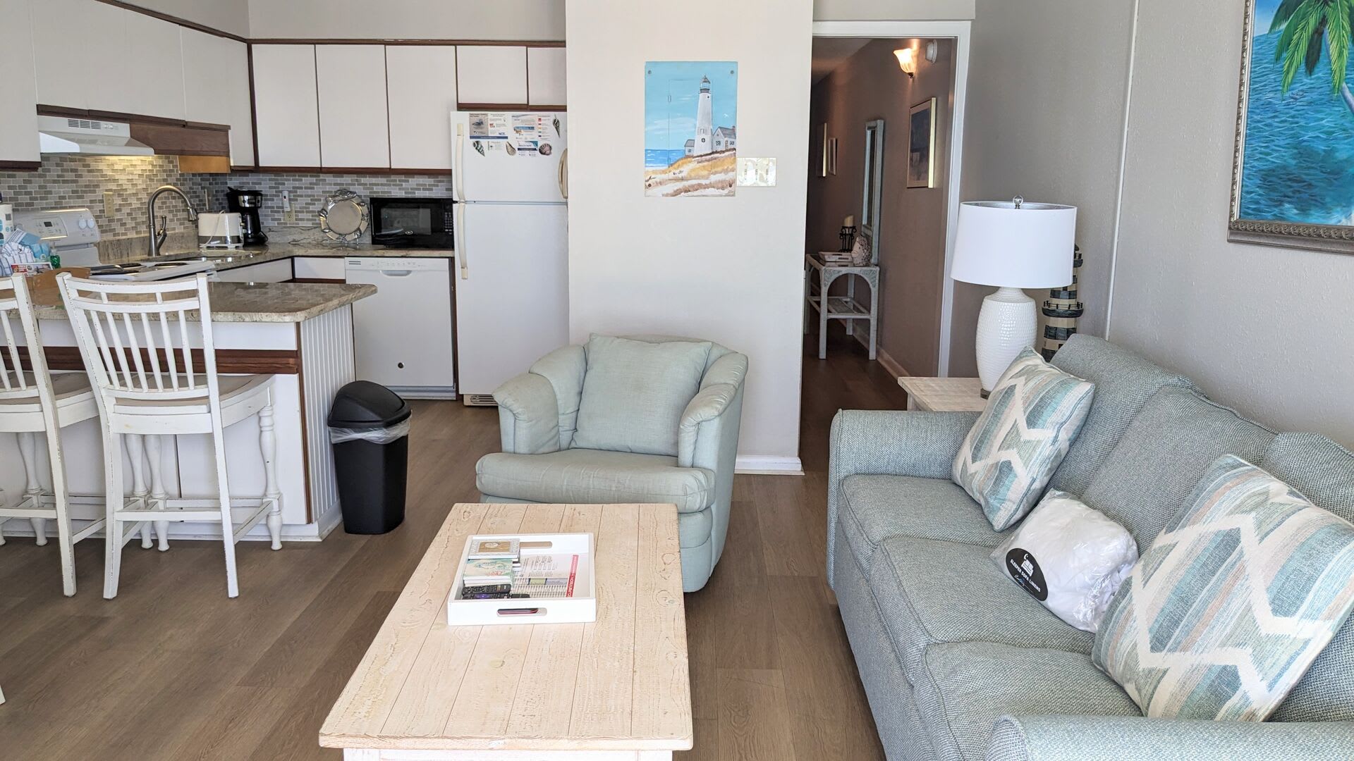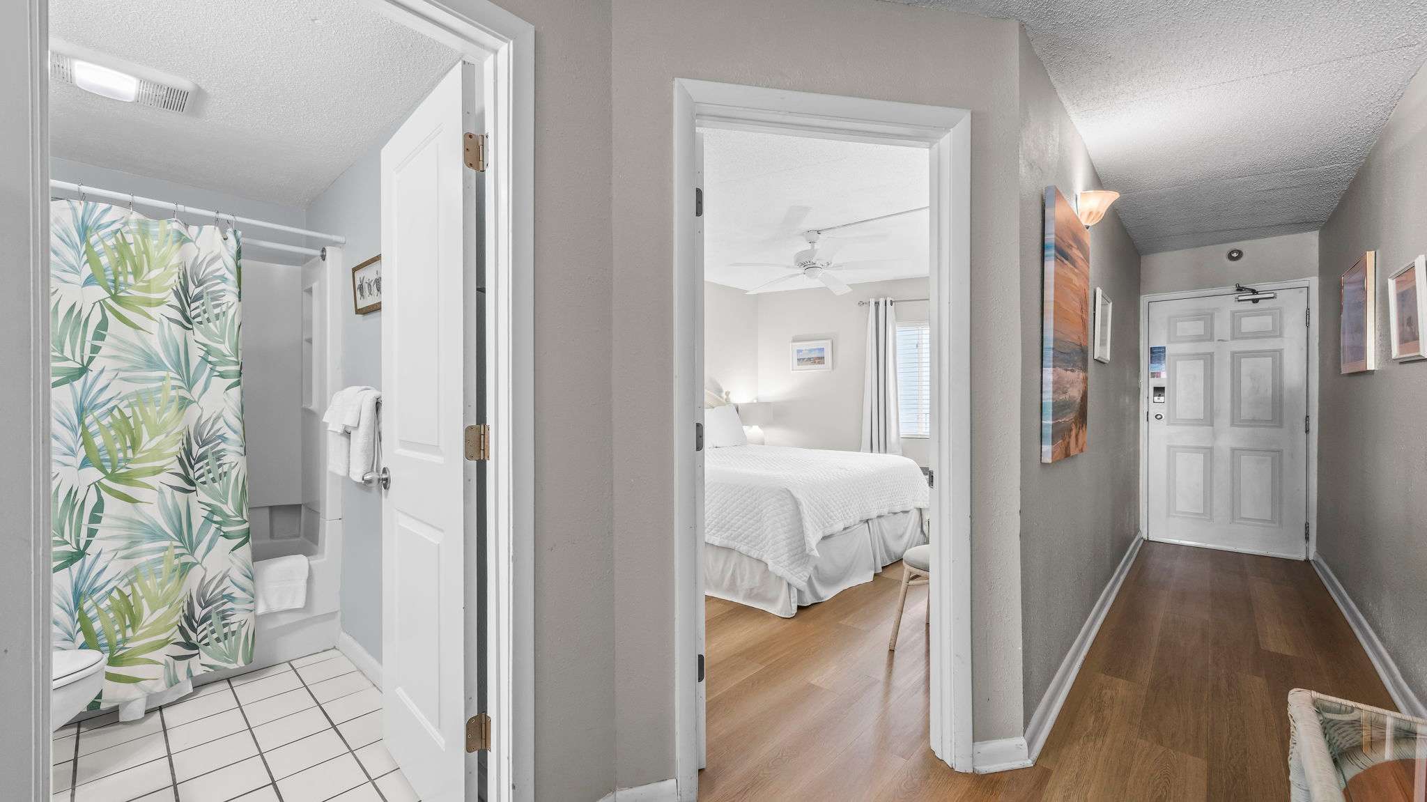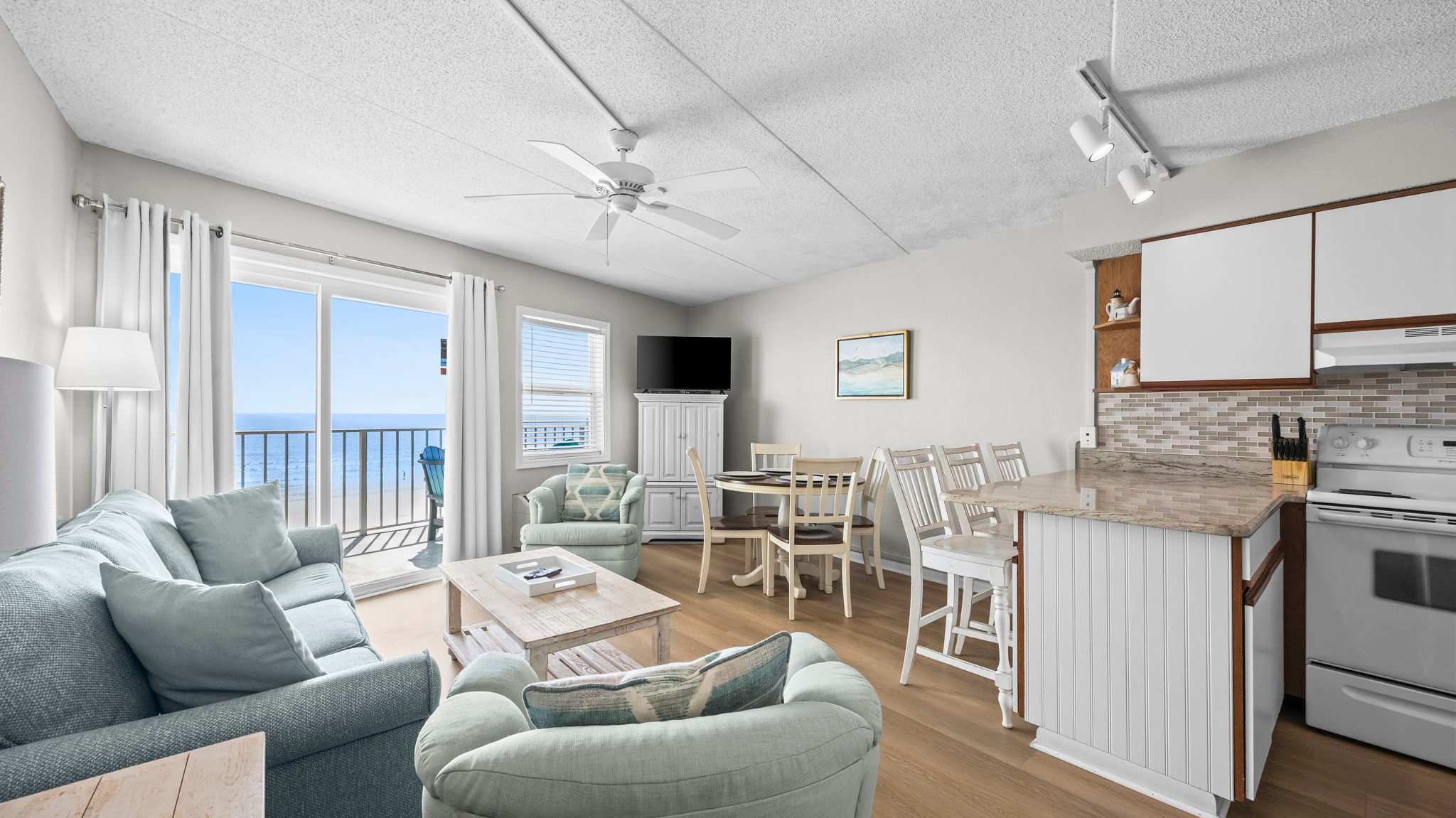 The fully equipped kitchen provides everything you need to prepare meals, from full-sized appliances to cookware and a coffee maker. A dining area and breakfast bar offer plenty of seating to enjoy your meals together. The condo includes one full bathroom and an additional half bath for added convenience. A stacked washer and dryer make it easy to refresh your beach towels after a day in the sun.