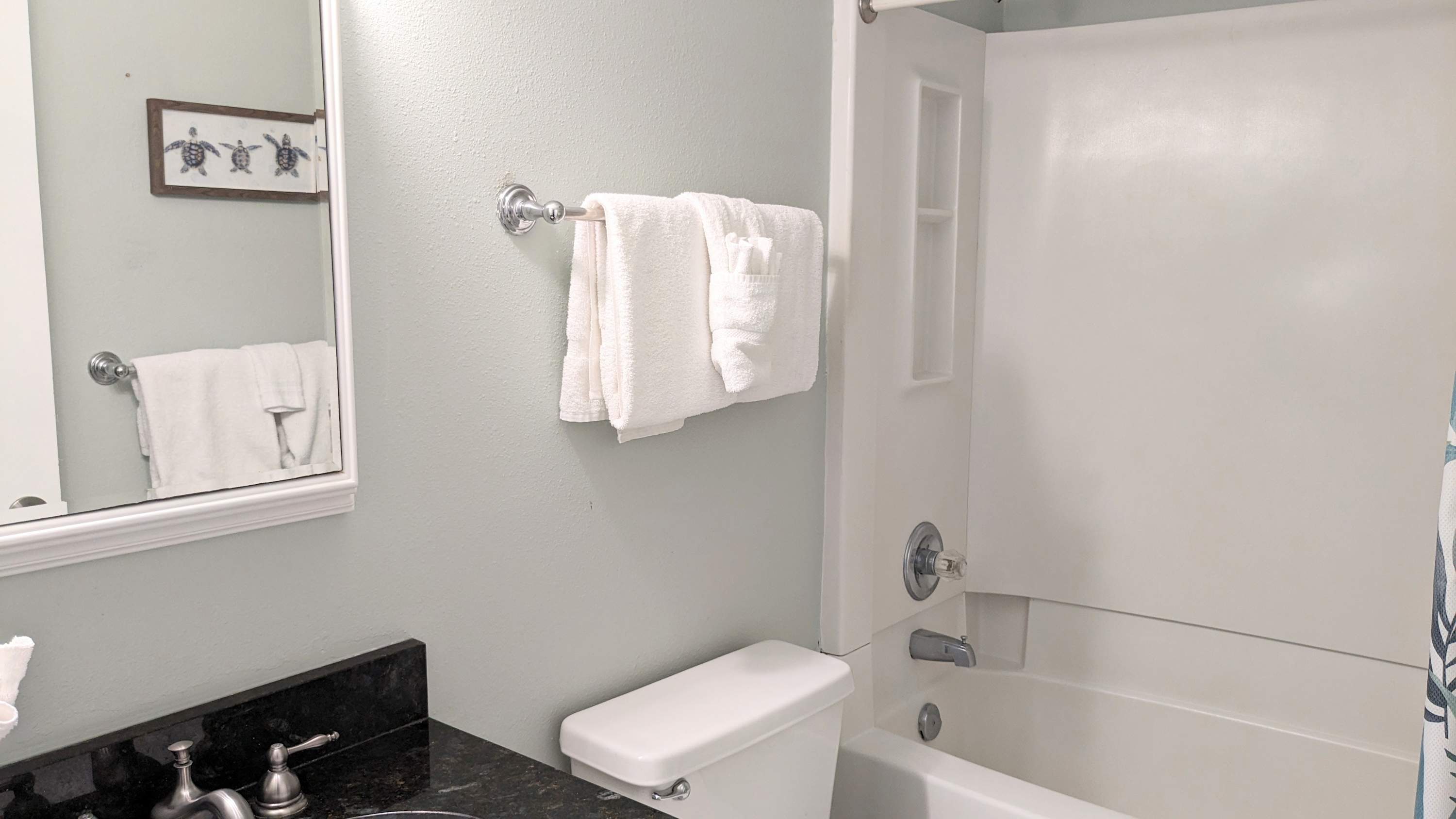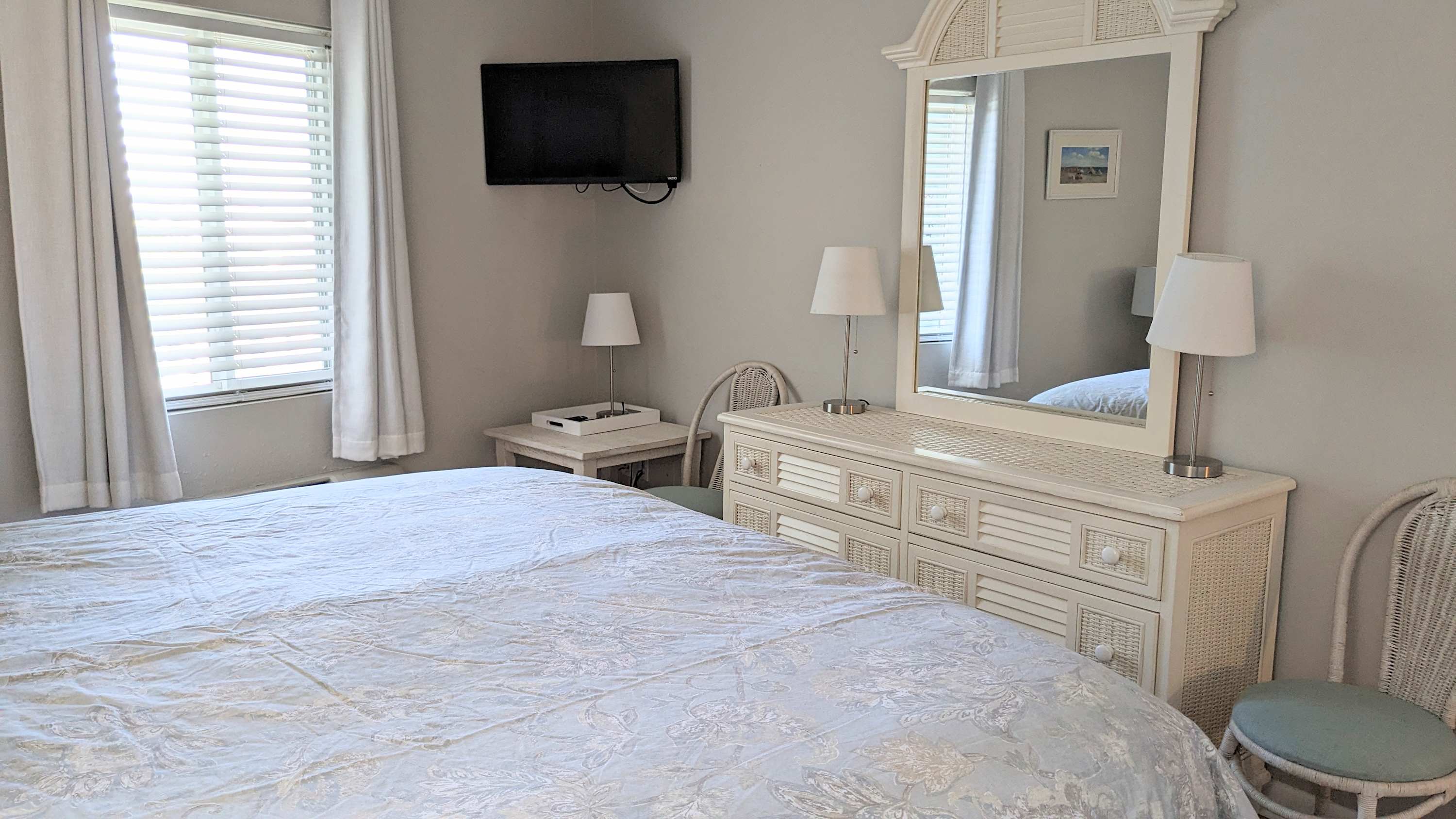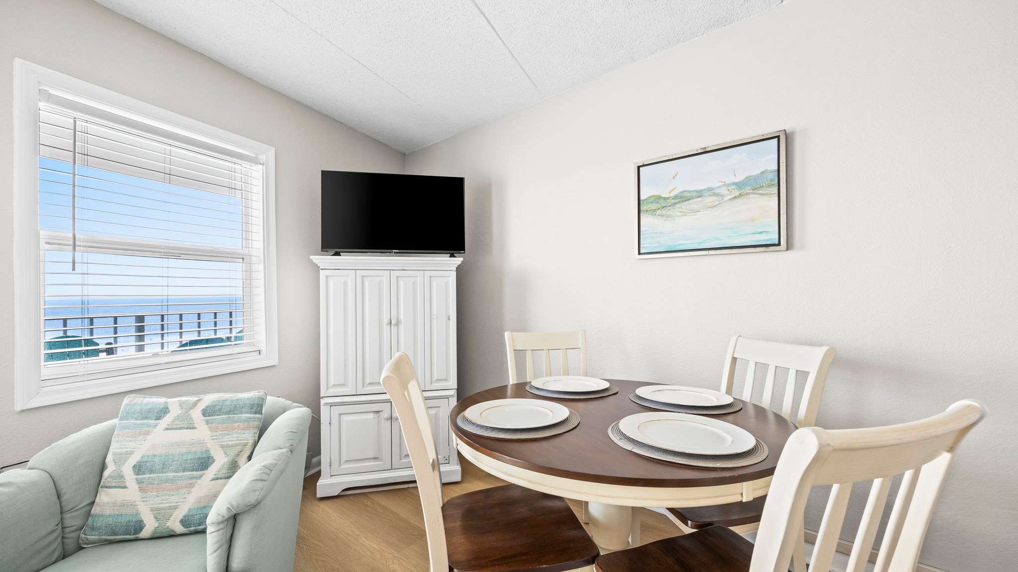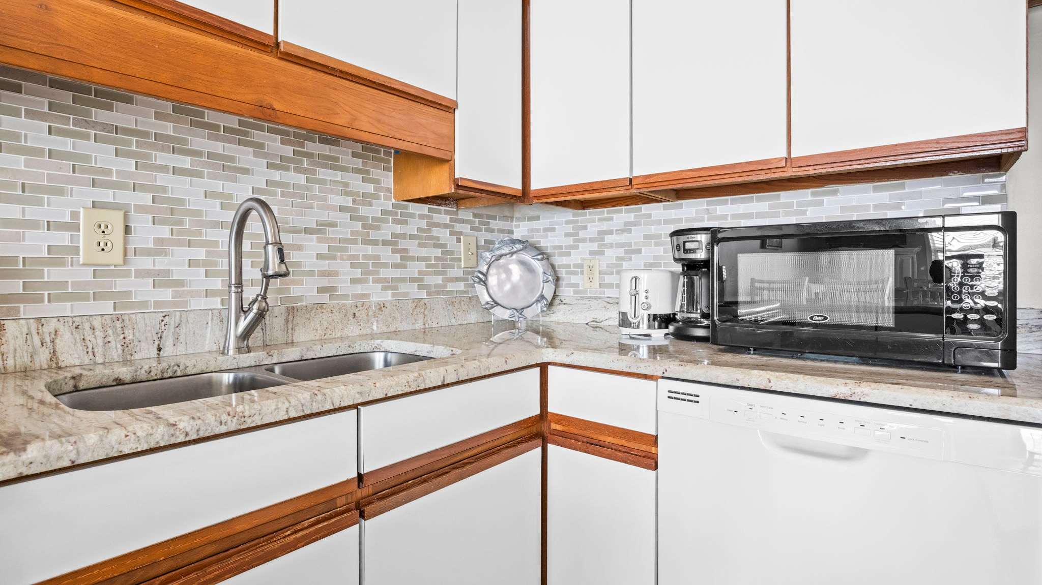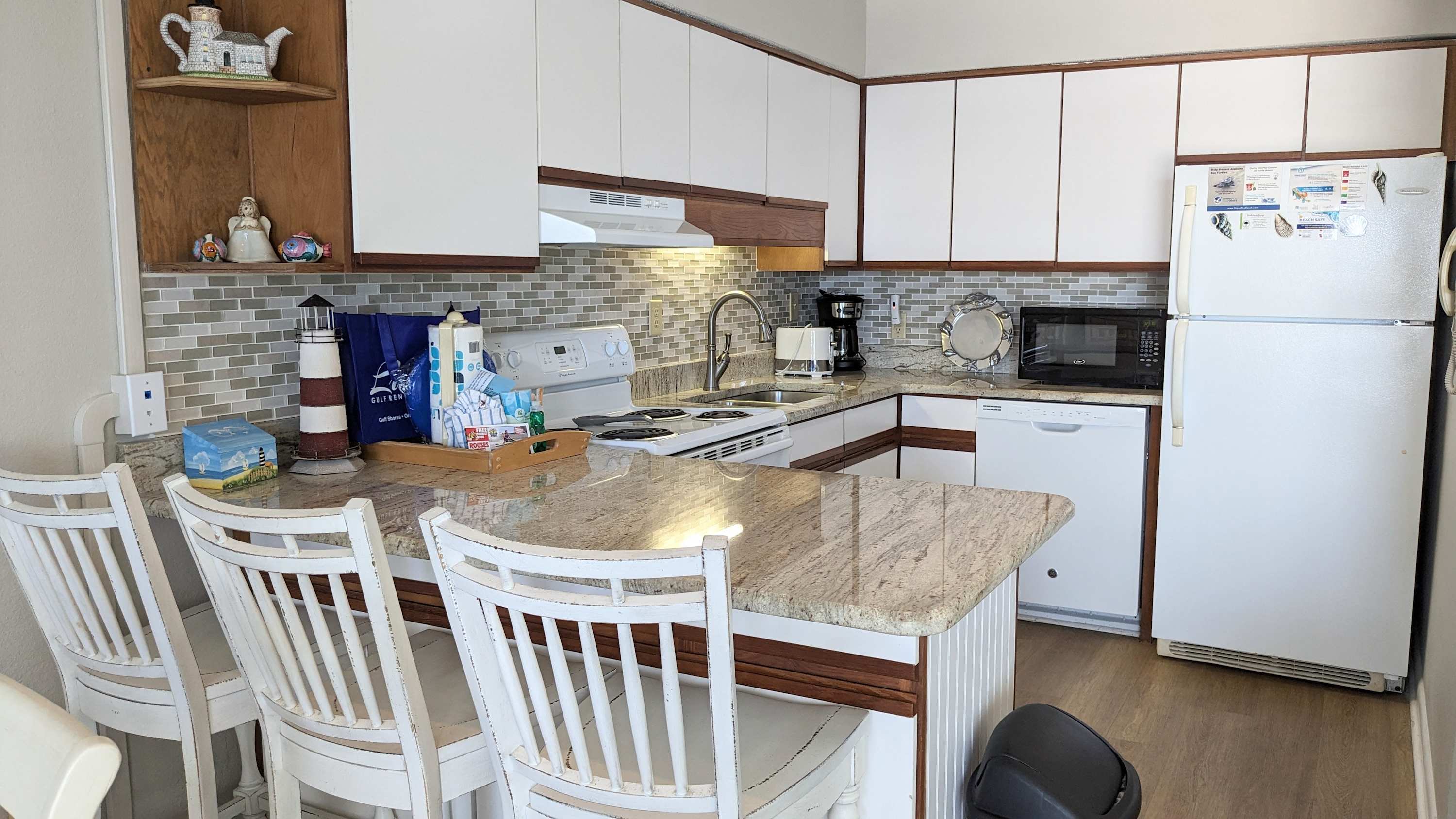 The fully equipped kitchen provides everything you need to prepare meals, from full-sized appliances to cookware and a coffee maker. A dining area and breakfast bar offer plenty of seating to enjoy your meals together. The condo includes one full bathroom and an additional half bath for added convenience. A stacked washer and dryer make it easy to refresh your beach towels after a day in the sun.