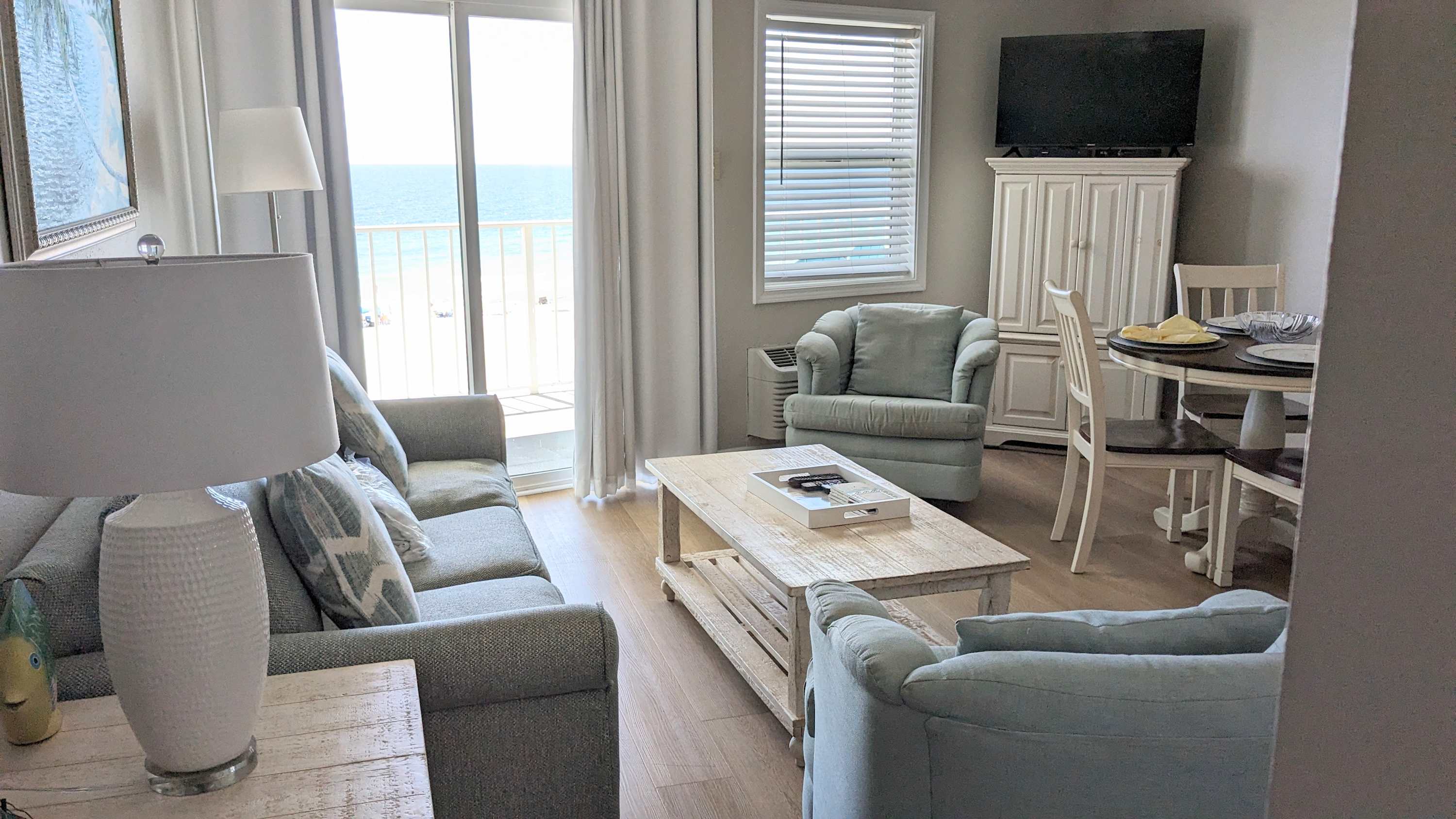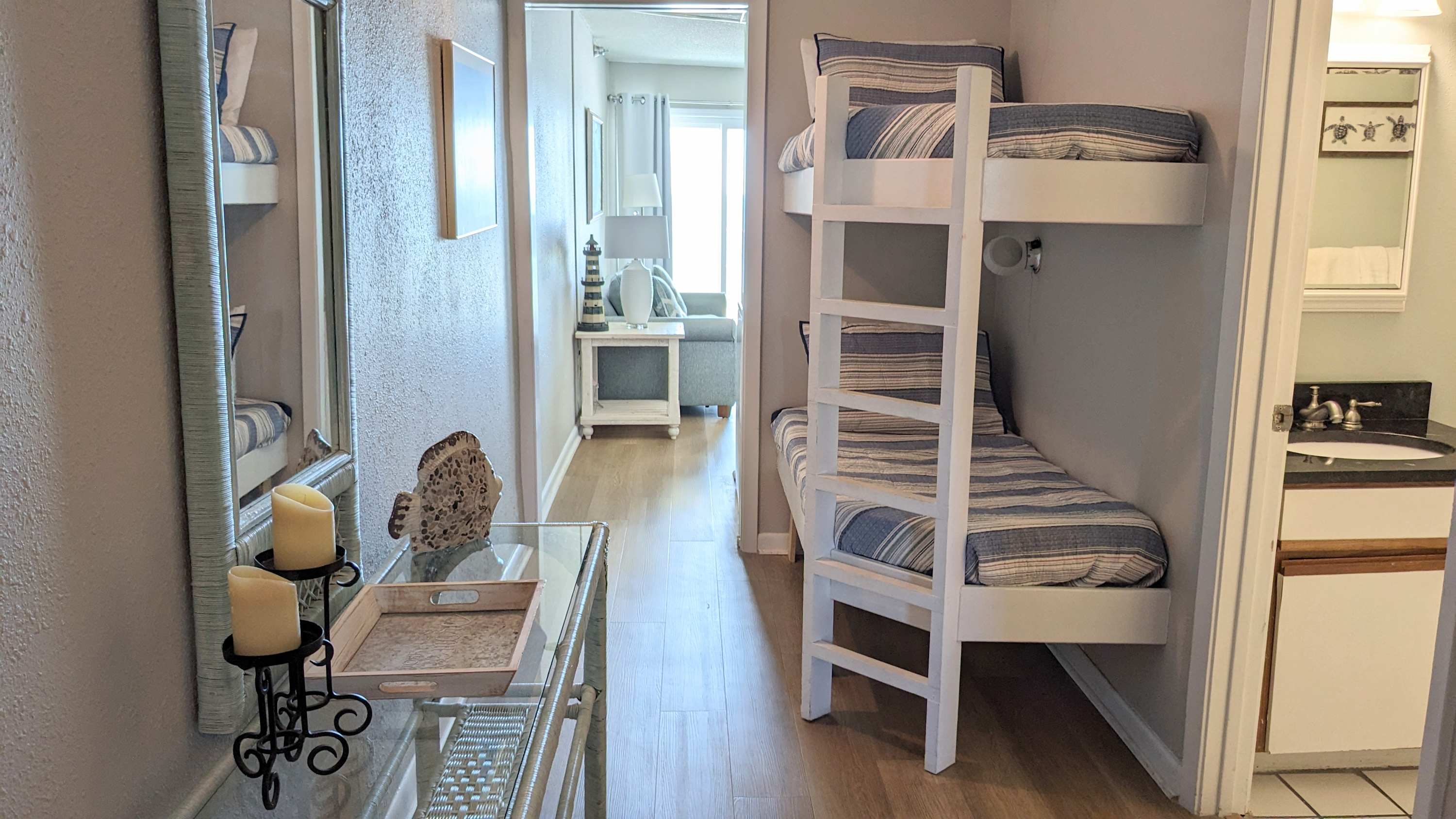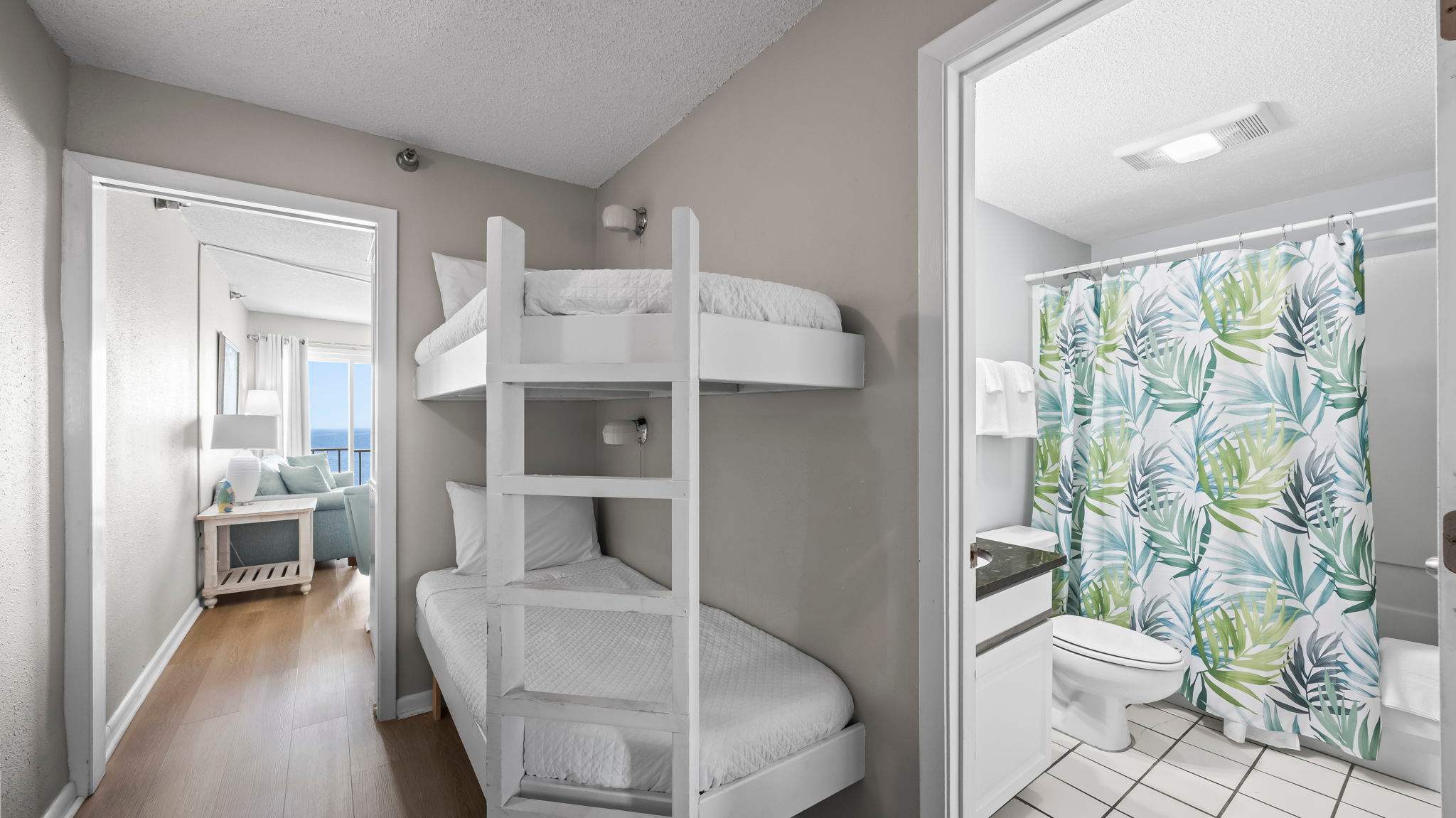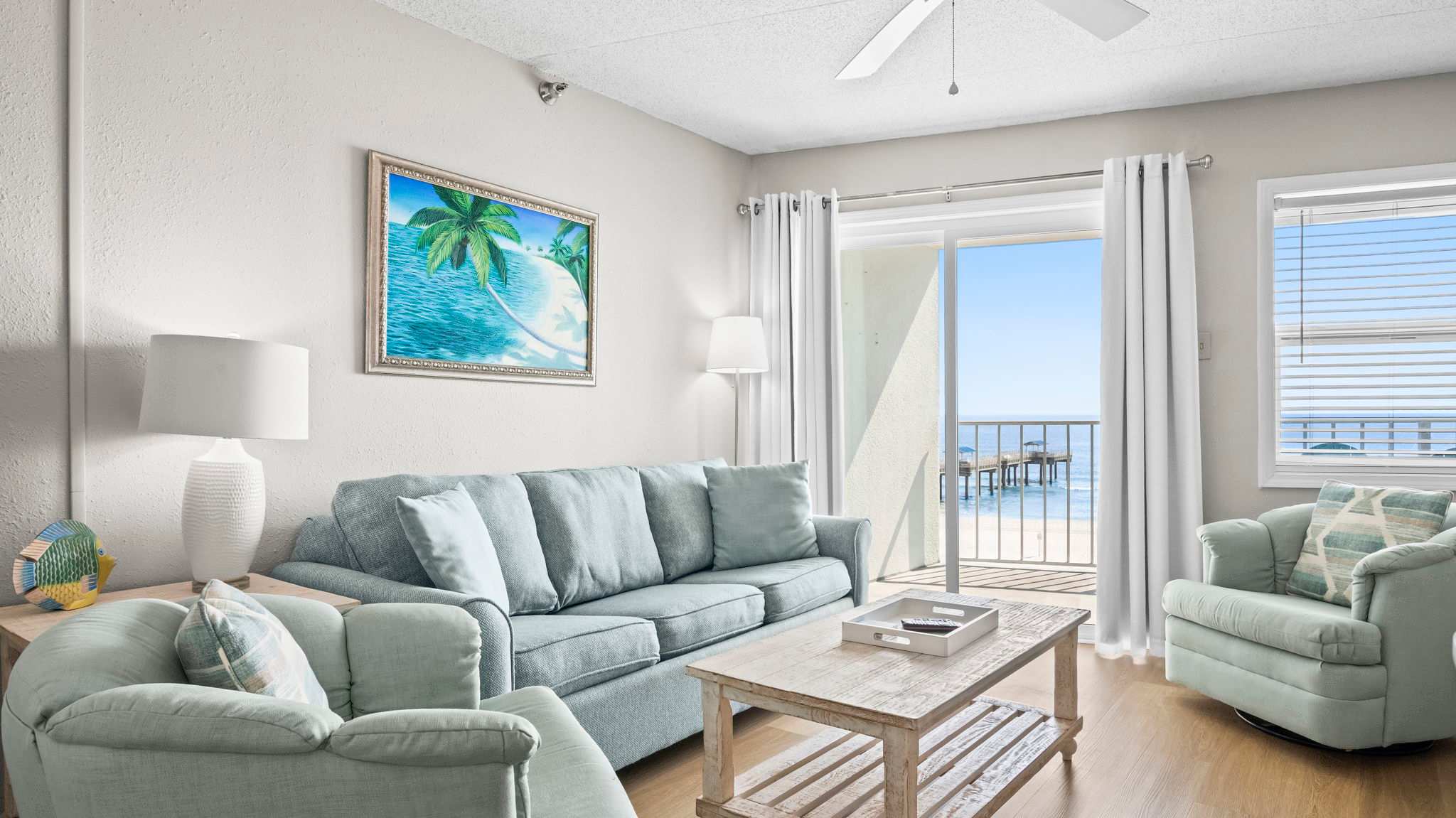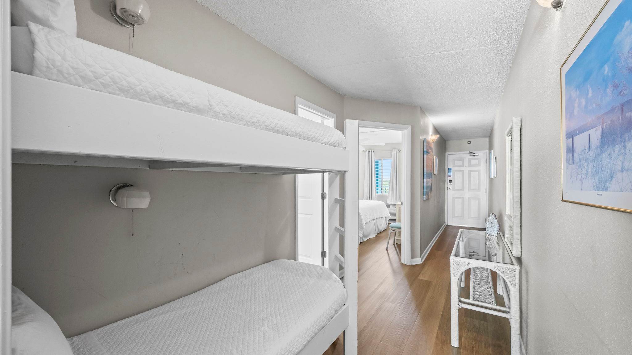 Escape to the ultimate beachfront retreat at Emerald Skye 34 hosted by Current Tides, a cozy Gulf-front condo that delivers laid-back vibes and stunning water views. Wake up to the sound of waves, sip your morning coffee on the private balcony overlooking the emerald waters, and let the salty breeze set the tone for your perfect getaway. This one-bedroom condo with a built-in bunk nook comfortably sleeps up to six guests. The master bedroom features a plush king-sized bed, while the hallway bunks are perfect for little adventurers. A sleeper sofa in the living room adds extra space for friends or family. The bright and airy living area is designed for relaxation, with comfortable seating, a flat-screen TV, and a coastal-chic ambiance that invites you to unwind.