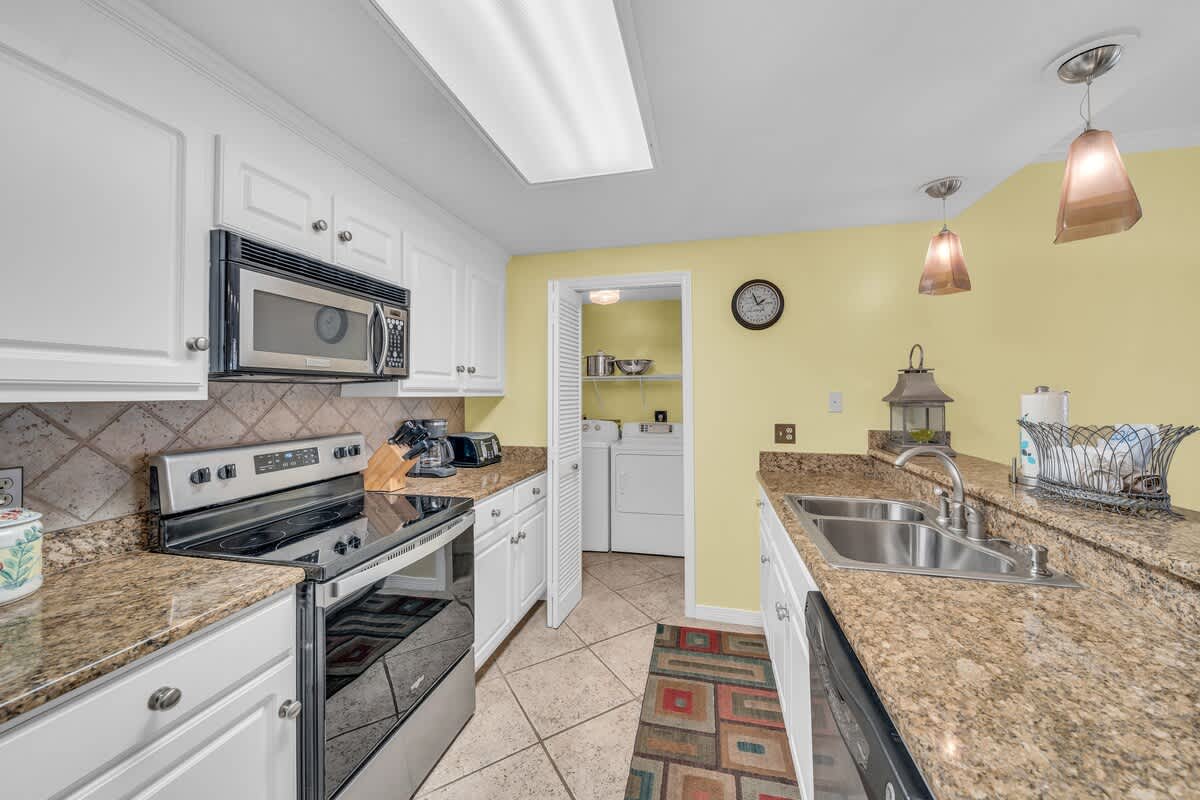 When you’re not out exploring the beach, you’ve got all the comforts of home here: flat-screen TVs in the living room and bedrooms, free WiFi to keep you connected, a Keurig and traditional coffee pot for morning pick-me-ups, a wet bar with an ice maker for cocktail hour, and a washer and dryer to keep those beach towels fresh.