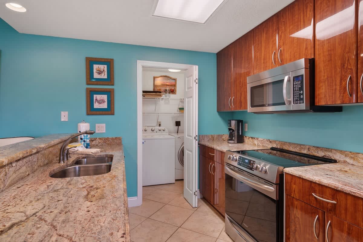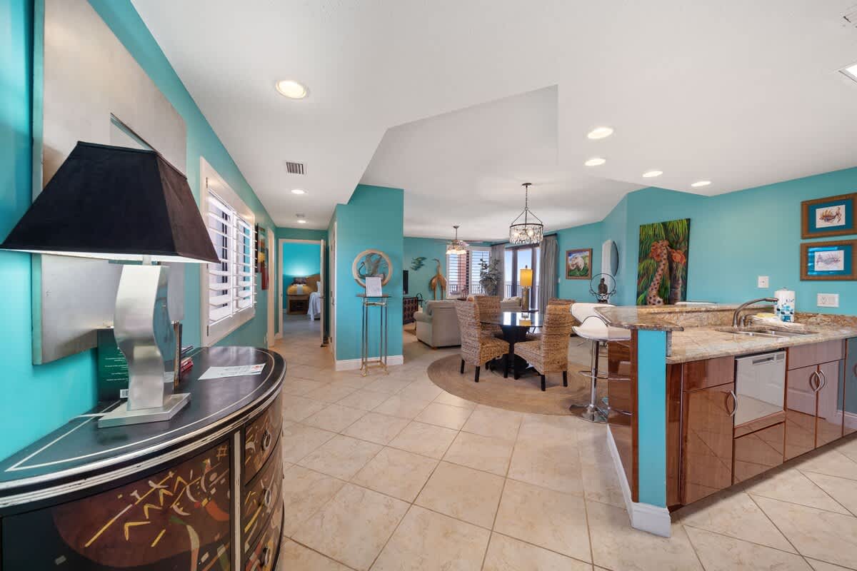 Step into this bright, colorful condo that’s bursting with tropical vibes and a fun, artistic flair! Perfect for eclectic souls, this Gulf-front getaway brings the colors of the Gulf indoors with vibrant decor and breezy coastal energy. The open-concept kitchen, dining, and living area is made for relaxing and reconnecting. With beautiful countertops, stainless steel appliances, and a fully stocked kitchen, you’ll have everything you need for easy meals. The breakfast bar adds extra space for families, making it a perfect spot for morning coffee or quick bites.