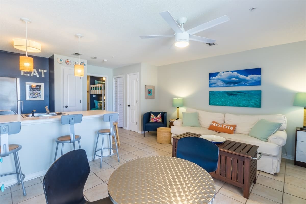 The open living and dining area is all about comfort, featuring a table for four and extra seating for three at the kitchen bar—perfect for beach-day breakfasts and sunset snacks. The fully stocked kitchen has everything you need to whip up delicious meals, from coffee in the morning to seafood feasts at night!