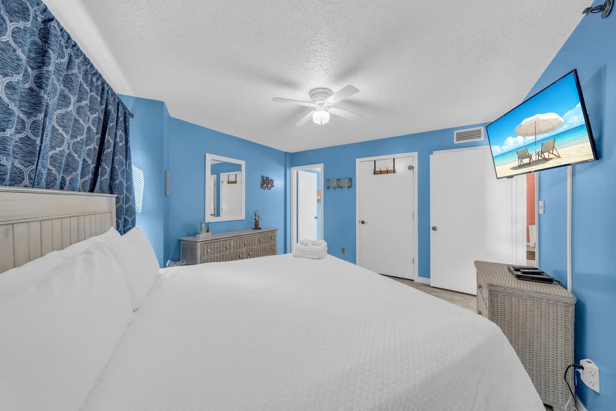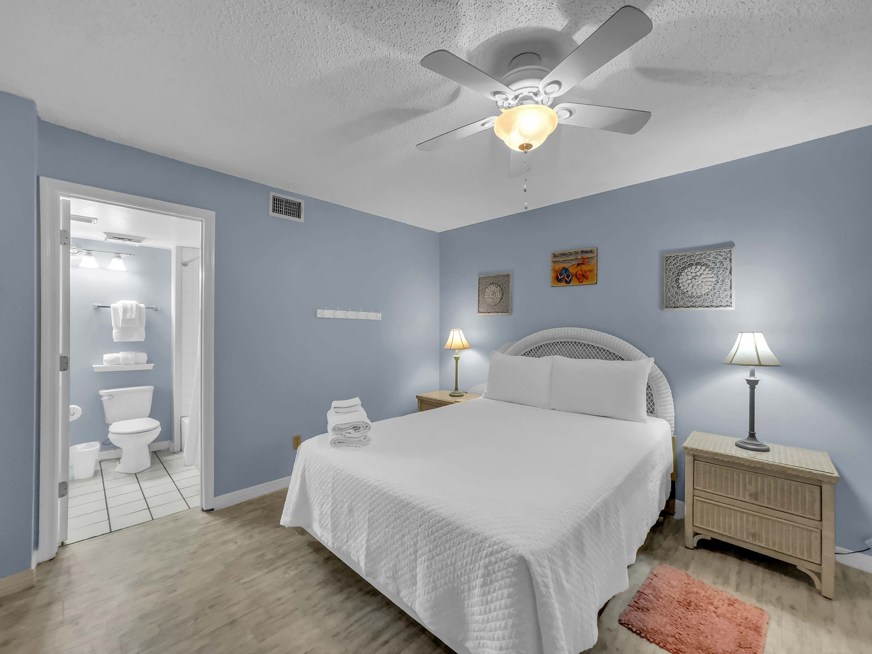 The primary bedroom features a king-size bed and attached bathroom for added privacy, while the second bedroom includes a queen bed, with a single sleeper sofa making this an excellent setup for couples, families, or small groups. Two full bathrooms provide convenience for all guests.
