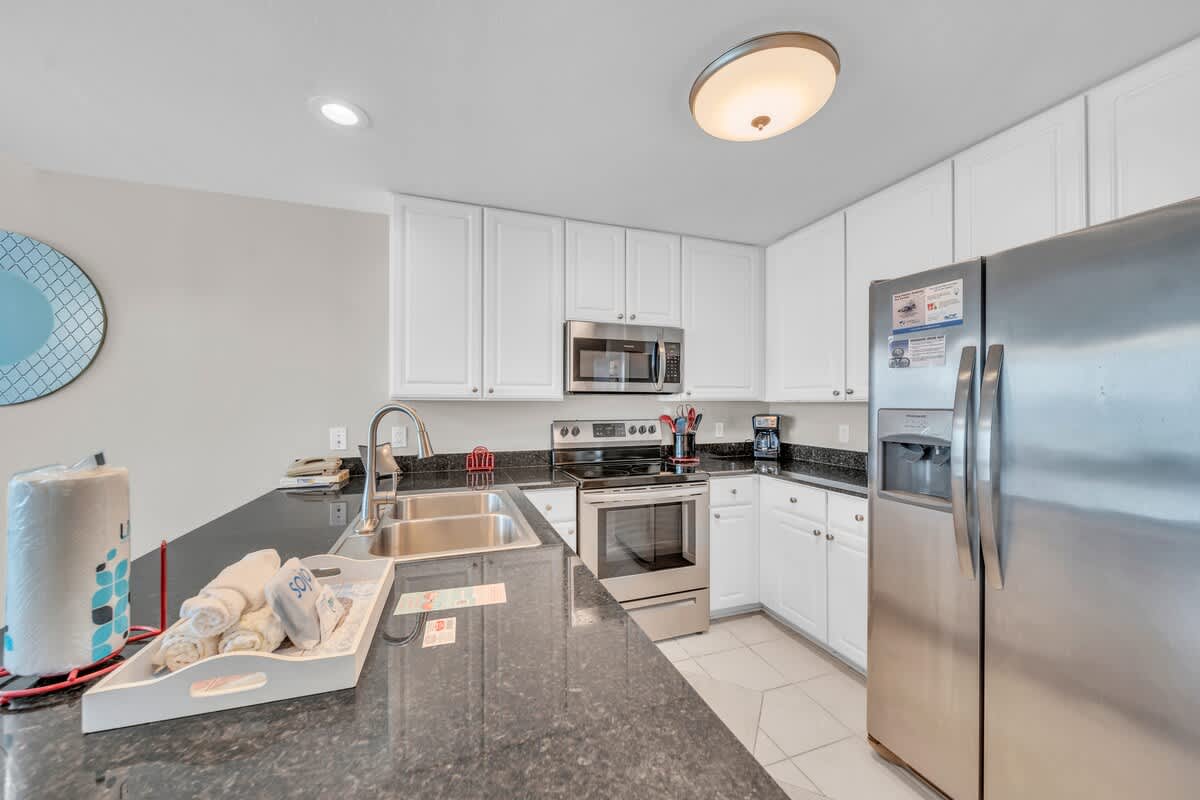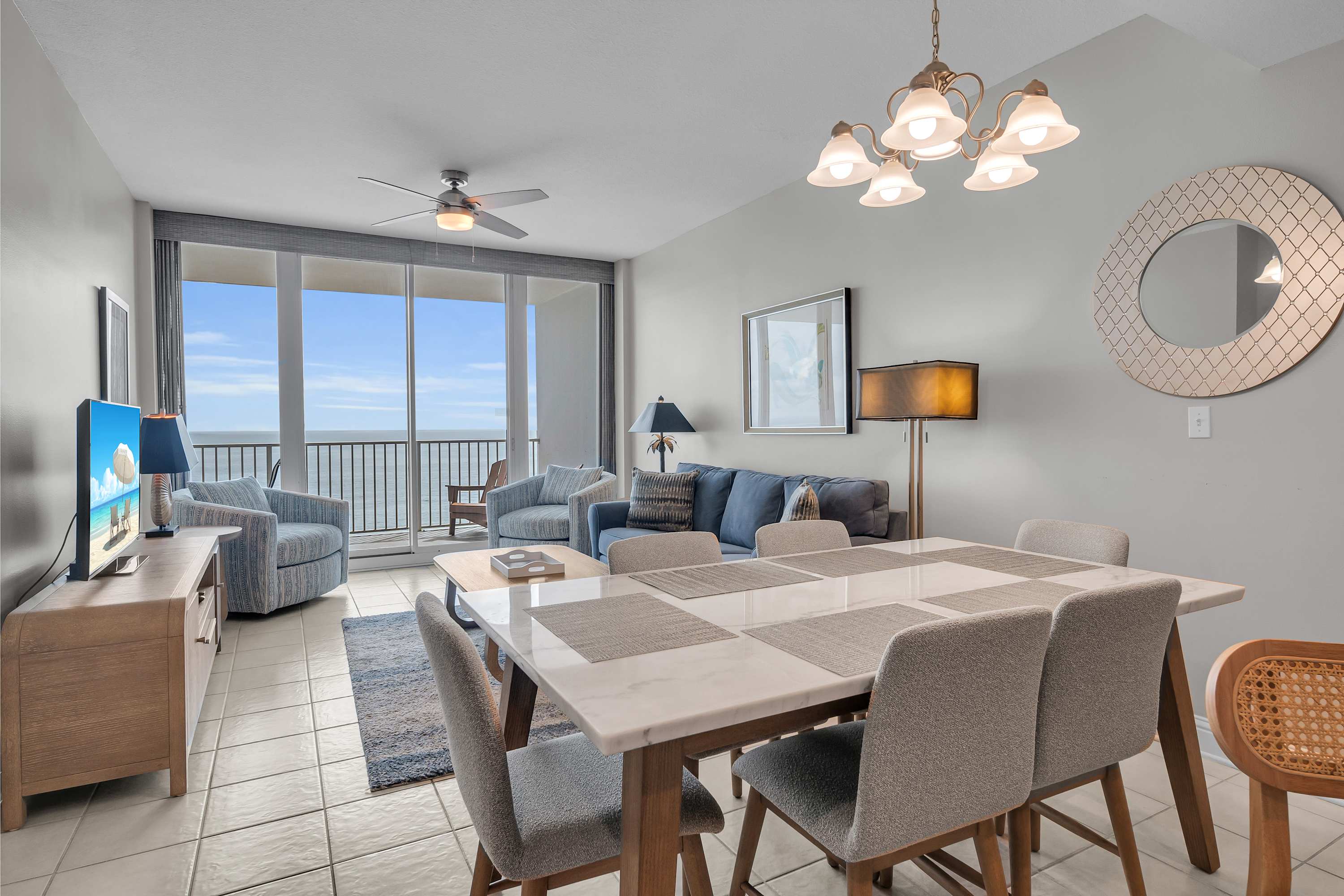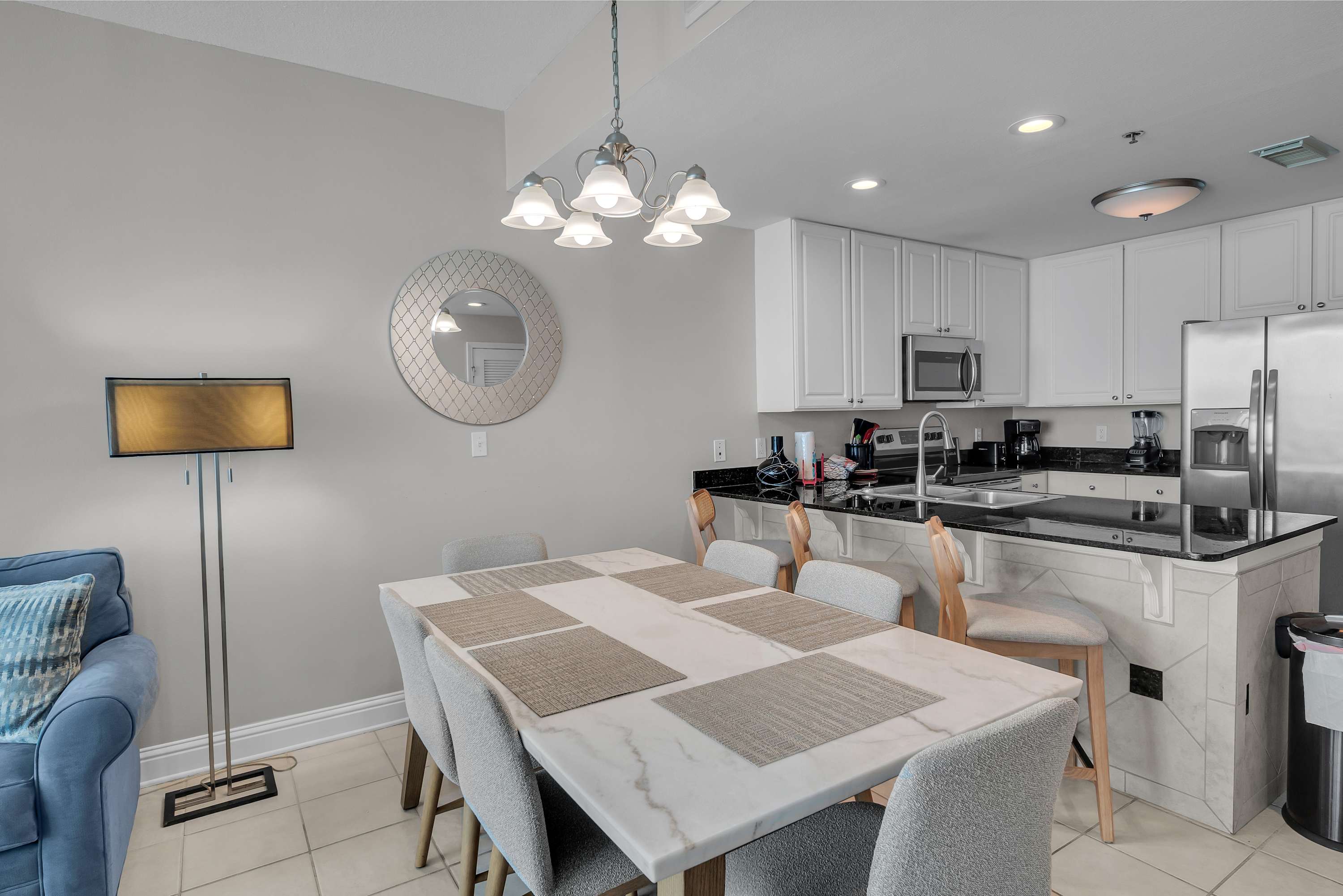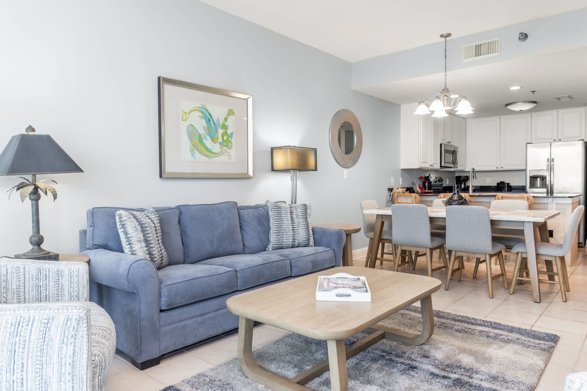 Inside, the open layout keeps things breezy, so you can feel the Gulf air even in the kitchen! Speaking of the kitchen—it’s modern, fully stocked, and ready for whipping up beach snacks or fresh seafood feasts. A dining table for six and a breakfast bar for three means plenty of space for the whole crew.