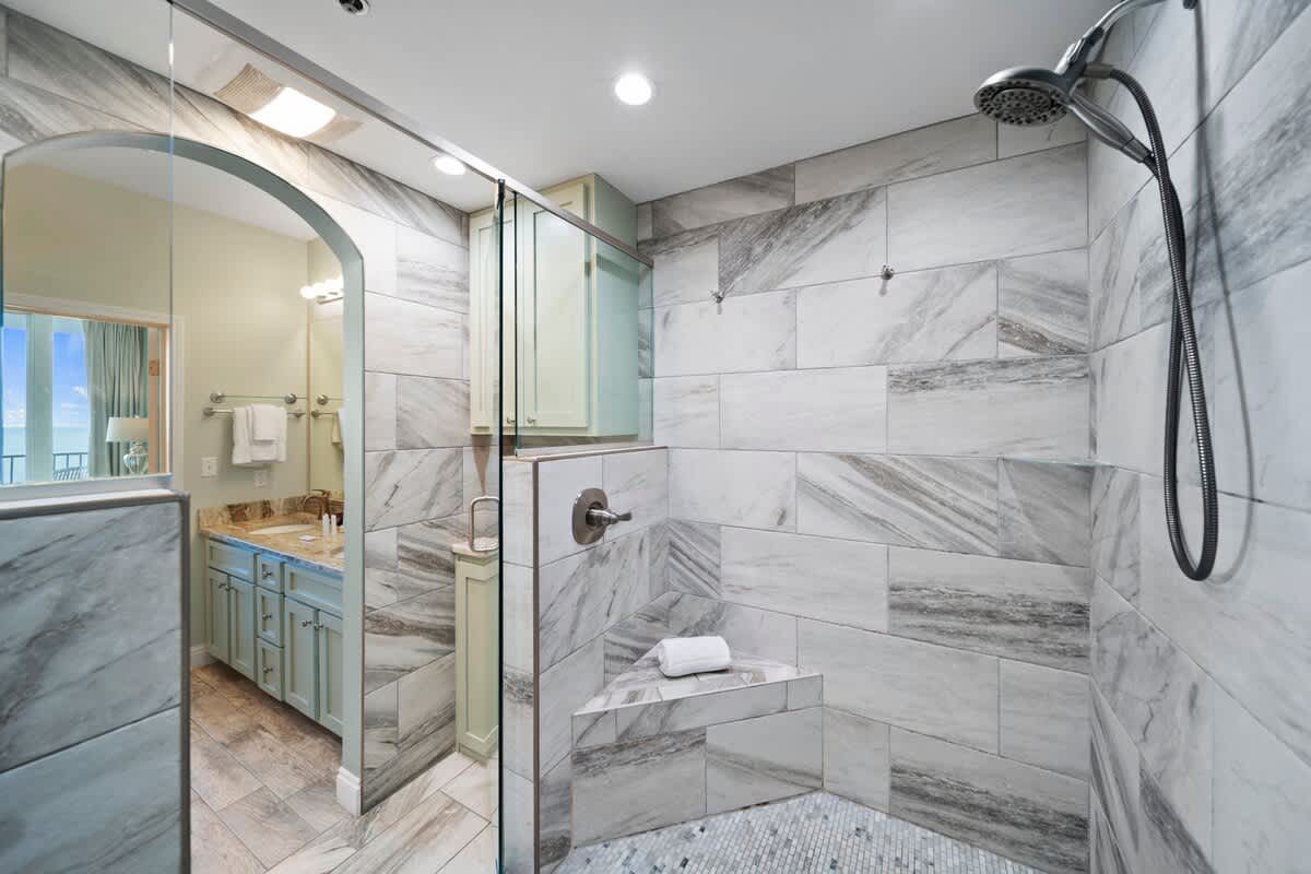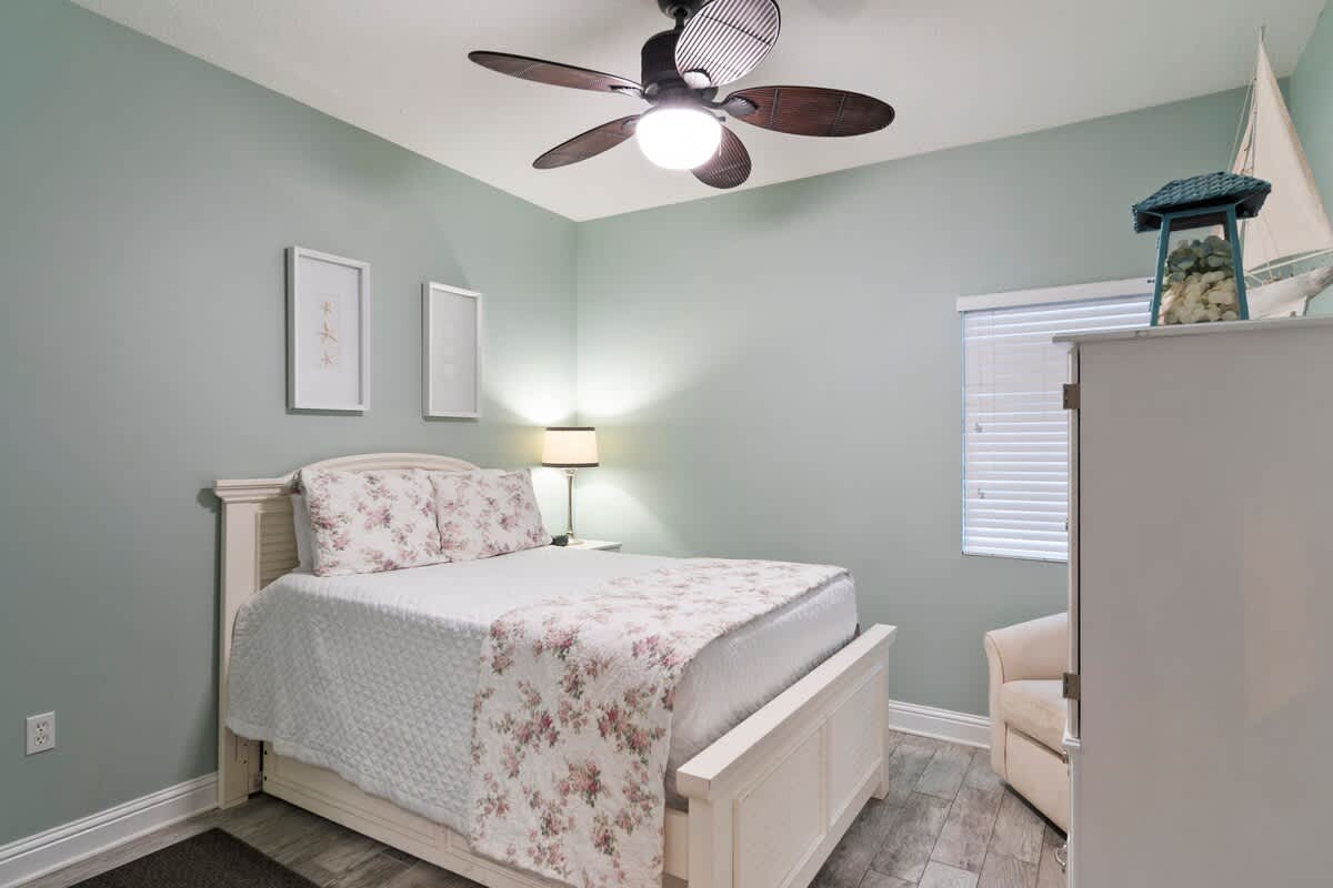 The primary suite is pure coastal luxury, boasting a king-sized bed with breathtaking Gulf views and direct balcony access. Attached is the newly remodeled ensuite, featuring a full walk-in tiled shower that’s as spa-worthy as it is stylish. The guest bedroom offers a Double/Full bed with a convenient trundle, while a cozy built-in bunk room is perfect for extra guests.