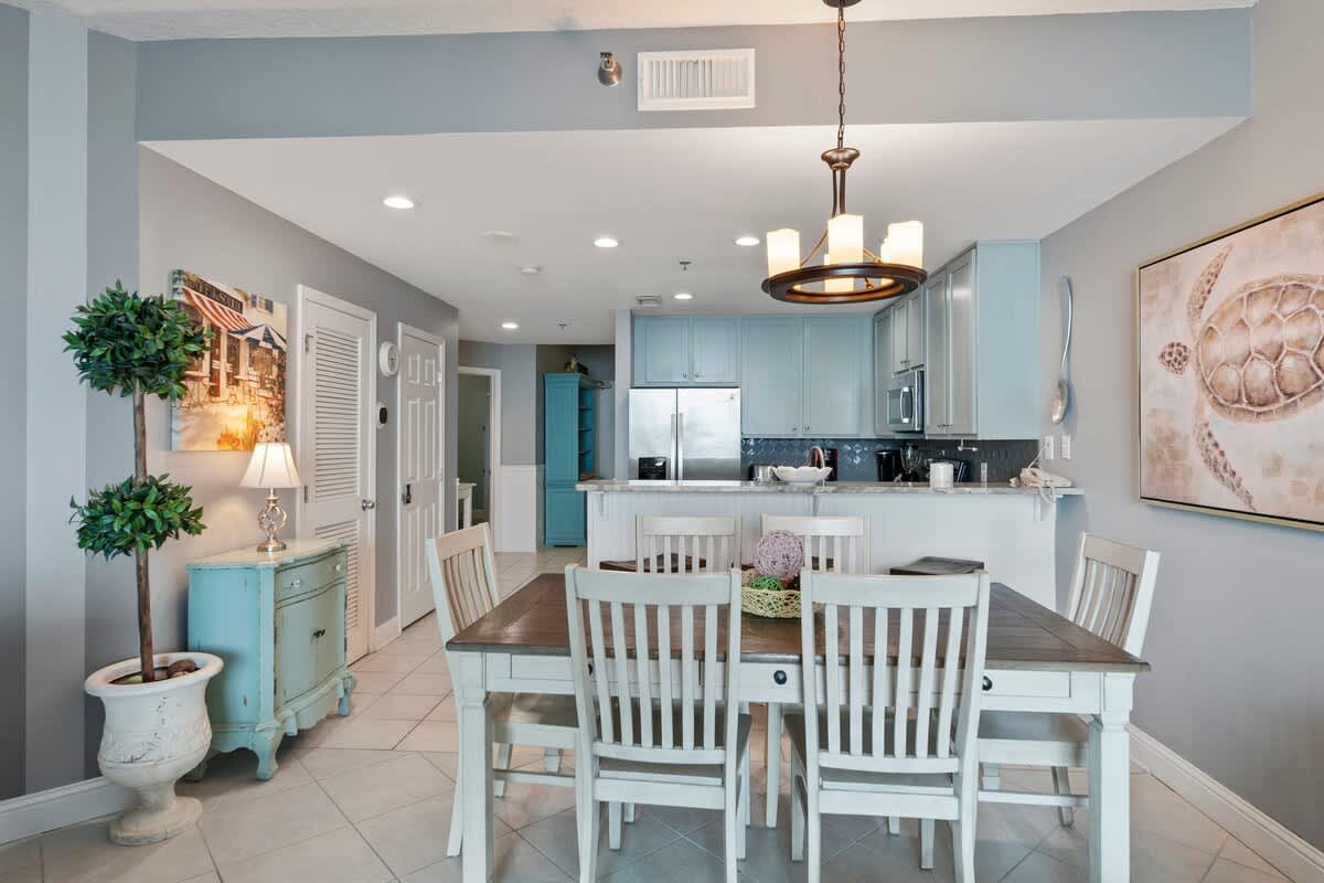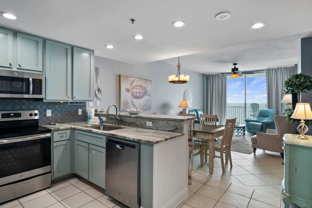 Inside, the open-concept design flows effortlessly, painted in soft blues and greens that bring the Gulf’s tranquil waters inside. The spacious living area is designed for both comfort and style, with plush seating, a large smart TV, and stunning views that make it easy to kick back after a long day in the sun. The dining space is equally inviting, offering a table with seating for six, plus an additional three seats at the granite-topped counter—perfect for laid-back meals or a morning coffee with ocean views.