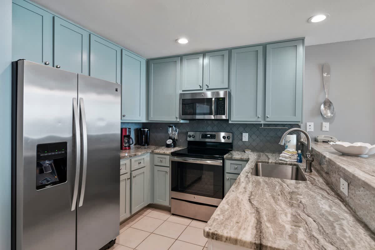 The kitchen is a dream, featuring custom solid wood cabinetry, sleek granite countertops, and a gorgeous tile backsplash. Whether you’re whipping up a fresh seafood feast or grabbing snacks between beach trips, this space has everything you need to make it easy and enjoyable.