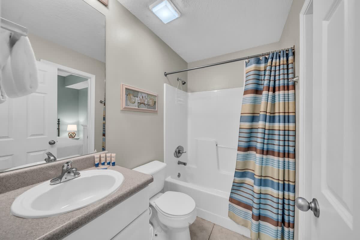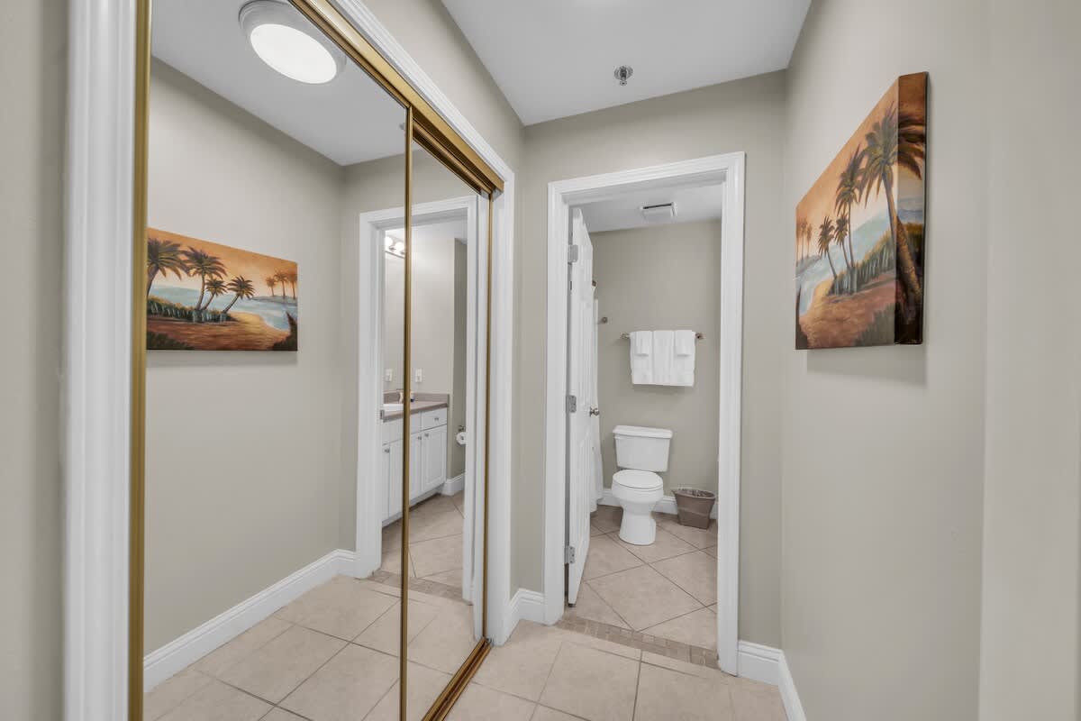 The first guest bedroom is a cozy retreat with a queen bed, a flat-screen TV, and its own private bath. The second guest bedroom also has a queen bed and a TV, with an attached bathroom that conveniently opens to both the bedroom and hallway for easy access.