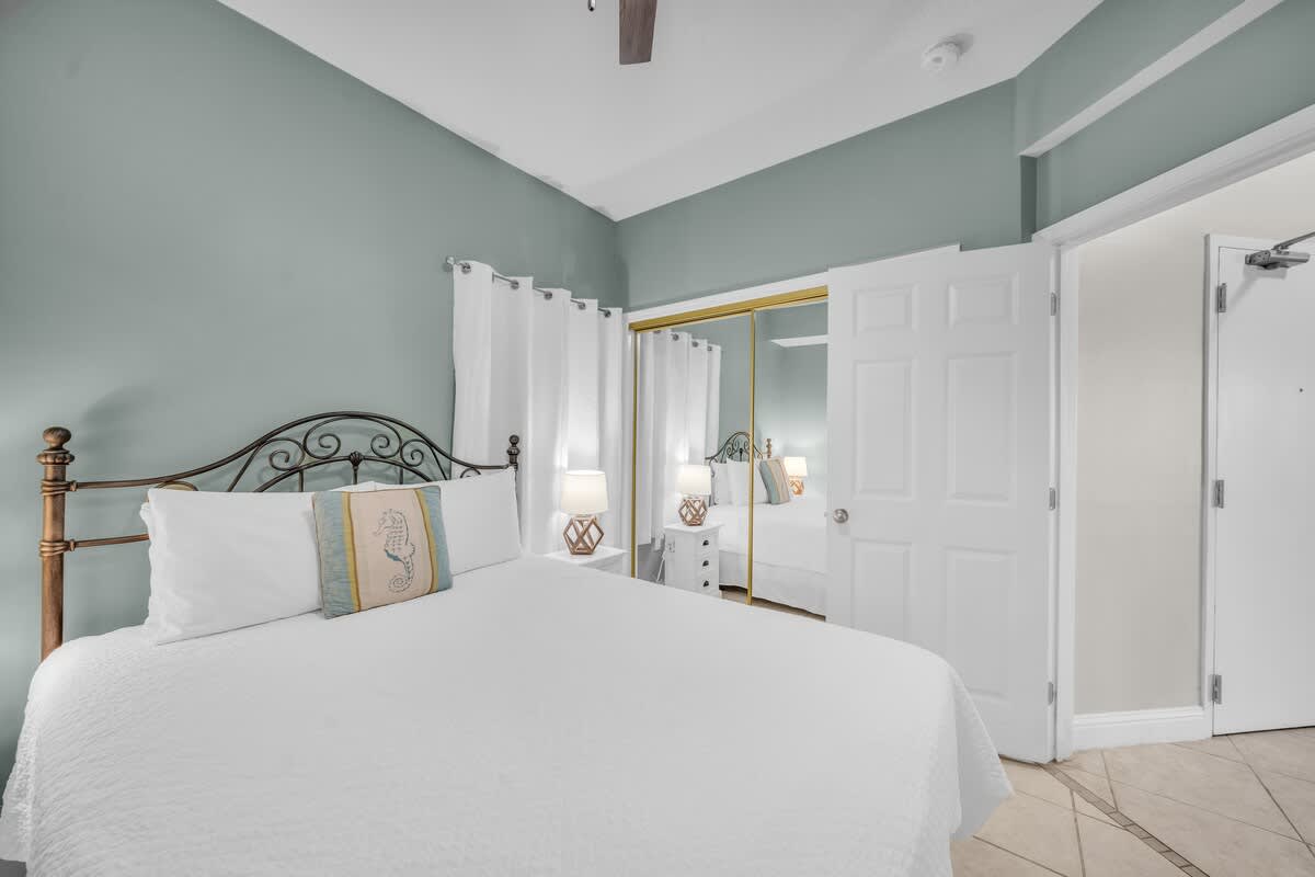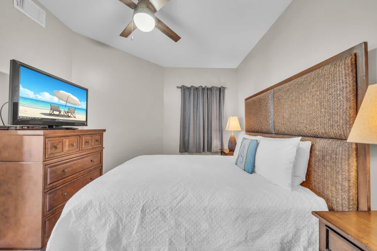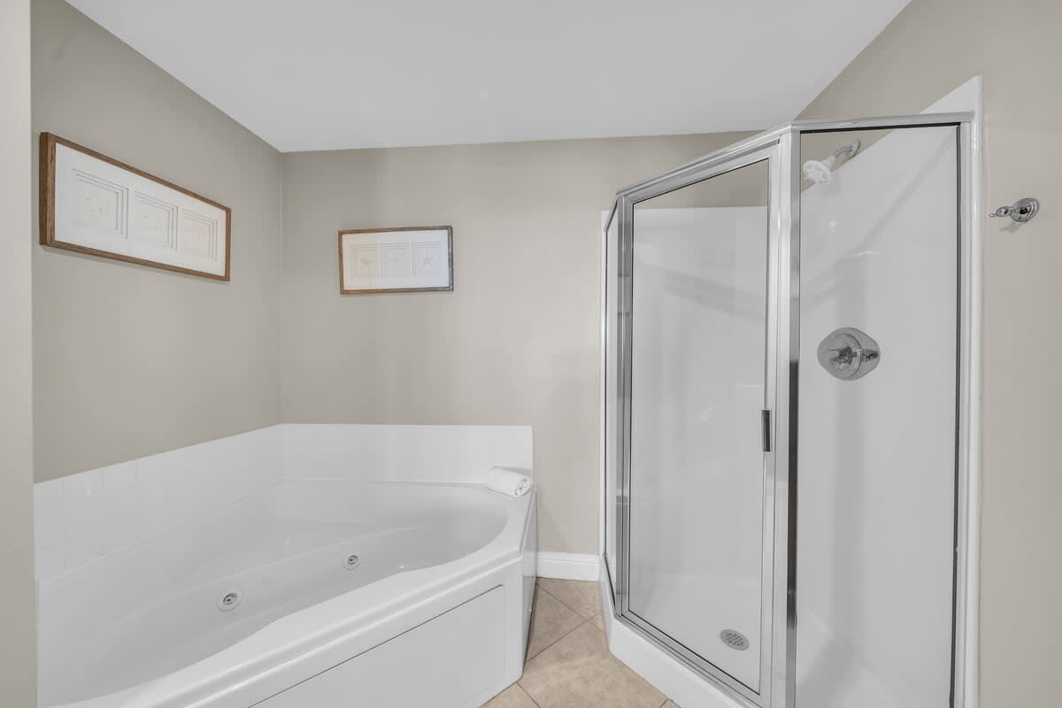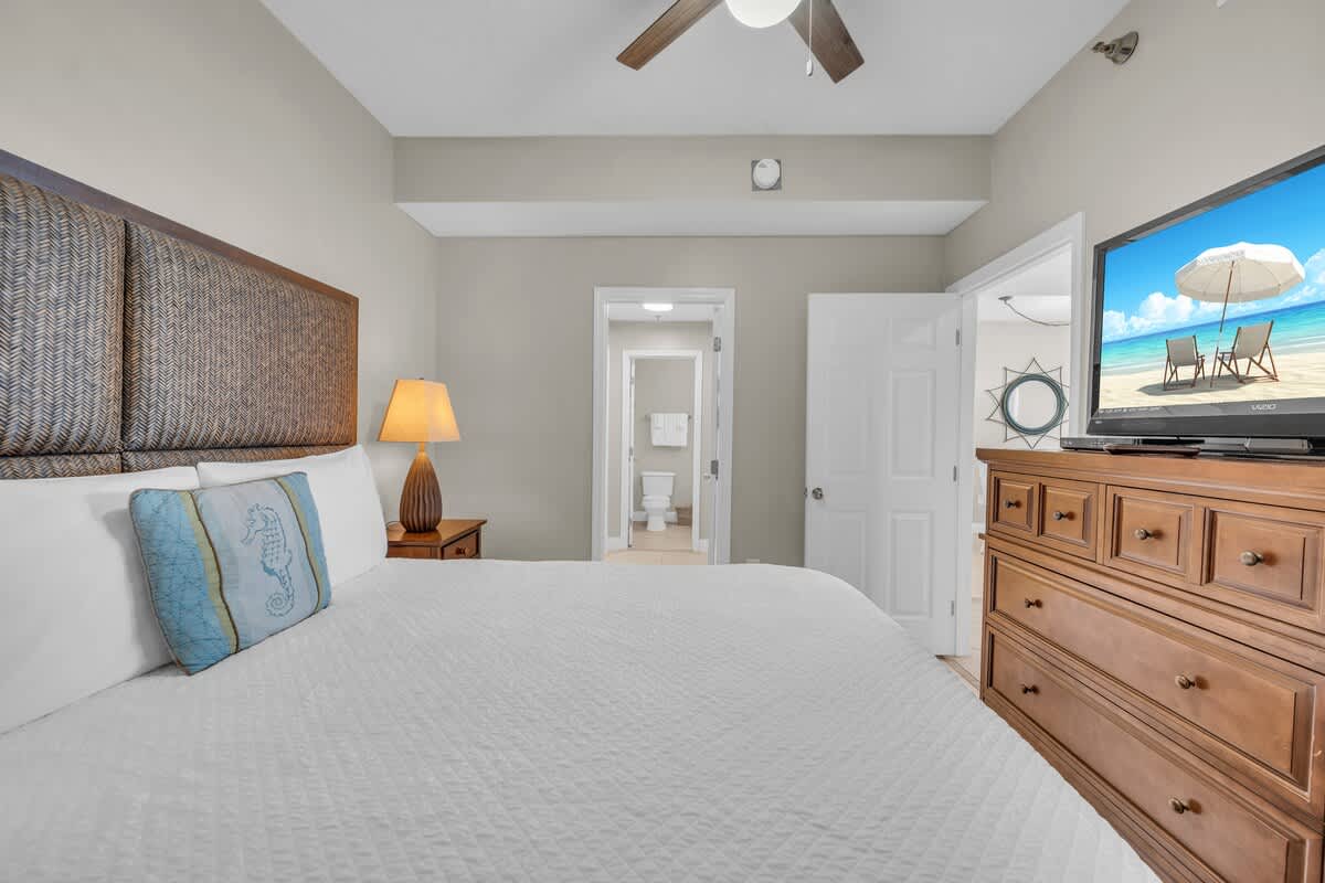 The master suite is pure paradise, featuring a plush king bed, a Smart TV, and private access to the balcony. The en-suite bath boasts double sinks, a walk-in closet, a deep soaking tub, and a separate glass-enclosed shower—because luxury is a must on vacation!