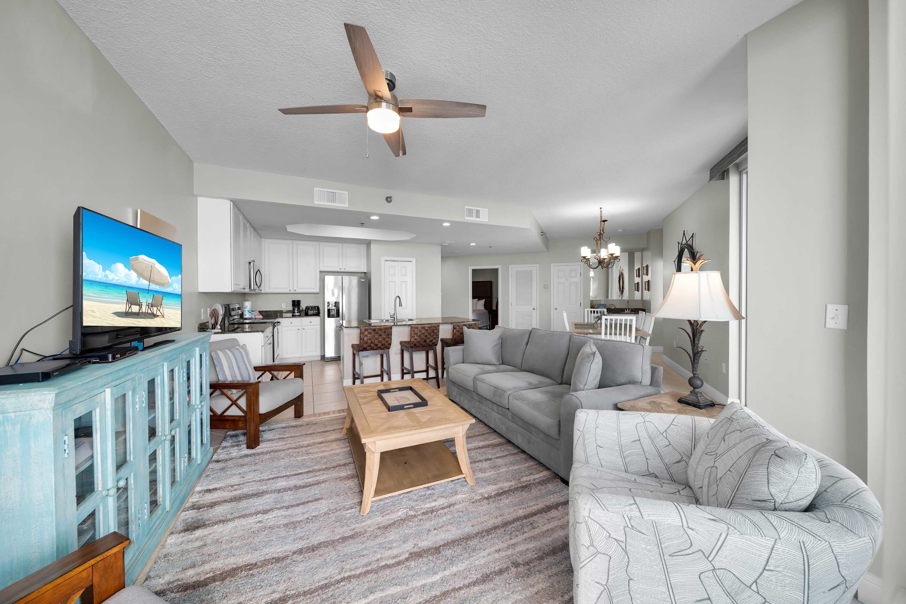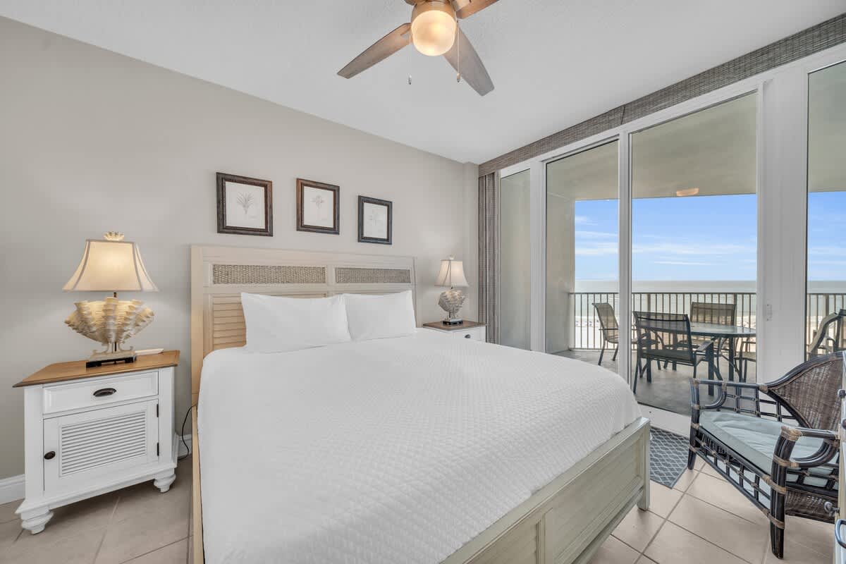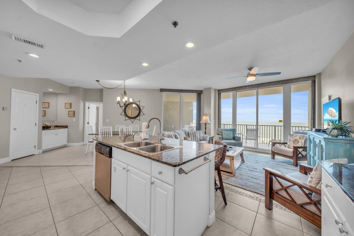 The living and dining areas flow right onto a massive balcony, giving you front-row seats to sugar-white sands and endless Gulf views. With floor-to-ceiling windows and sliding glass doors, the beach feels like part of your living room! Decked out in stylish coastal décor, this spot is designed for ultimate relaxation.