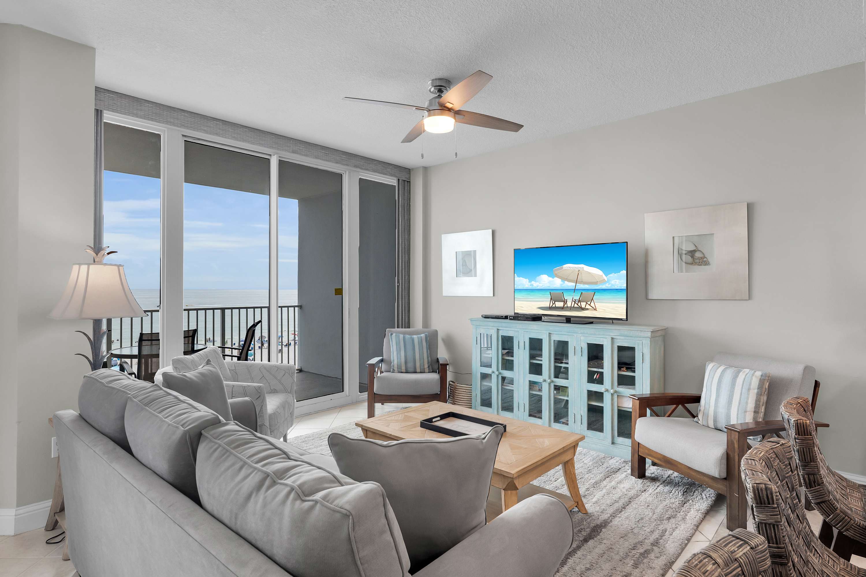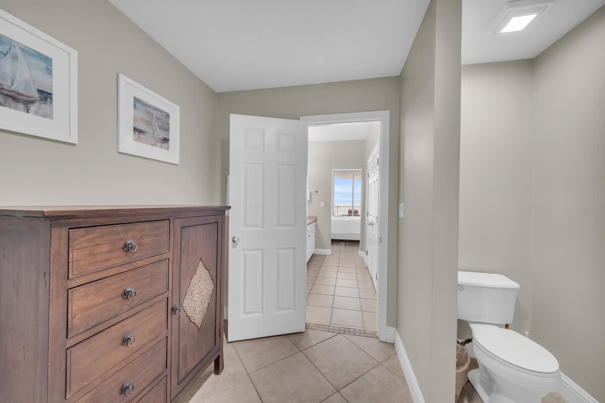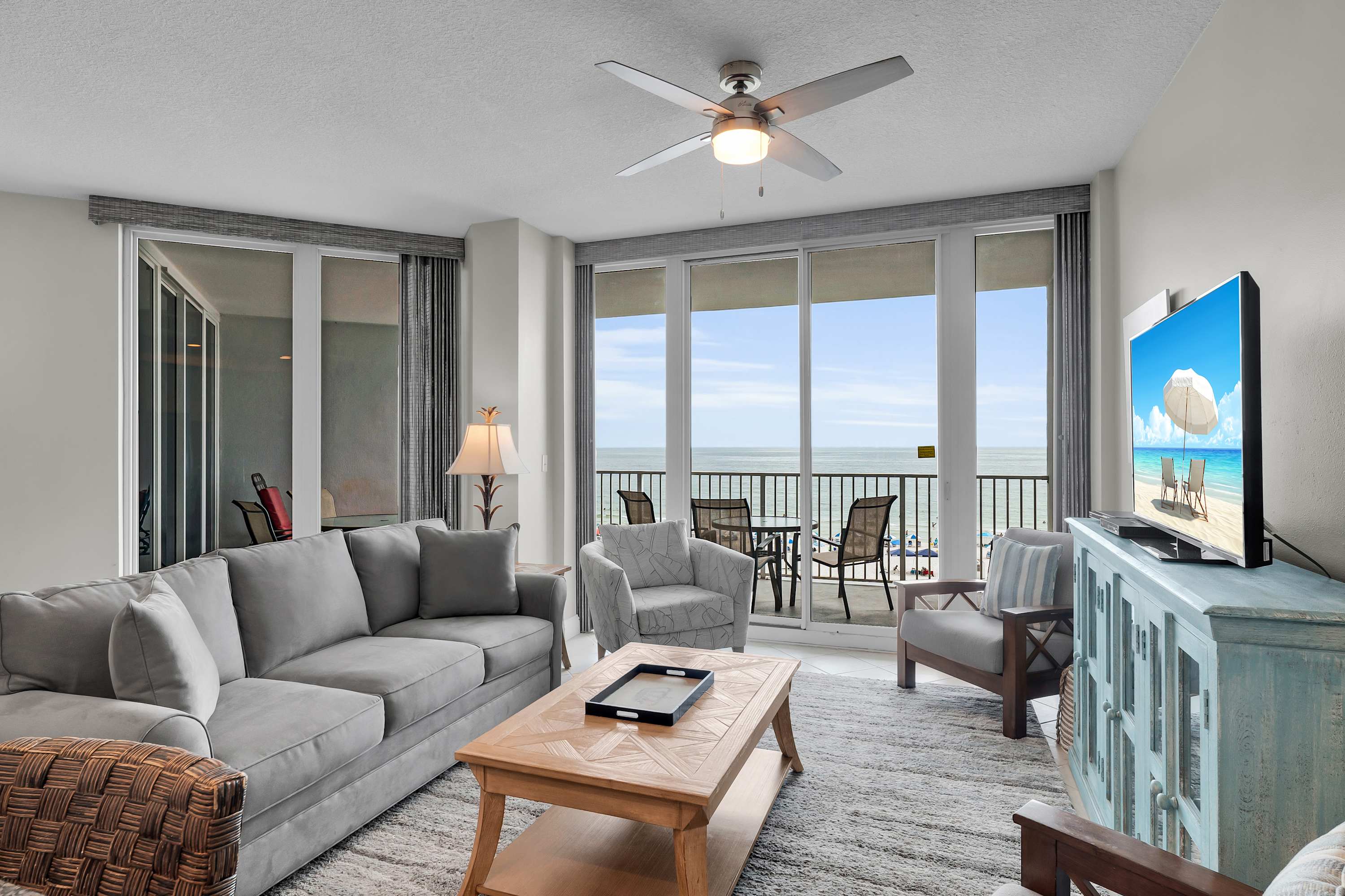 The living and dining areas flow right onto a massive balcony, giving you front-row seats to sugar-white sands and endless Gulf views. With floor-to-ceiling windows and sliding glass doors, the beach feels like part of your living room! Decked out in stylish coastal décor, this spot is designed for ultimate relaxation.
