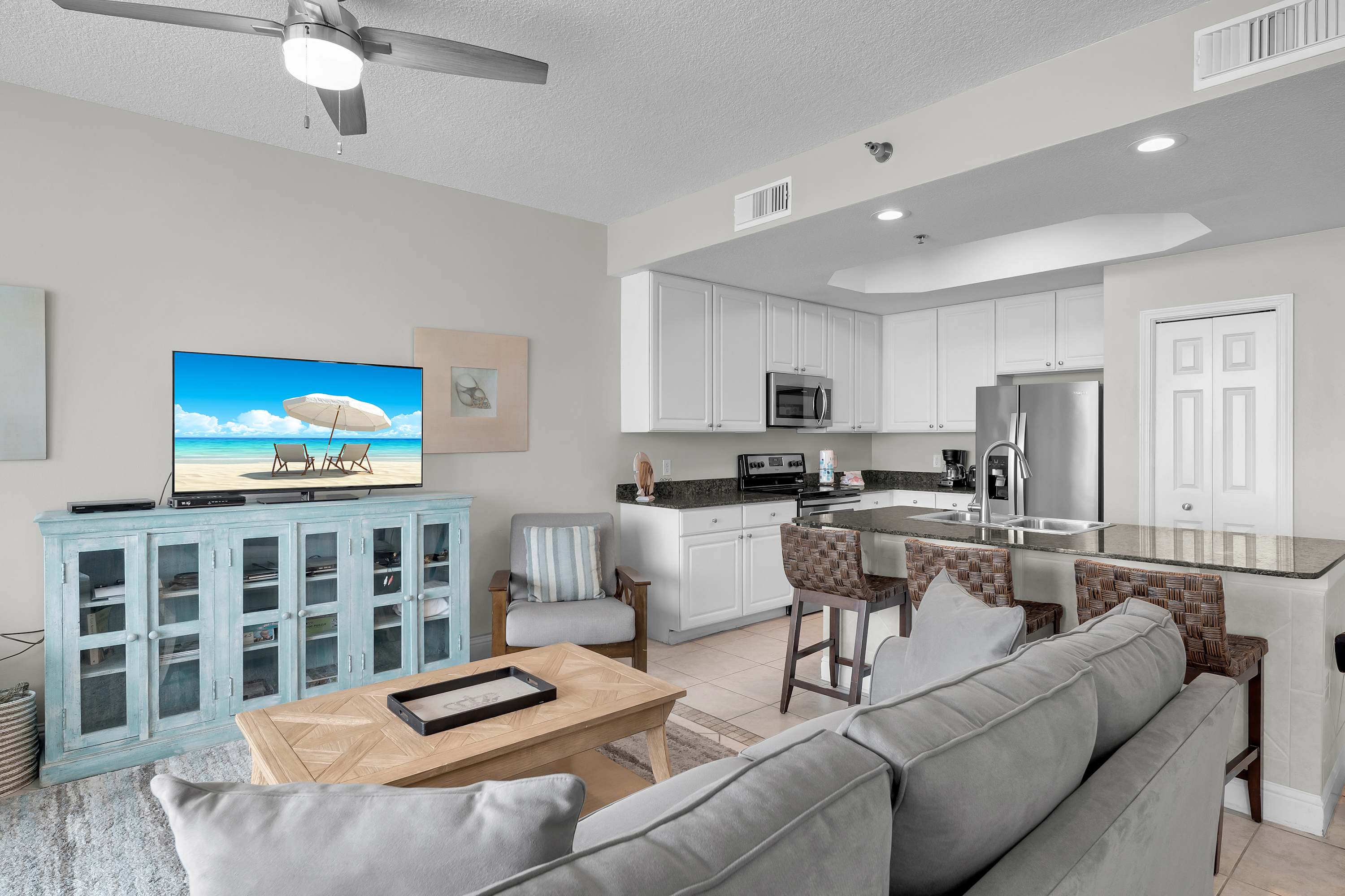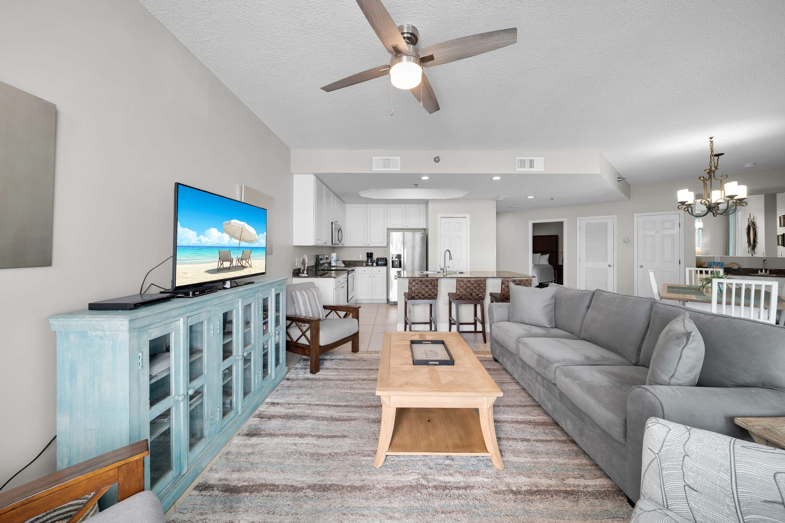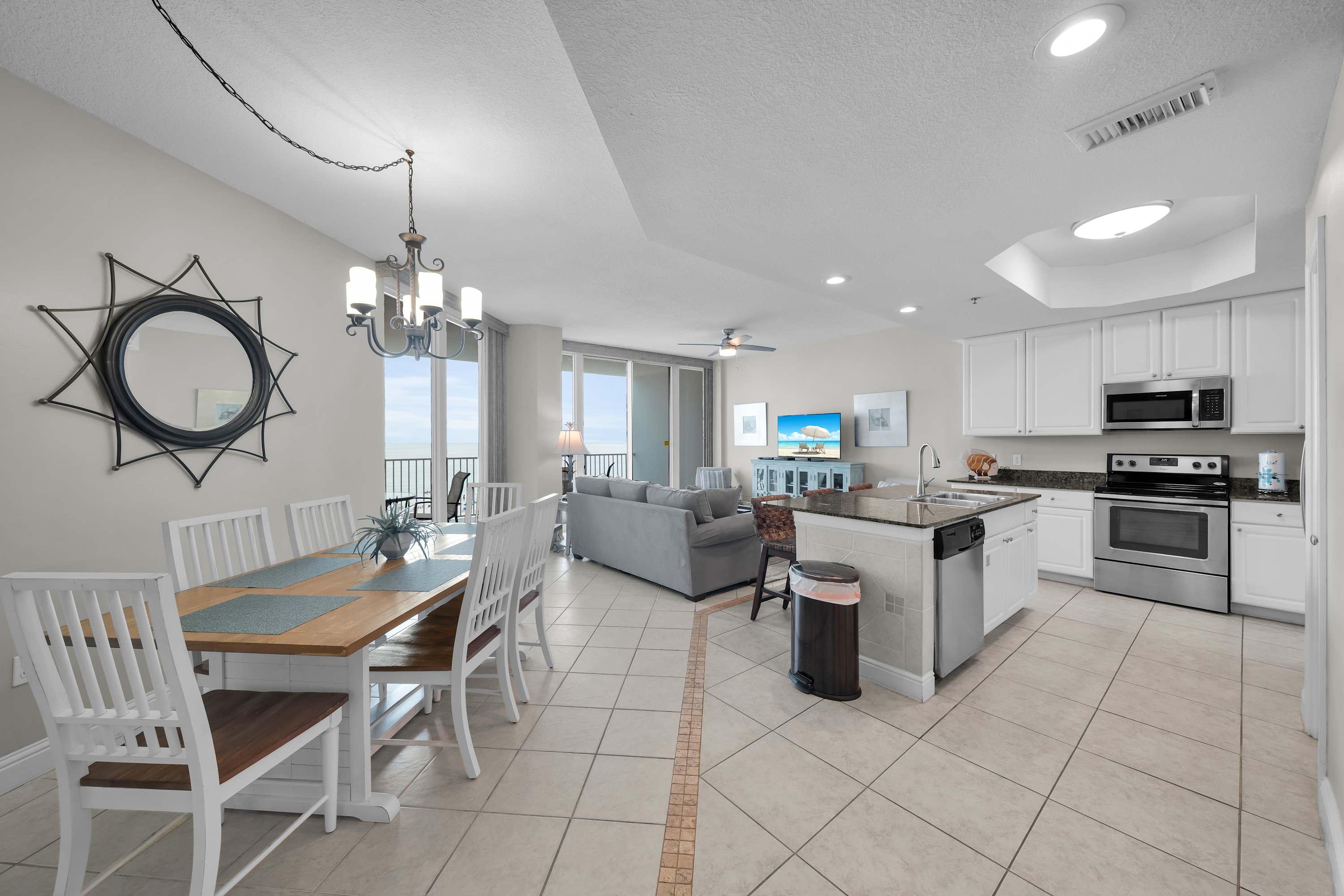 Kick back in the comfy living room with a brand-new queen sleeper sofa, a big-screen Smart TV, DVD player, and even a stereo to set the perfect beachy soundtrack. The dining area seats six, plus a breakfast bar with space for three more—perfect for morning coffee or late-night snacks. And whether you're whipping up a seafood feast or just heating up leftovers, the fully stocked kitchen has everything you need.