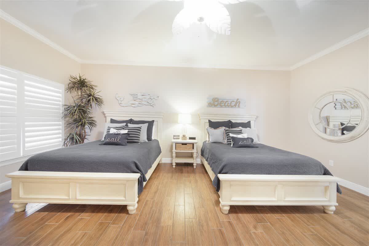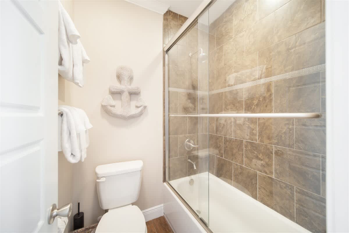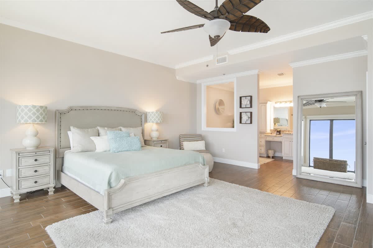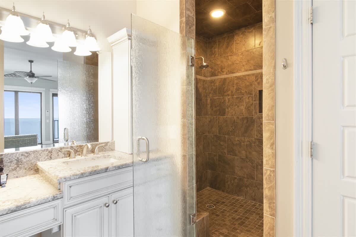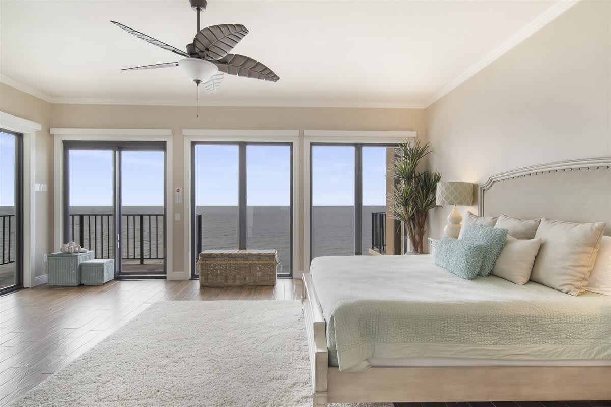 When it’s time to crash, the beachfront master suite brings all the relaxation with a king-size bed, insane Gulf views, and a private en-suite bathroom. The first guest bedroom has two queen beds, a private bath, and a walk-in shower, while the second and third guest rooms each have a queen bed and share a Jack-and-Jill bath. Plus, there’s an extra half bath in the hallway for convenience.