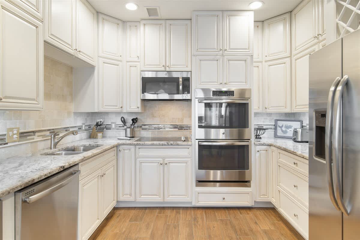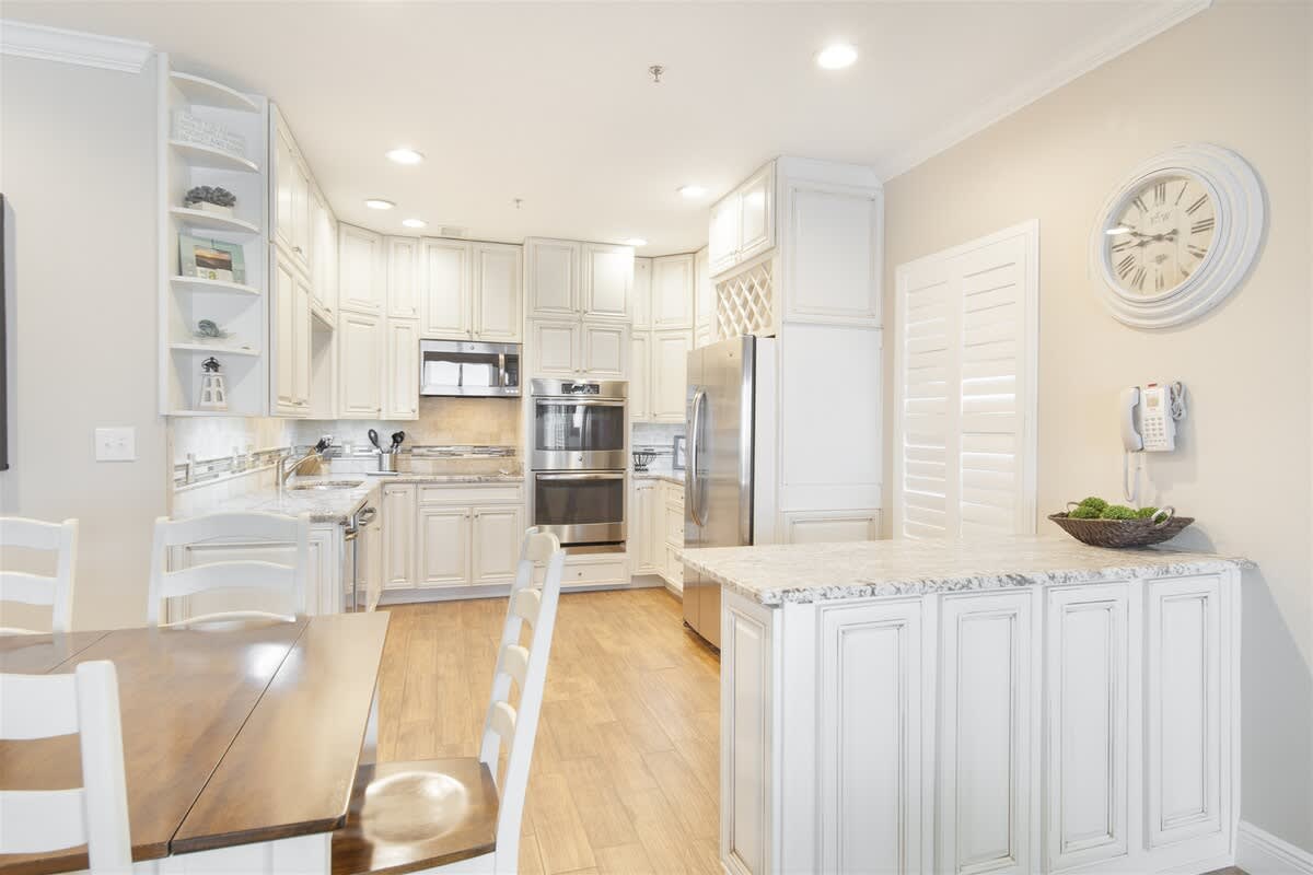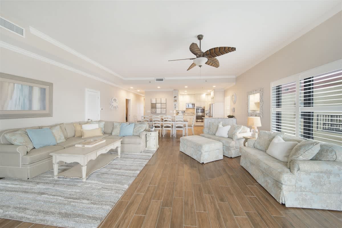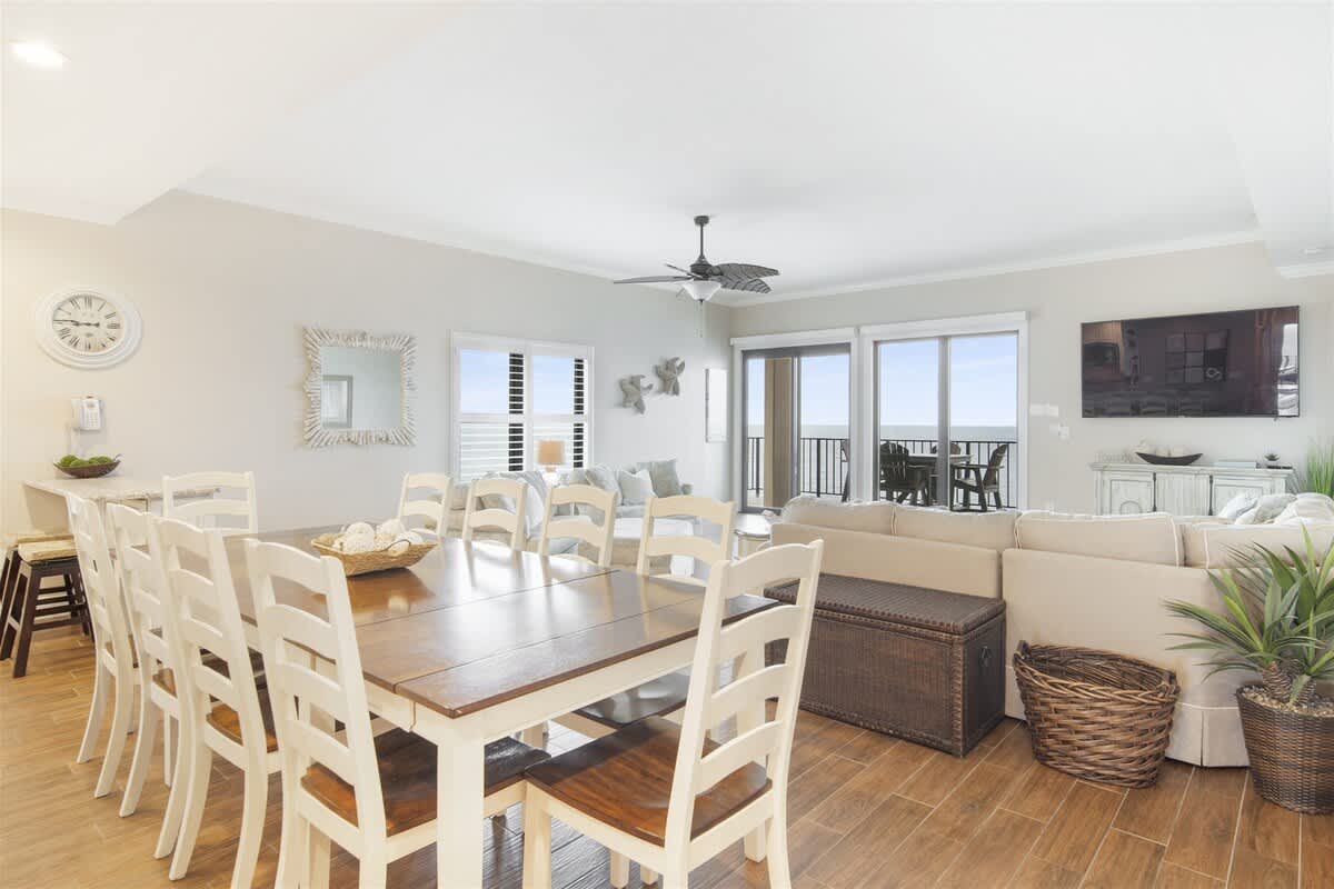 Inside, the open-concept living space is decked out with a huge sectional, oversized armchairs, and a wall-mounted flat-screen TV—ideal for movie nights after a long day in the waves. The kitchen is a total stunner with granite countertops, stainless steel appliances, and custom cabinets, flowing right into the dining area where you can gather for meals and good times.