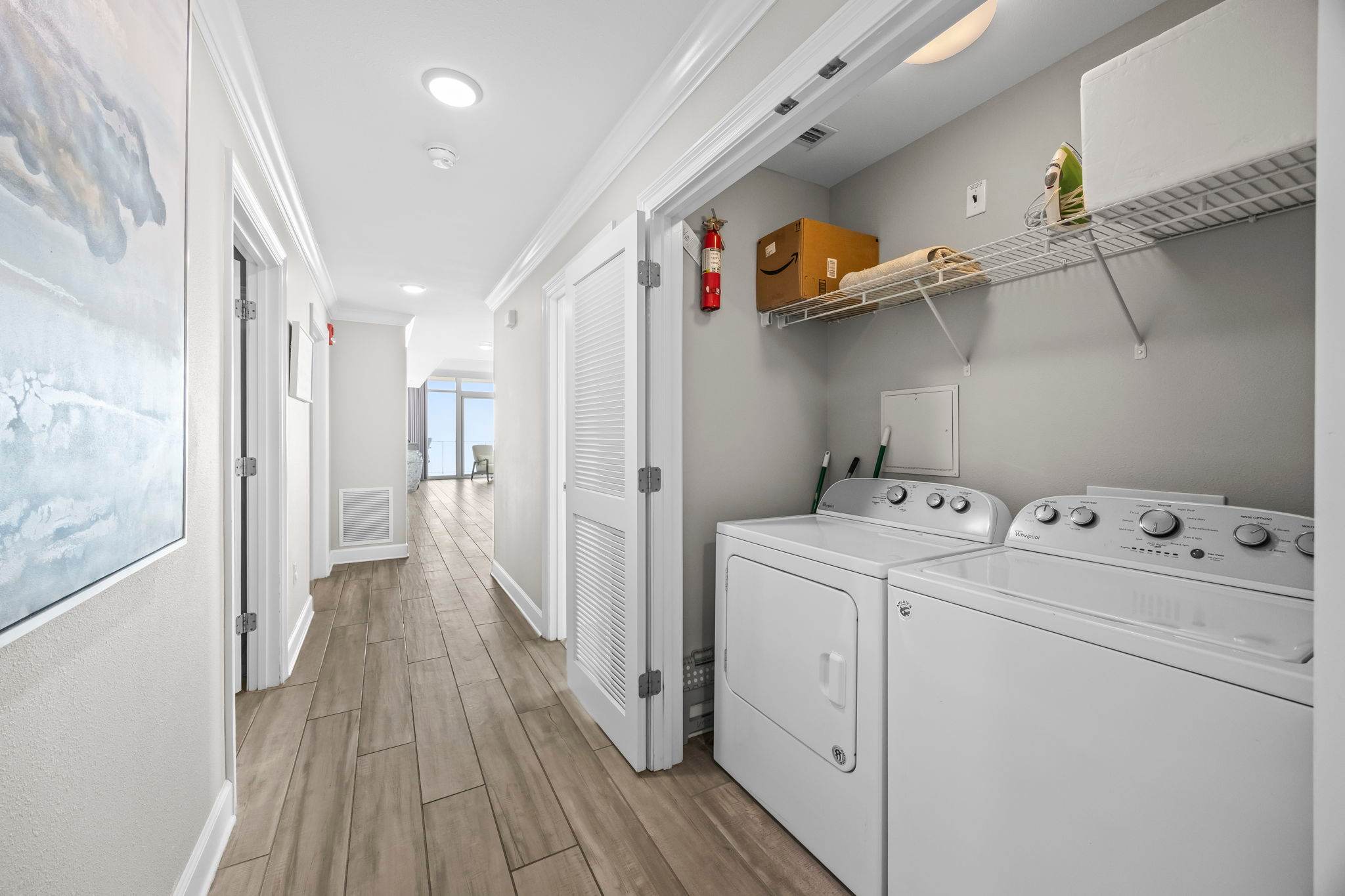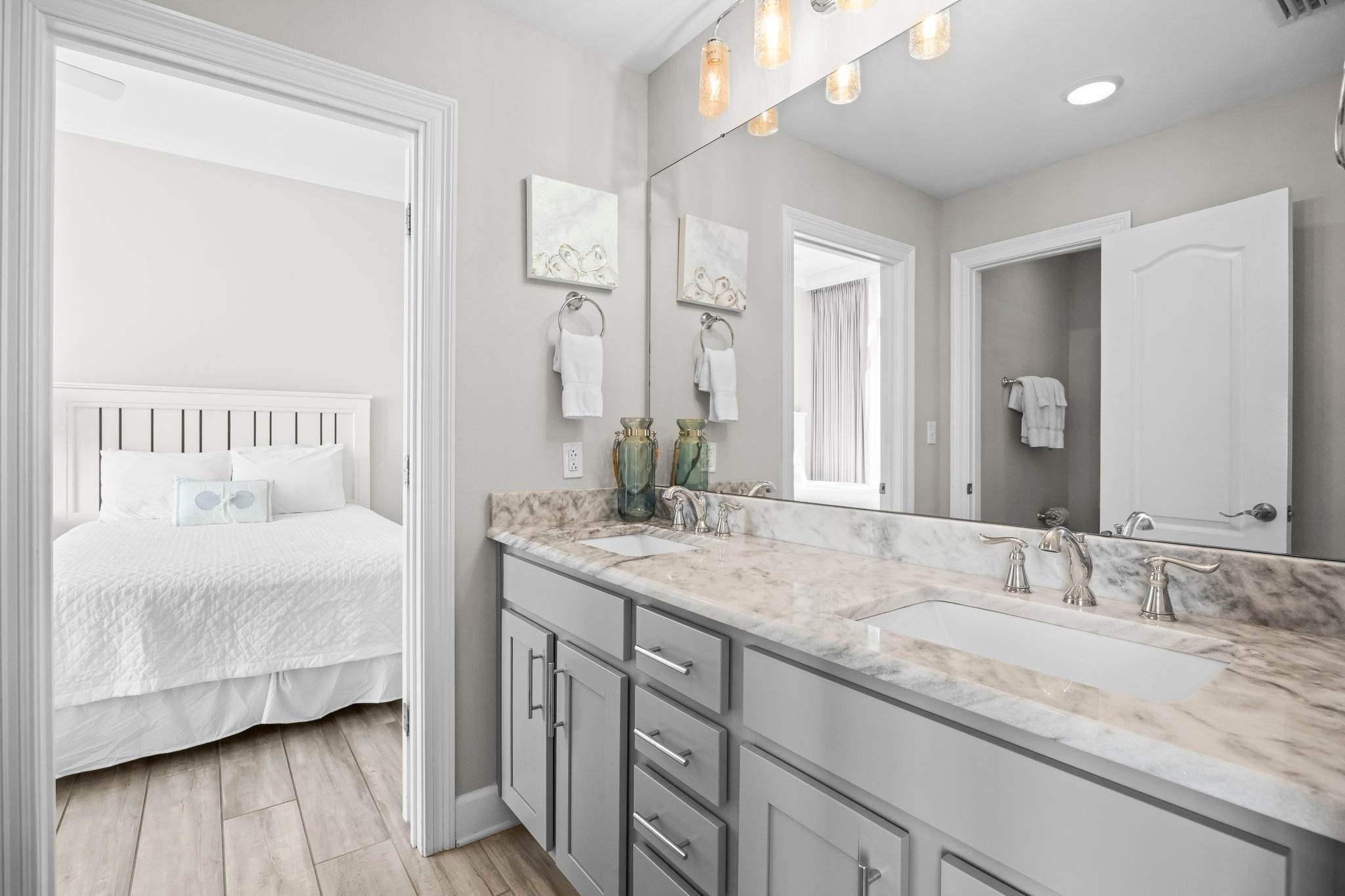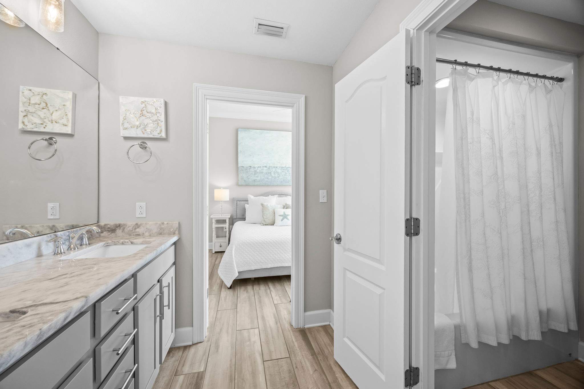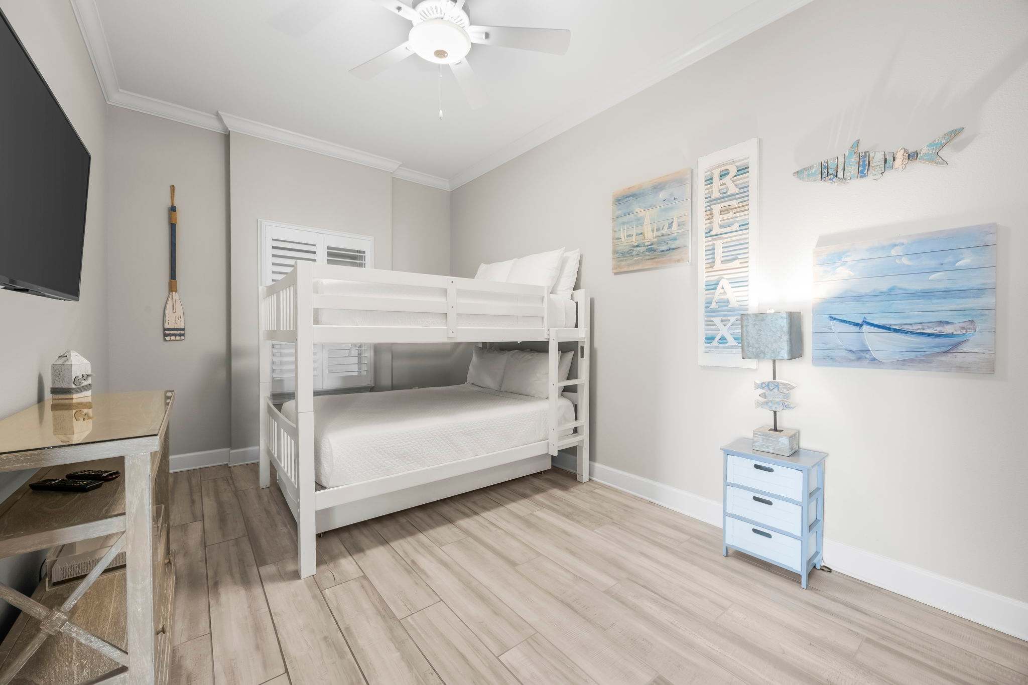 The fourth bedroom is perfect for the crew, featuring a full-size bunk bed with a single pullout trundle and its own en-suite bath with a walk-in shower. A full-size washer and dryer are tucked away in the hallway for ultimate convenience.