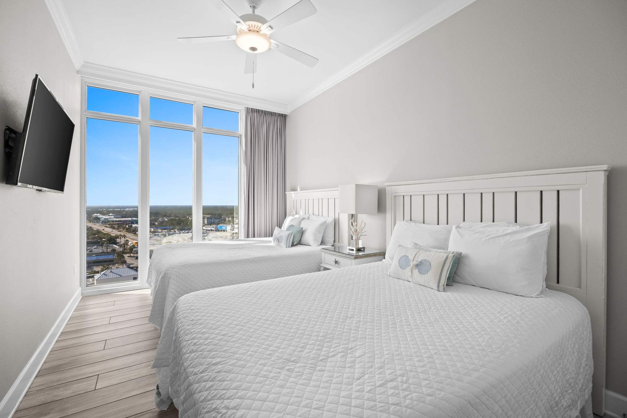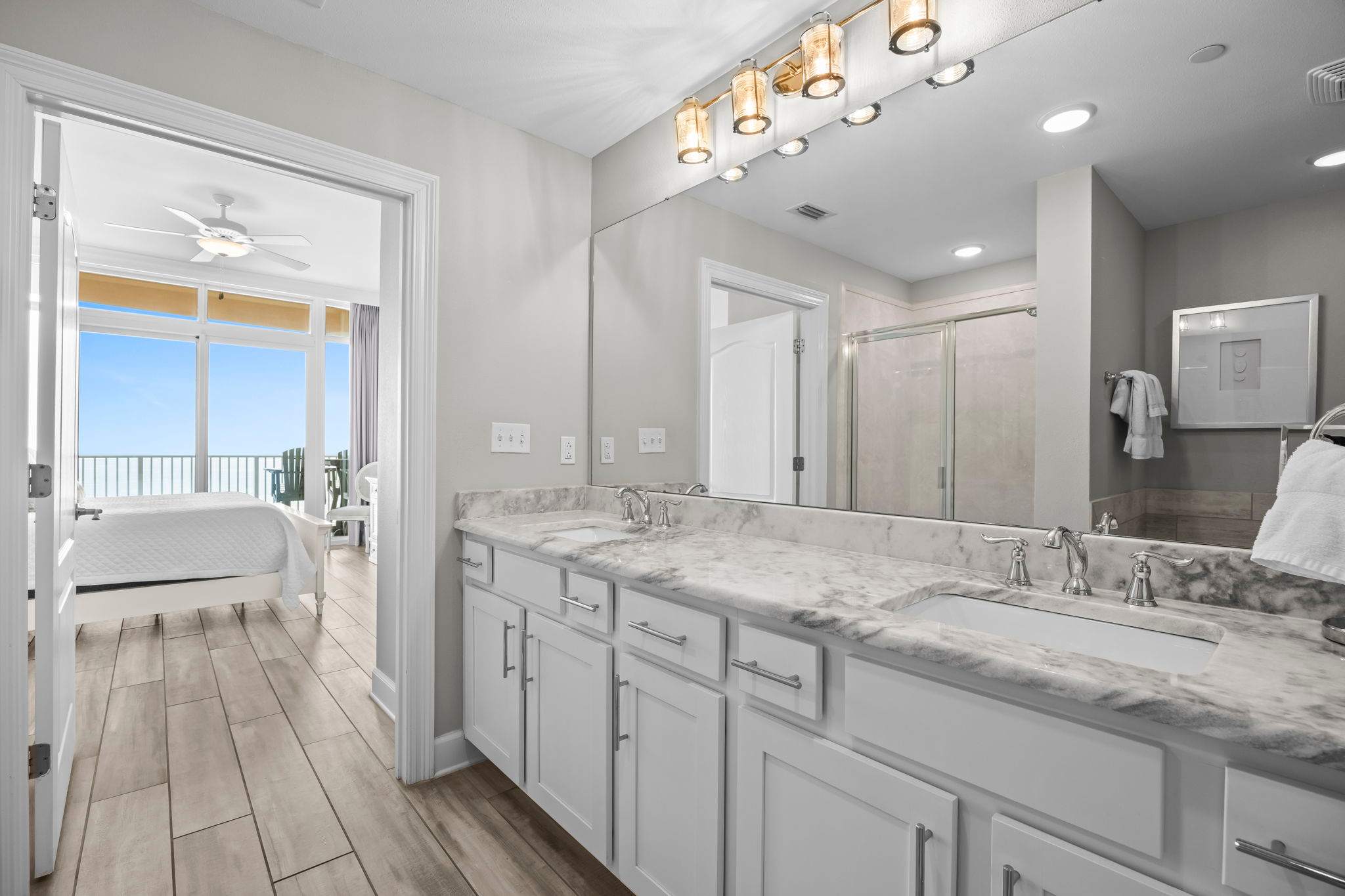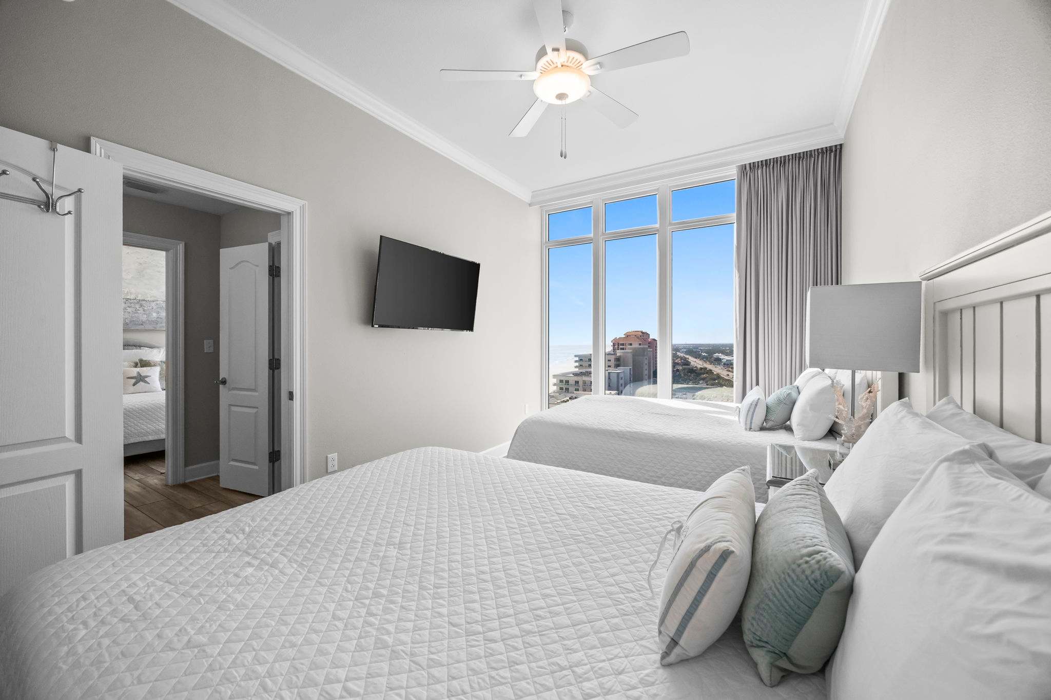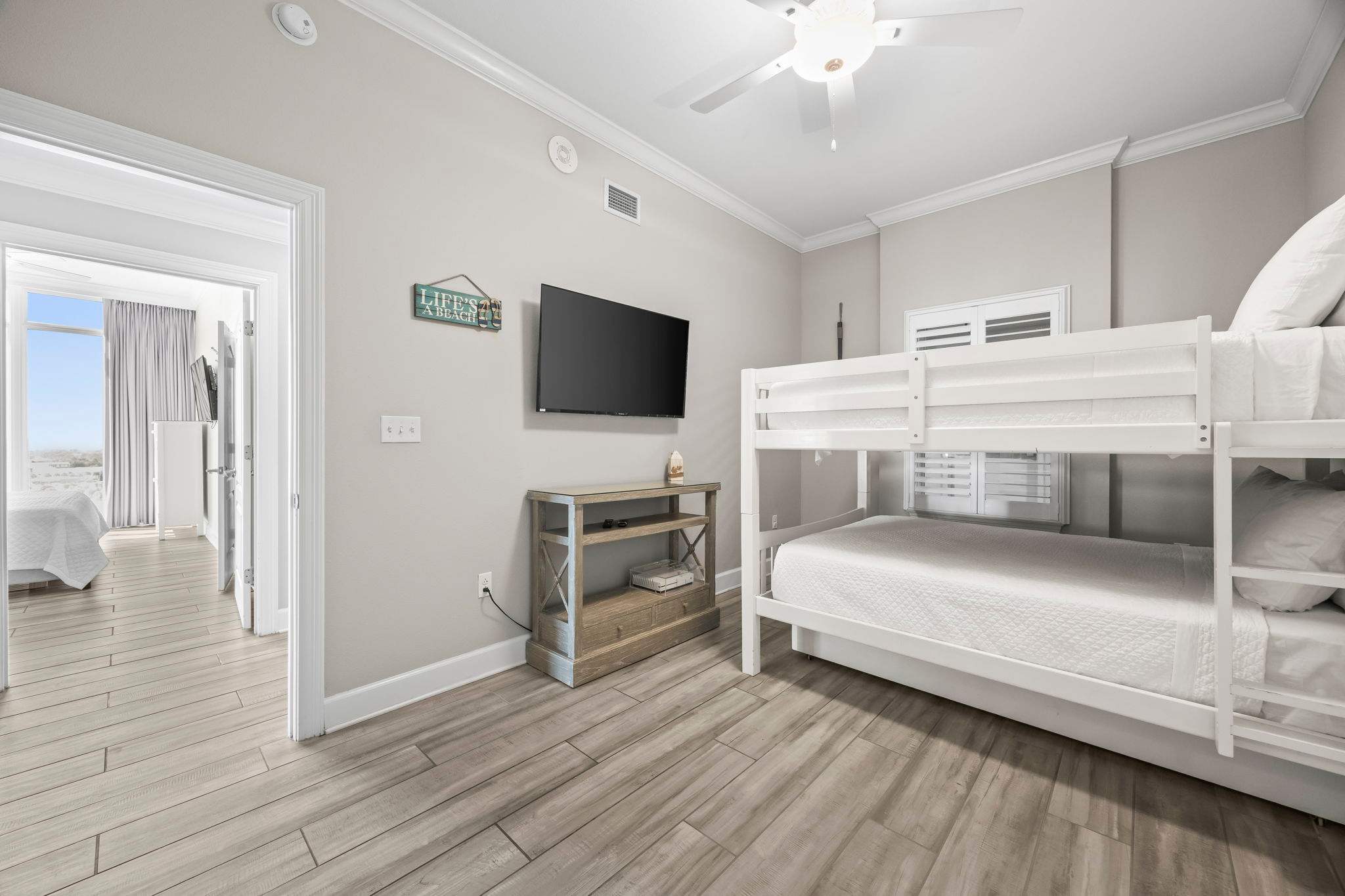The Gulf-front master bedroom is a dream, with a king-size bed, flatscreen TV, and private balcony access. The en-suite master bath is pure luxury, featuring a double vanity, a soaking tub, and a tiled walk-in shower. The second bedroom also has a king-size bed and shares a Jack n’ Jill bath with the third bedroom, which has two queen beds. Both of these rooms boast floor-to-ceiling beach views, so you’re waking up to sunshine and waves every day!