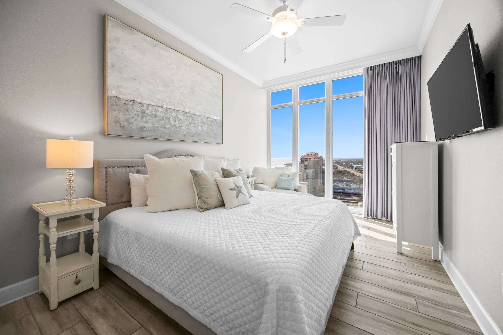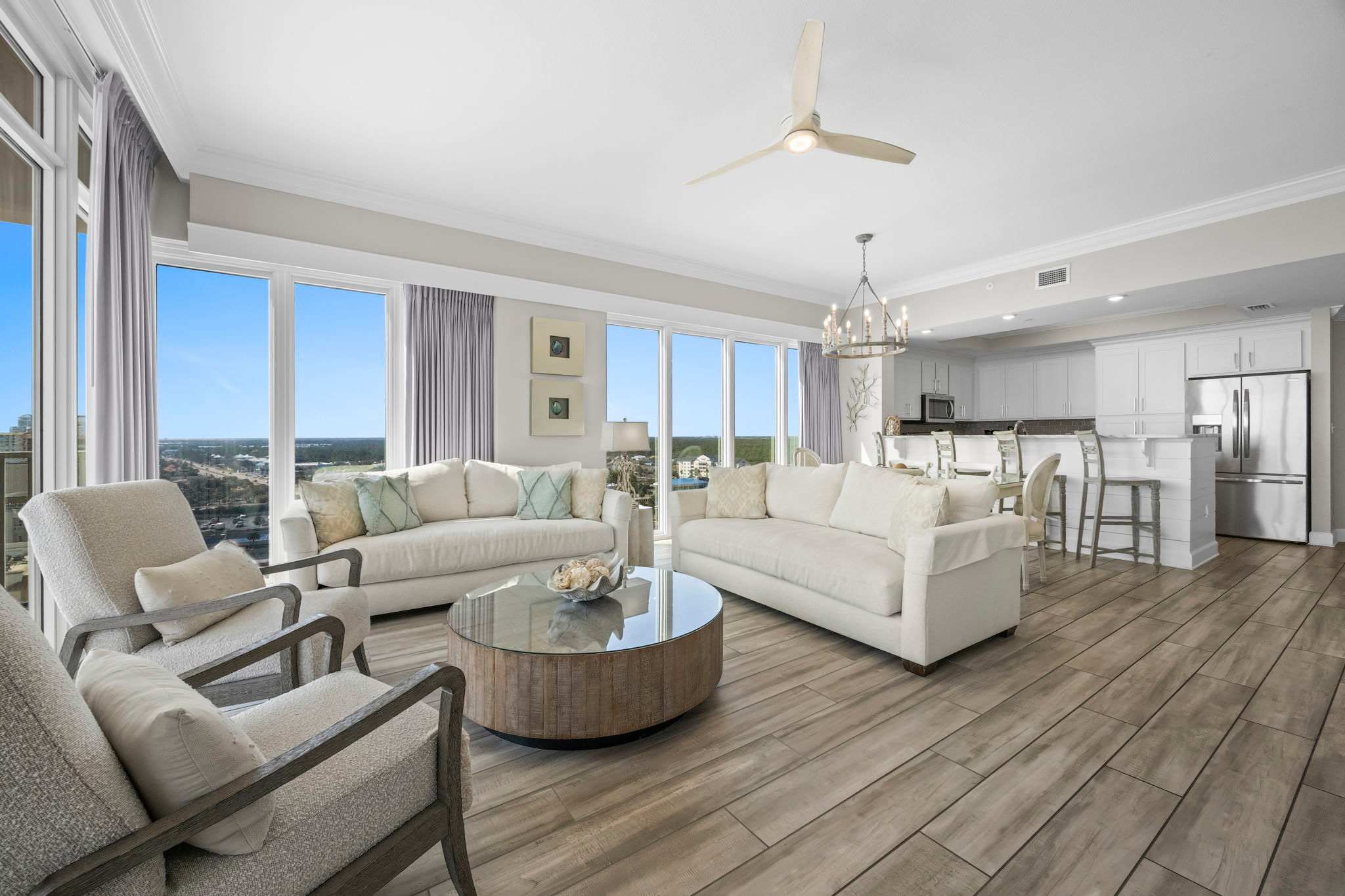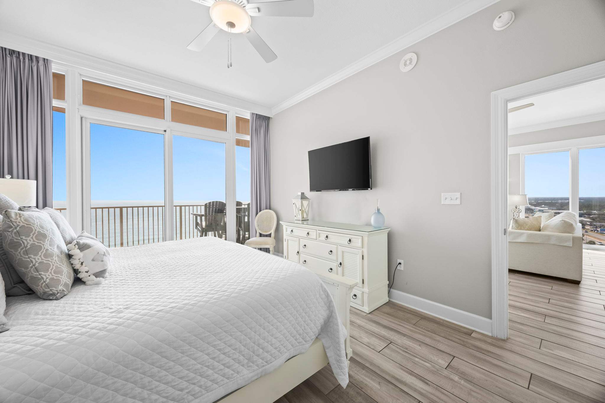 Inside Unit 1101, you'll find premium features and a totally chill, high-end setup. The floor-to-ceiling Gulf views in the master and living room are straight-up stunning, and the balcony access means you can roll out of bed and step into paradise. The living room is all about comfort, with two big sofas, two swivel armchairs, and a massive flatscreen TV—perfect for kicking back after a sun-soaked day.