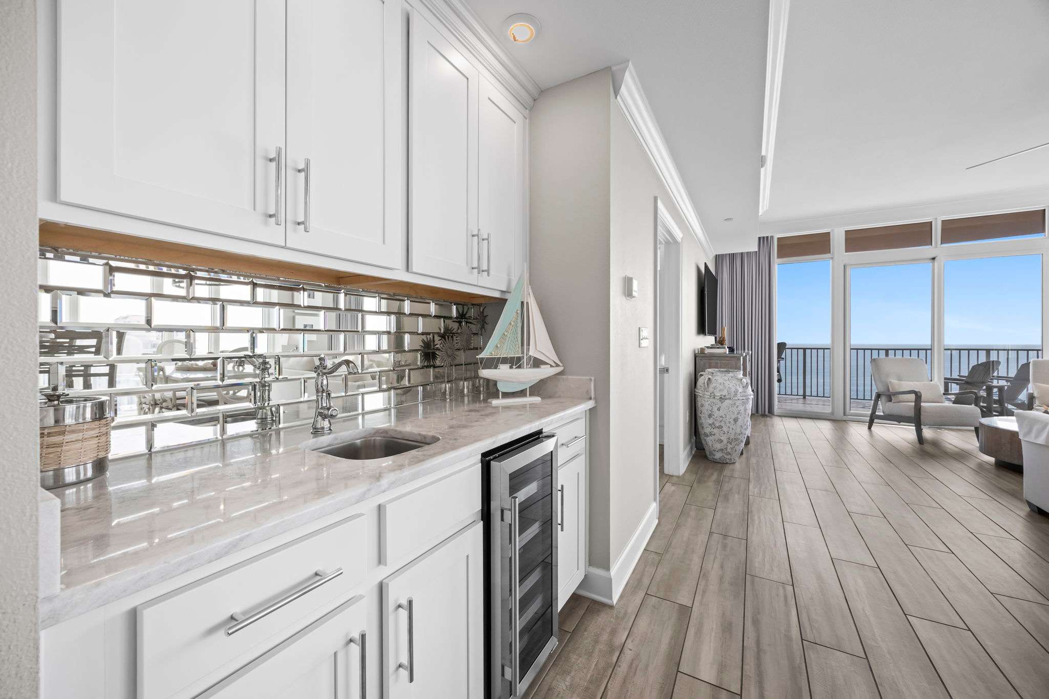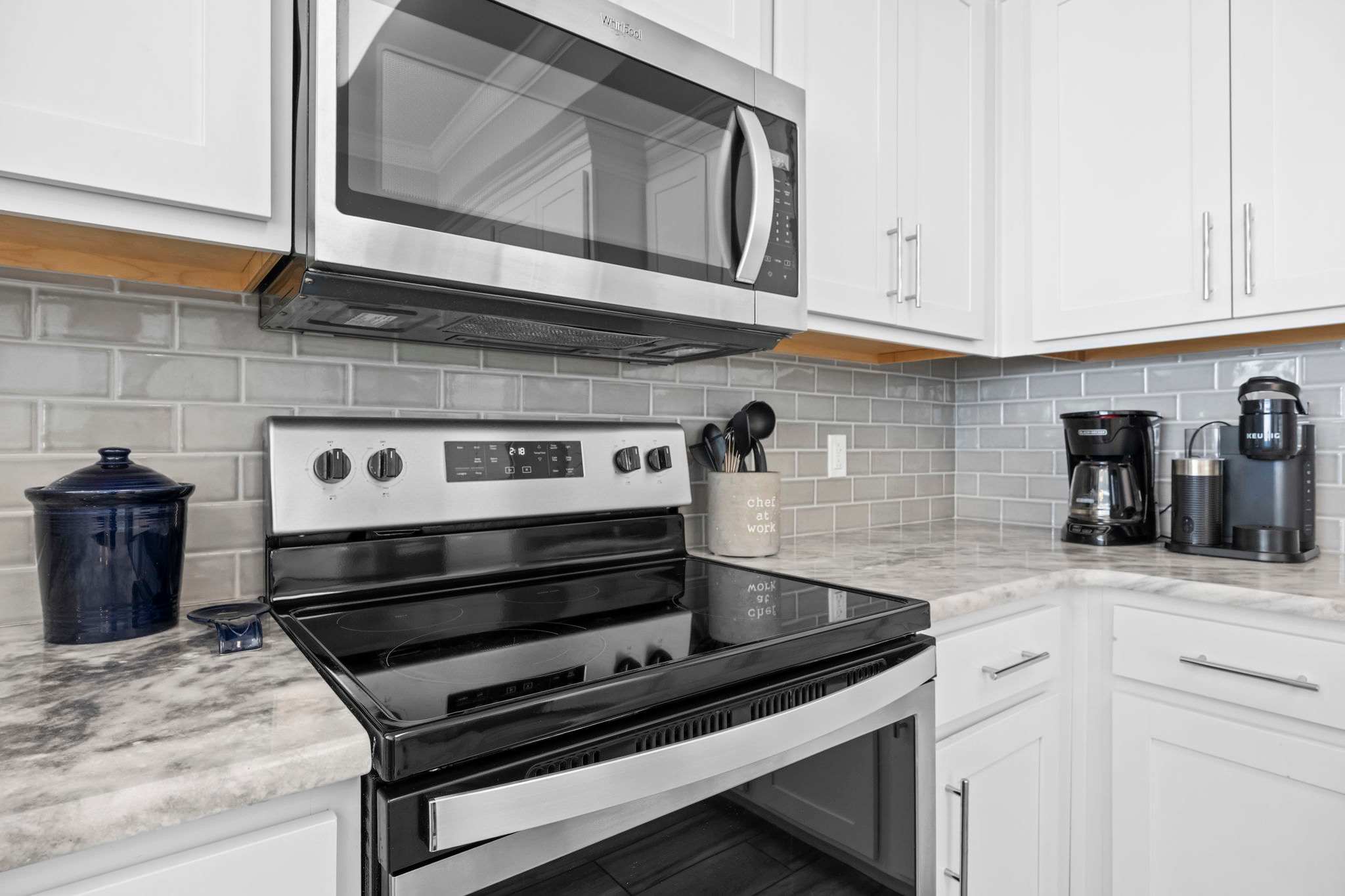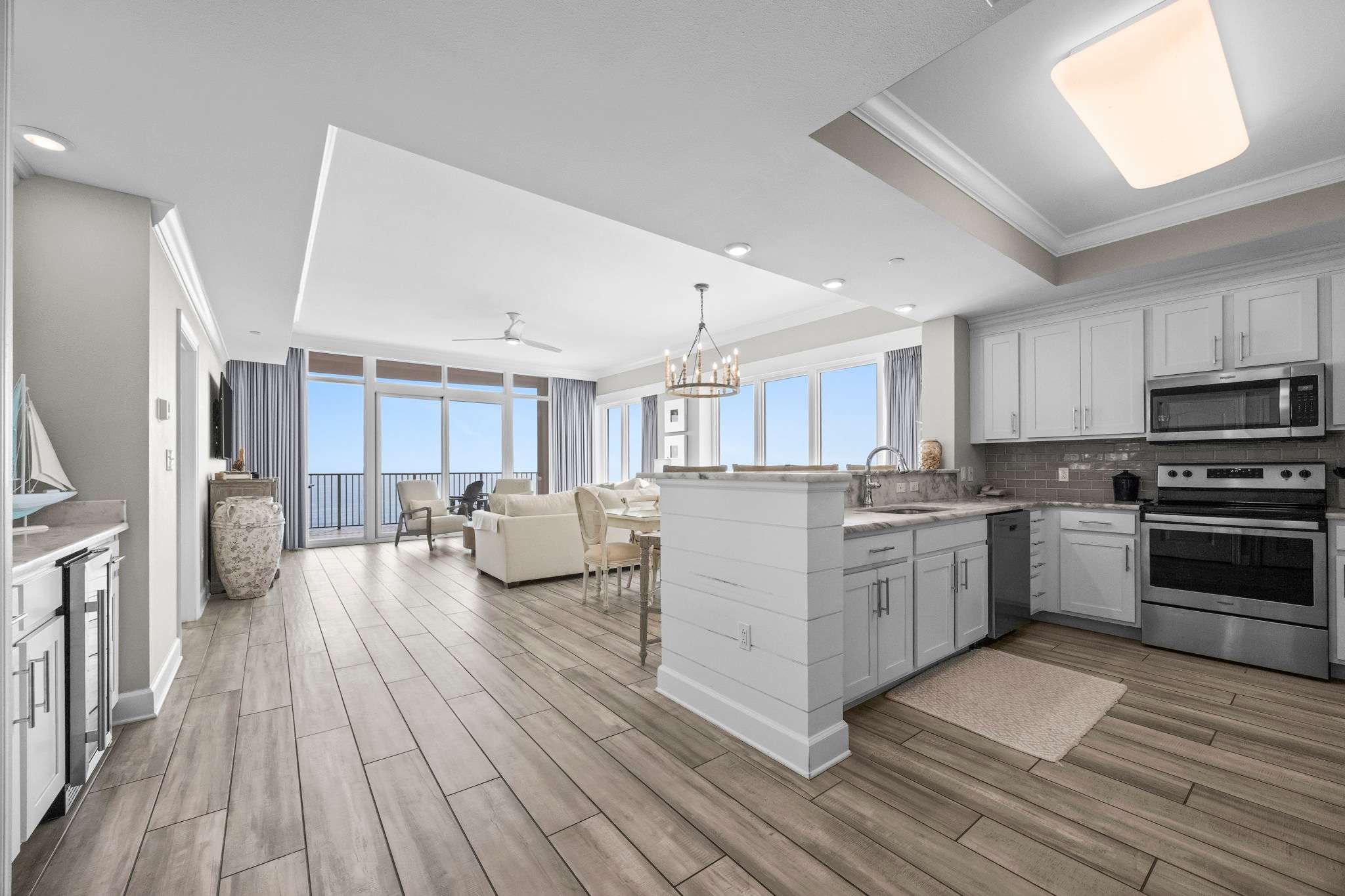 The kitchen is sleek and stylish, with stainless steel appliances, white wood cabinetry, marbled granite countertops, and a breakfast bar with seating for four. Whether you're cooking up a feast or just mixing up margaritas, you'll have everything you need. The dining area seats 6-8 guests and is paired with a wet bar featuring an ice maker and extra storage—because vacation calls for cold drinks and good times!