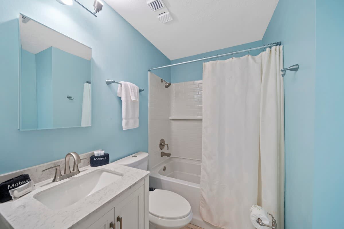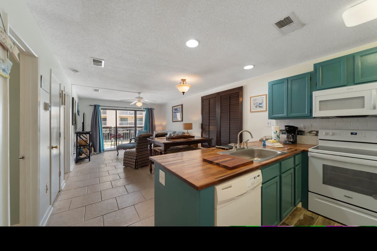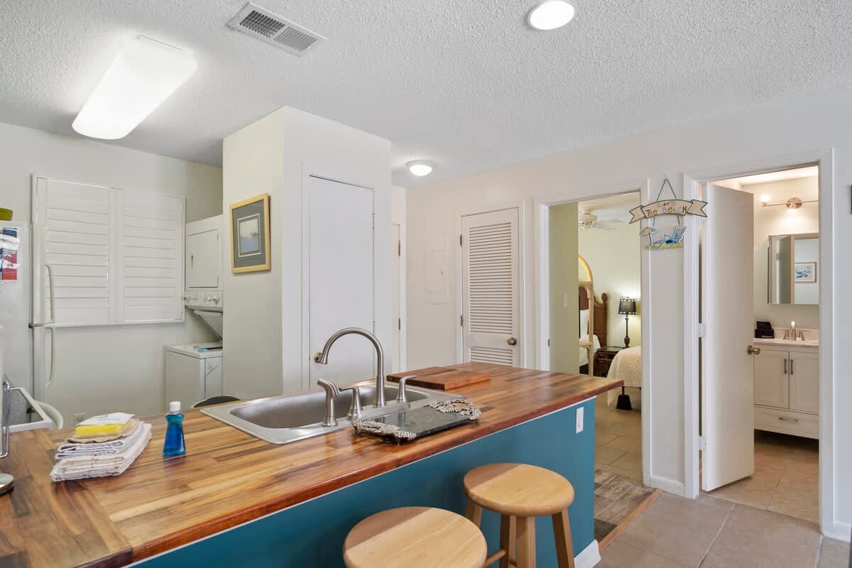 The open living space invites you to kick back on the comfy sofa, catch a flick on the flat-screen, or just soak up the salty breeze from the private balcony. The fully stocked kitchen, with its bold turquoise cabinets and butcher block countertops, is ready for anything from morning coffee to seafood feasts. The dining area, with seating for four and extra spots at the breakfast bar, keeps the good times rolling.