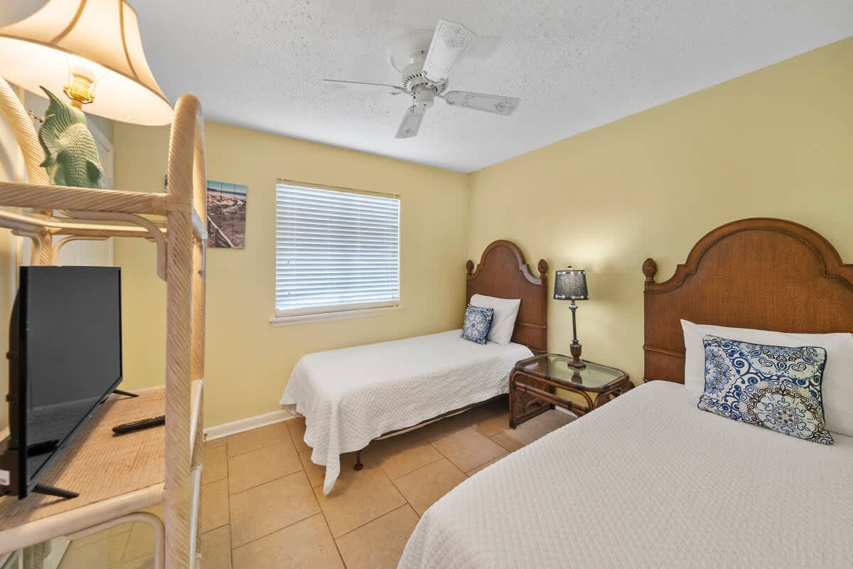 The primary bedroom is a dreamy retreat with a plush queen bed, crisp linens, and direct balcony access for those sweet morning views. The second bedroom is perfect for the crew, featuring two cozy twin beds. Each room has its own en-suite bathroom, so everyone gets their own space to freshen up after a day in the surf.