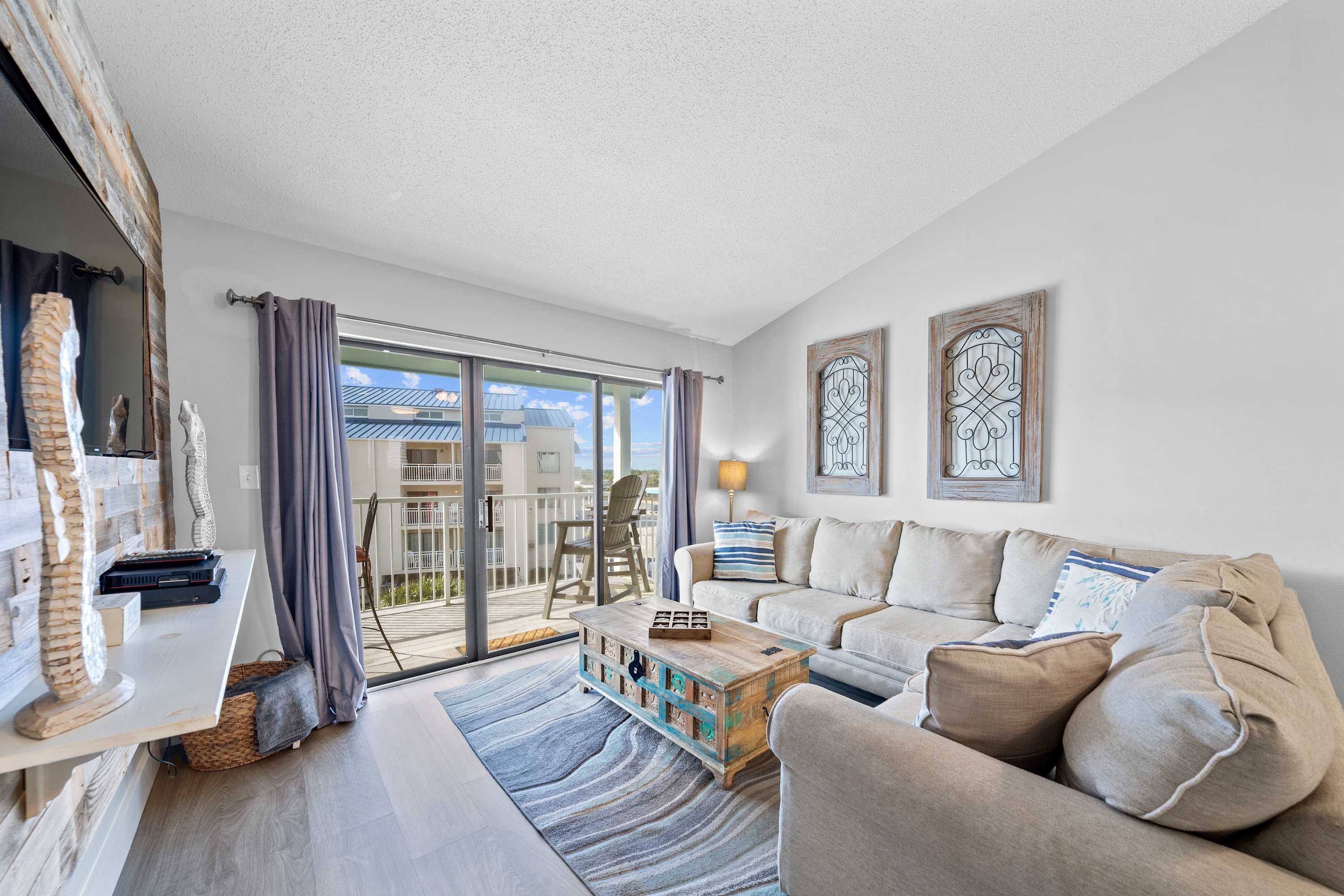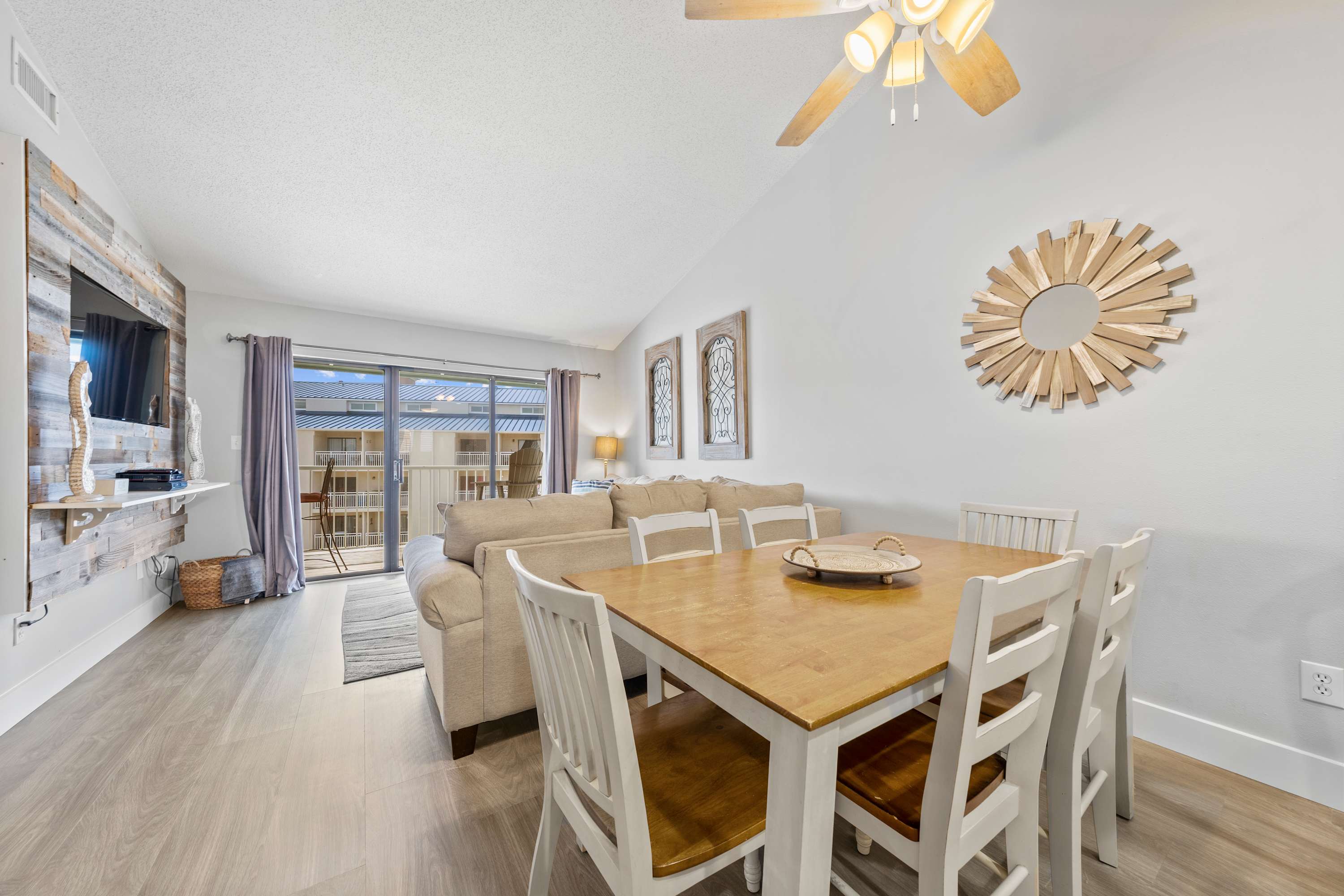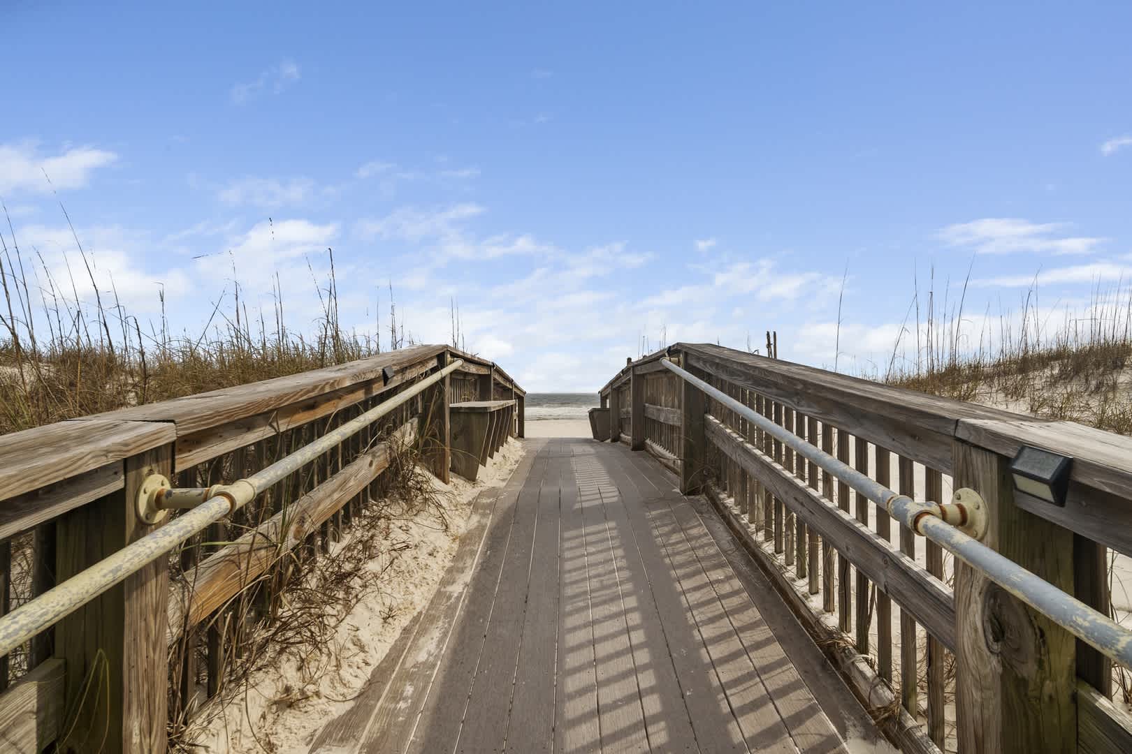 Gather around the dining table, which seats six, with extra barstools at the counter for casual bites and morning coffee chats. When you’re not inside enjoying the cozy setup, head downstairs to the resort-style outdoor pool, where there's plenty of seating on the expansive pool deck. And when it's time to hit the sand, your private boardwalk leads straight to the beach!
