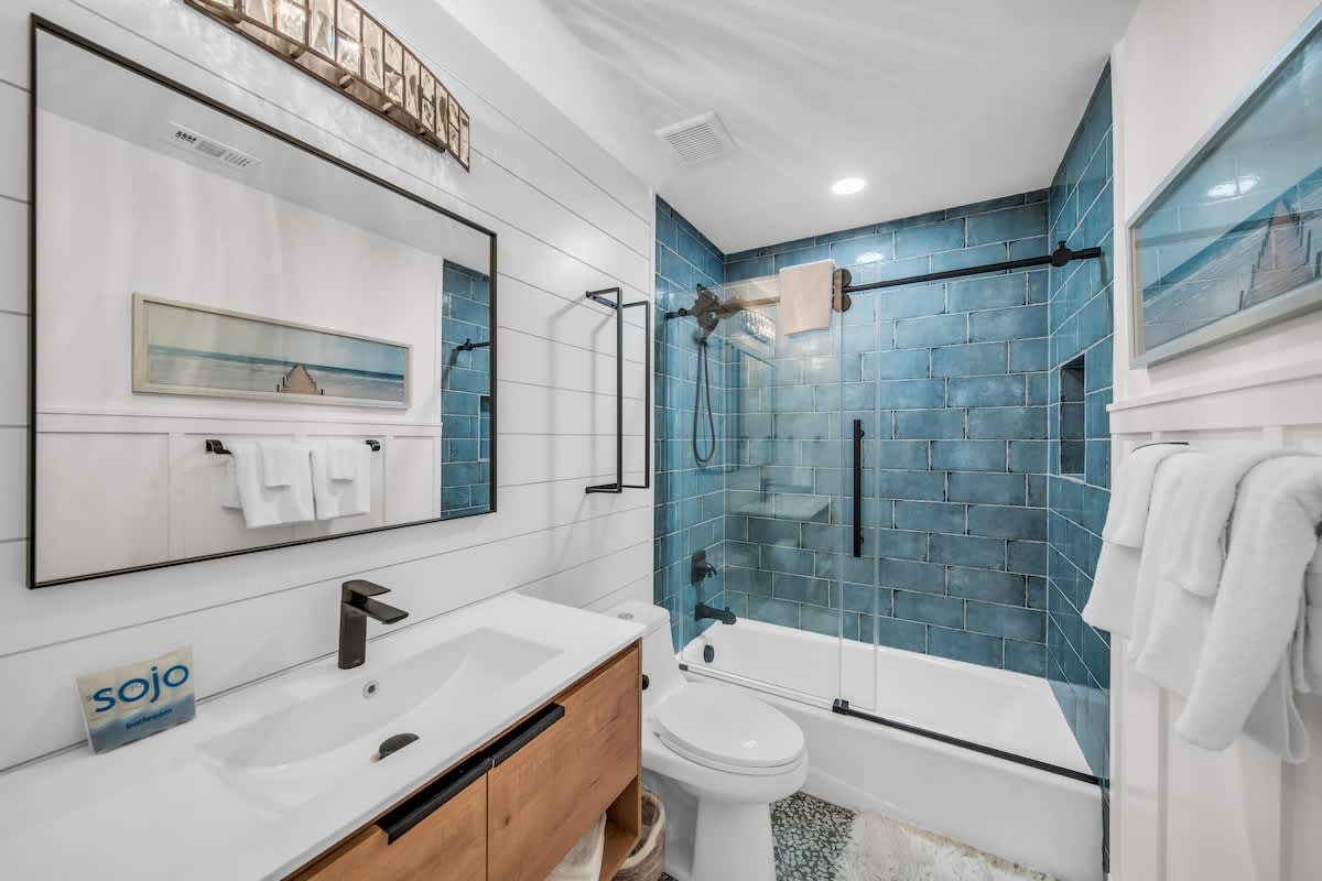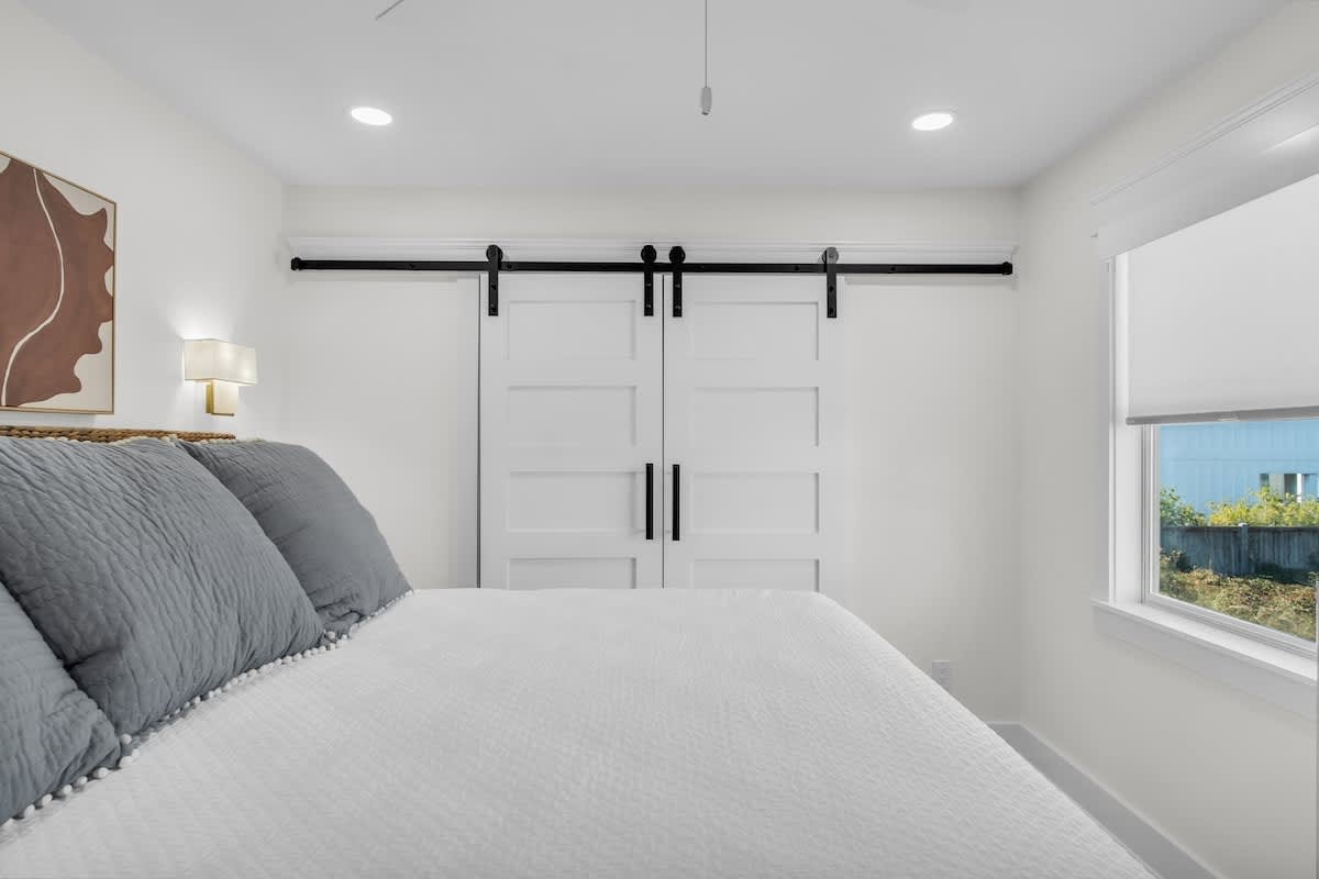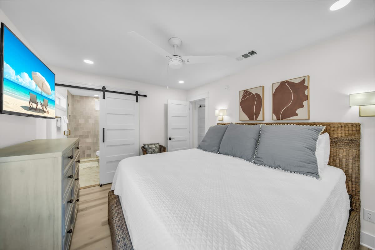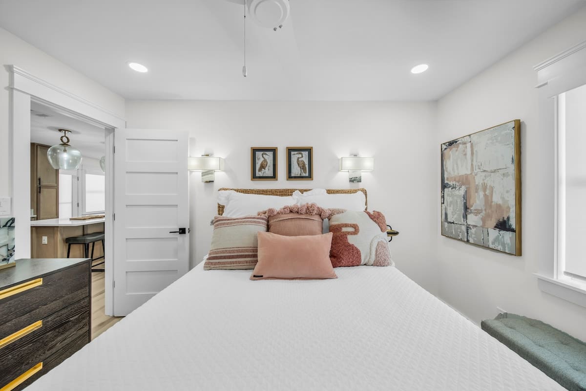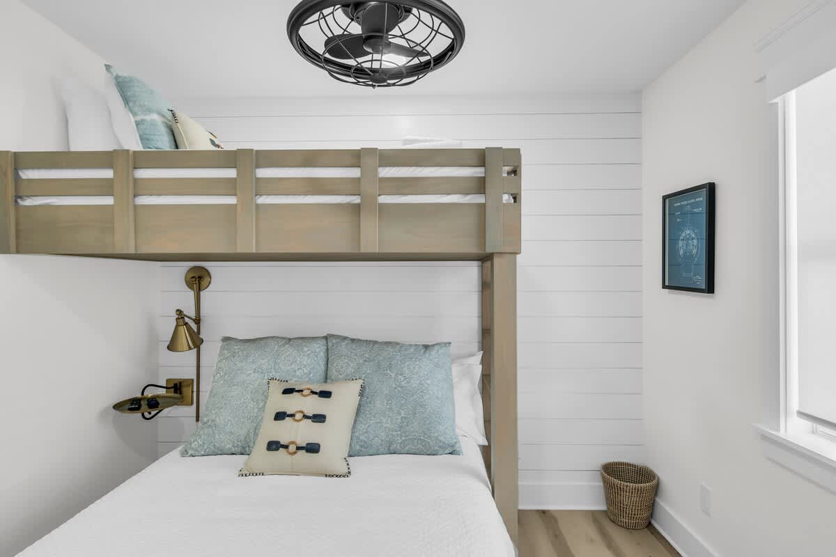 Sea Breeze Cottage features three bedrooms, each designed with coastal charm and relaxation in mind. The primary suite includes a king-sized bed, soft linens, and a spa-inspired en-suite bath. The second bedroom brings a touch of modern elegance with a queen-sized bed, while the bunk room is the perfect hideaway for the little ones (or the young at heart)! With two full baths featuring chic tile work, custom vanities, and a walk-in shower, getting ready for a night on the town is a breeze.