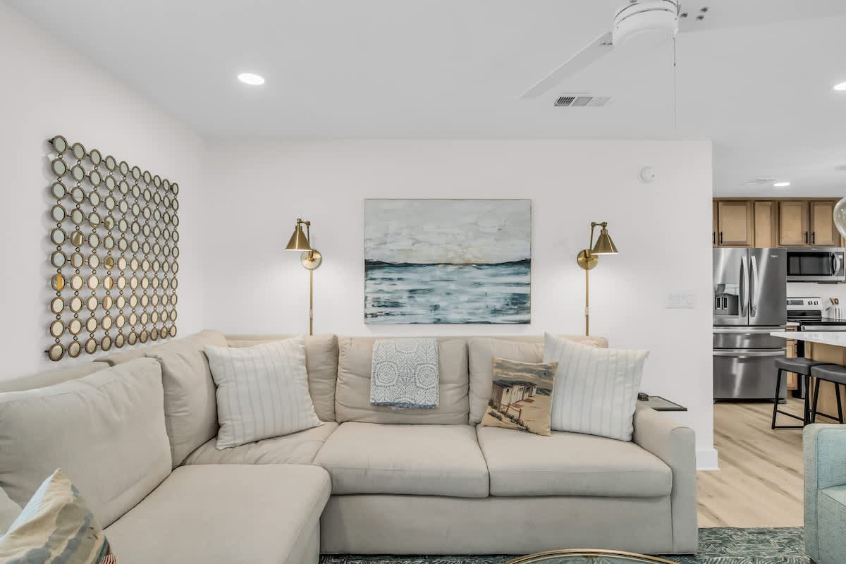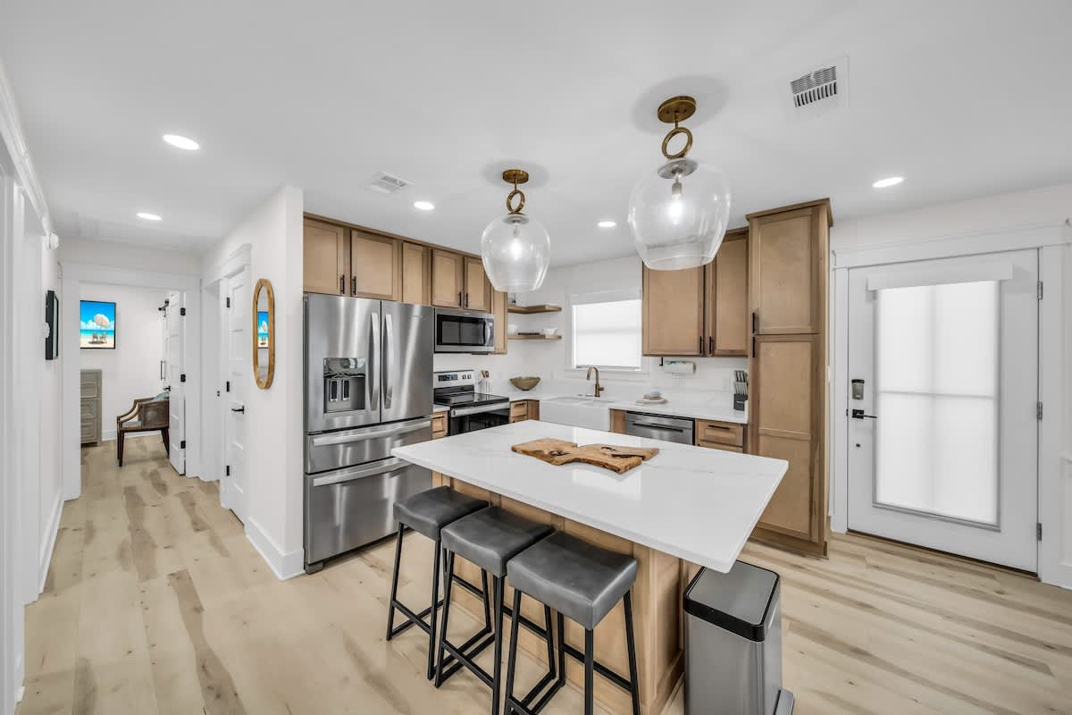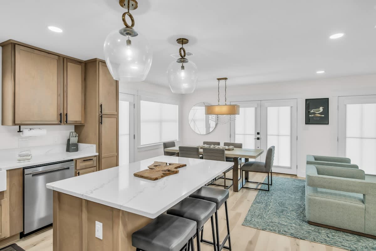 Step inside, and you’ll be greeted by a beautifully designed coastal retreat with an open-concept layout, modern finishes, and all the comforts of home. The fully equipped kitchen boasts sleek stainless-steel appliances, a spacious island, and stylish open shelving—perfect for whipping up a beachside feast. The airy living and dining area offer plenty of space to kick back, with comfy seating and a bright, beachy atmosphere.