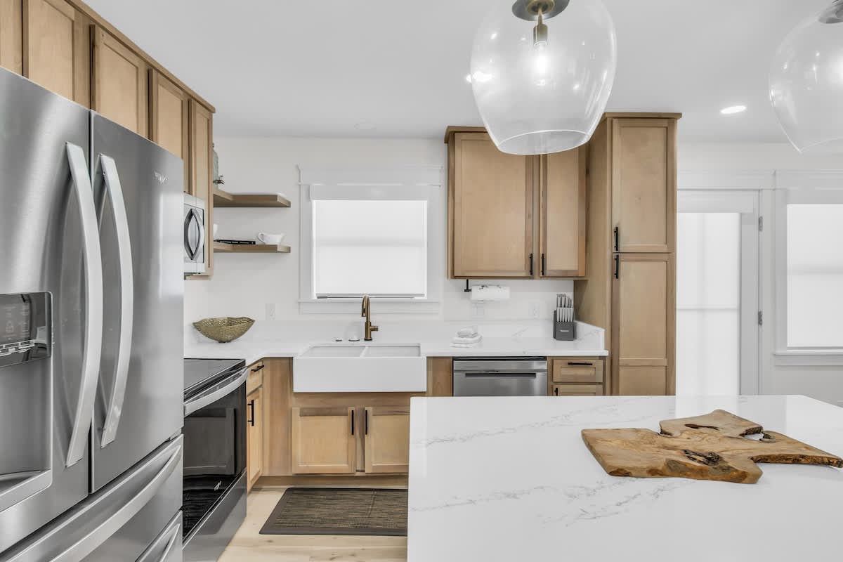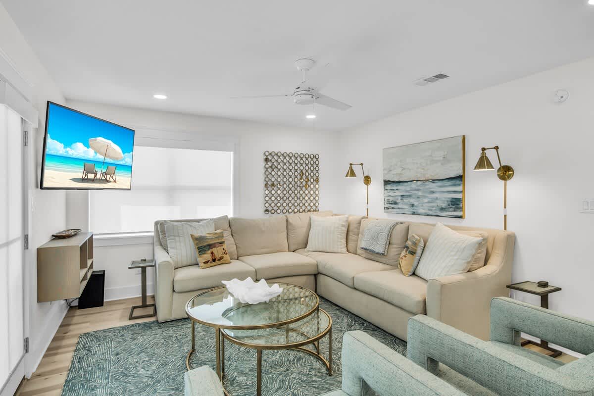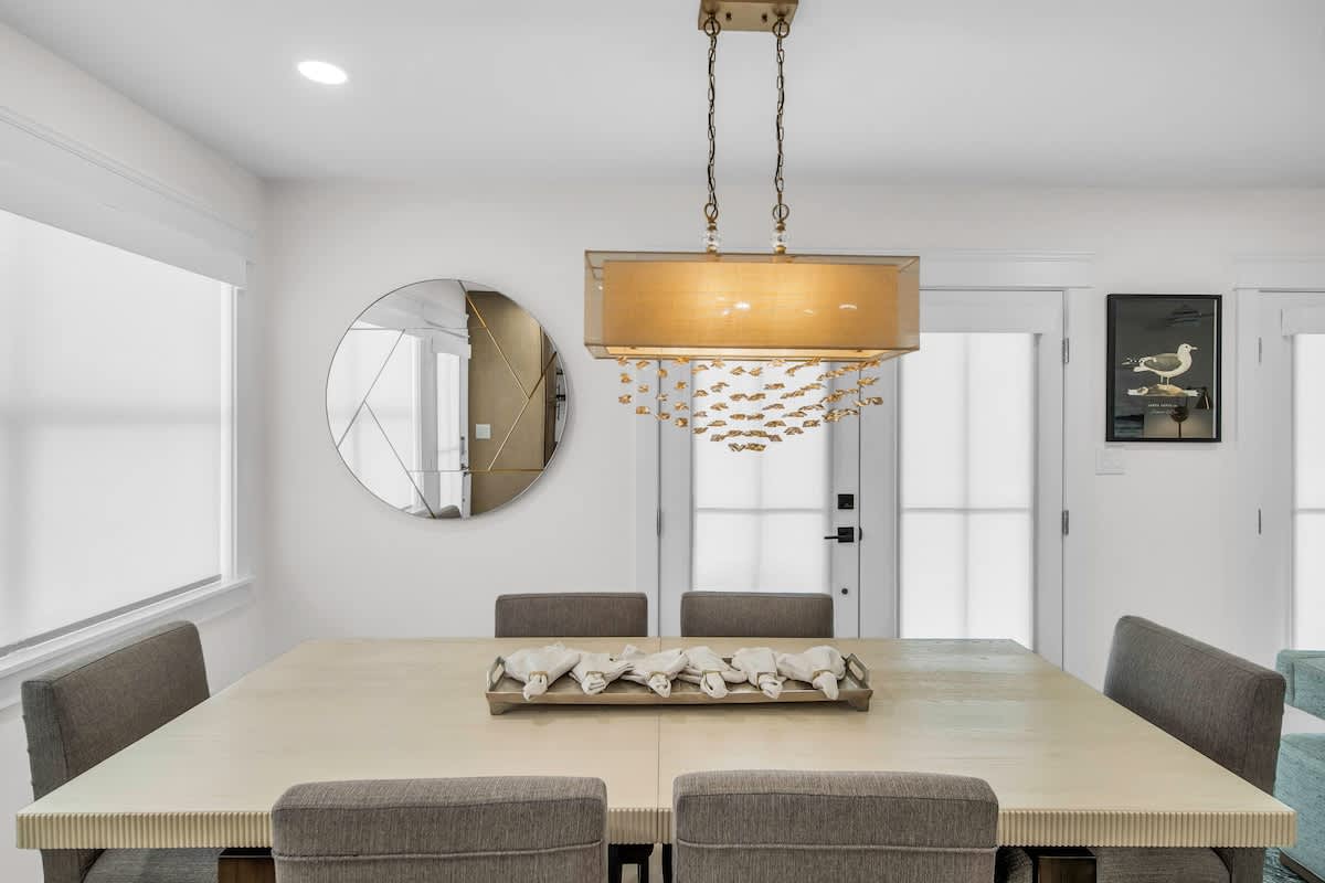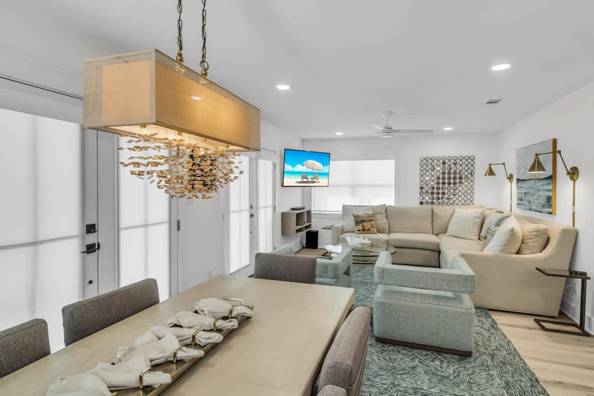 Step inside, and you’ll be greeted by a beautifully designed coastal retreat with an open-concept layout, modern finishes, and all the comforts of home. The fully equipped kitchen boasts sleek stainless-steel appliances, a spacious island, and stylish open shelving—perfect for whipping up a beachside feast. The airy living and dining area offer plenty of space to kick back, with comfy seating and a bright, beachy atmosphere.