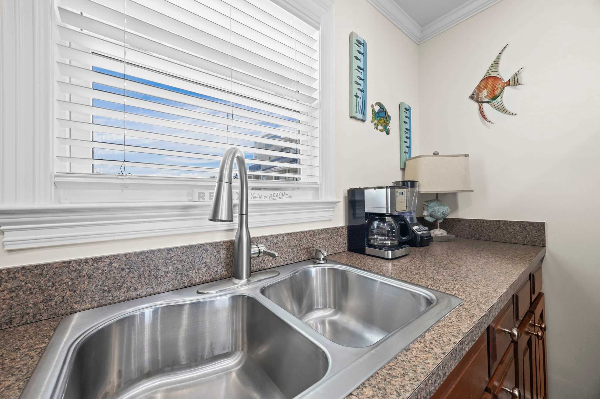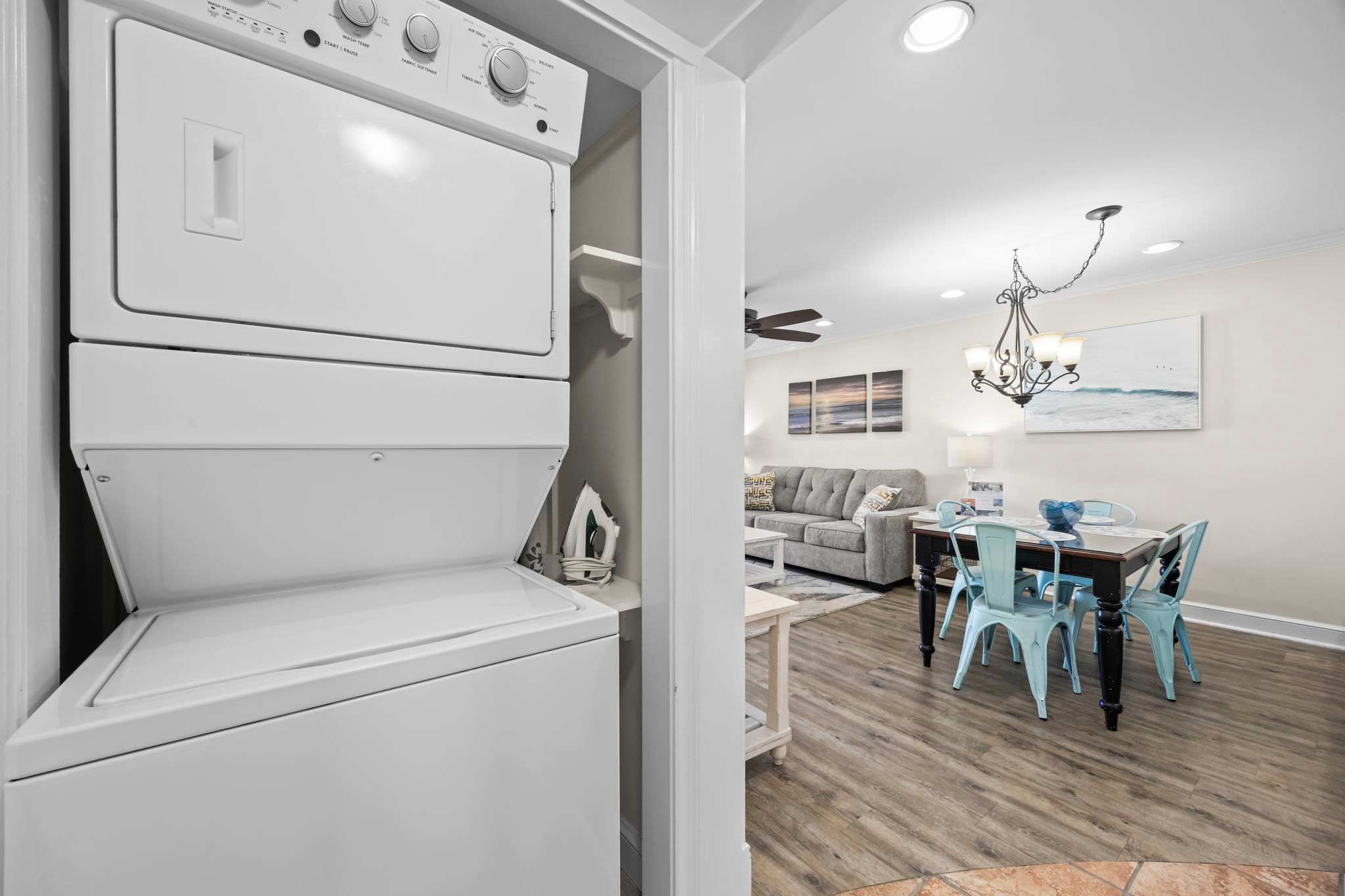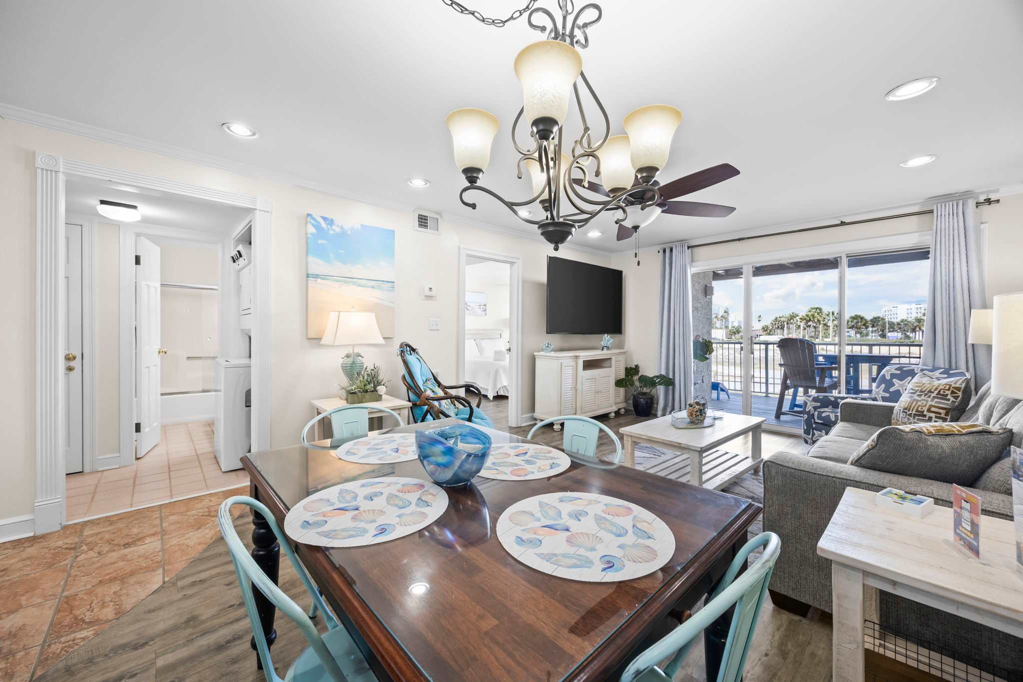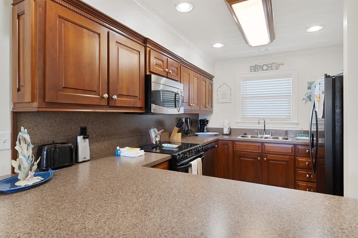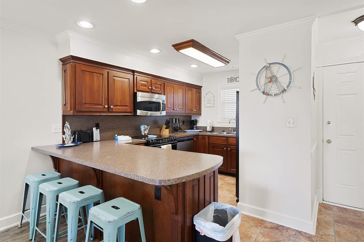 The fully equipped kitchen has everything you need to whip up a seafood feast or quick beach snacks. From stainless steel appliances to plenty of counter space, cooking here is a breeze. The dining table seats four plus four more at countertop, so you’ll have plenty of room for big breakfasts, seafood boils, and late-night board games.