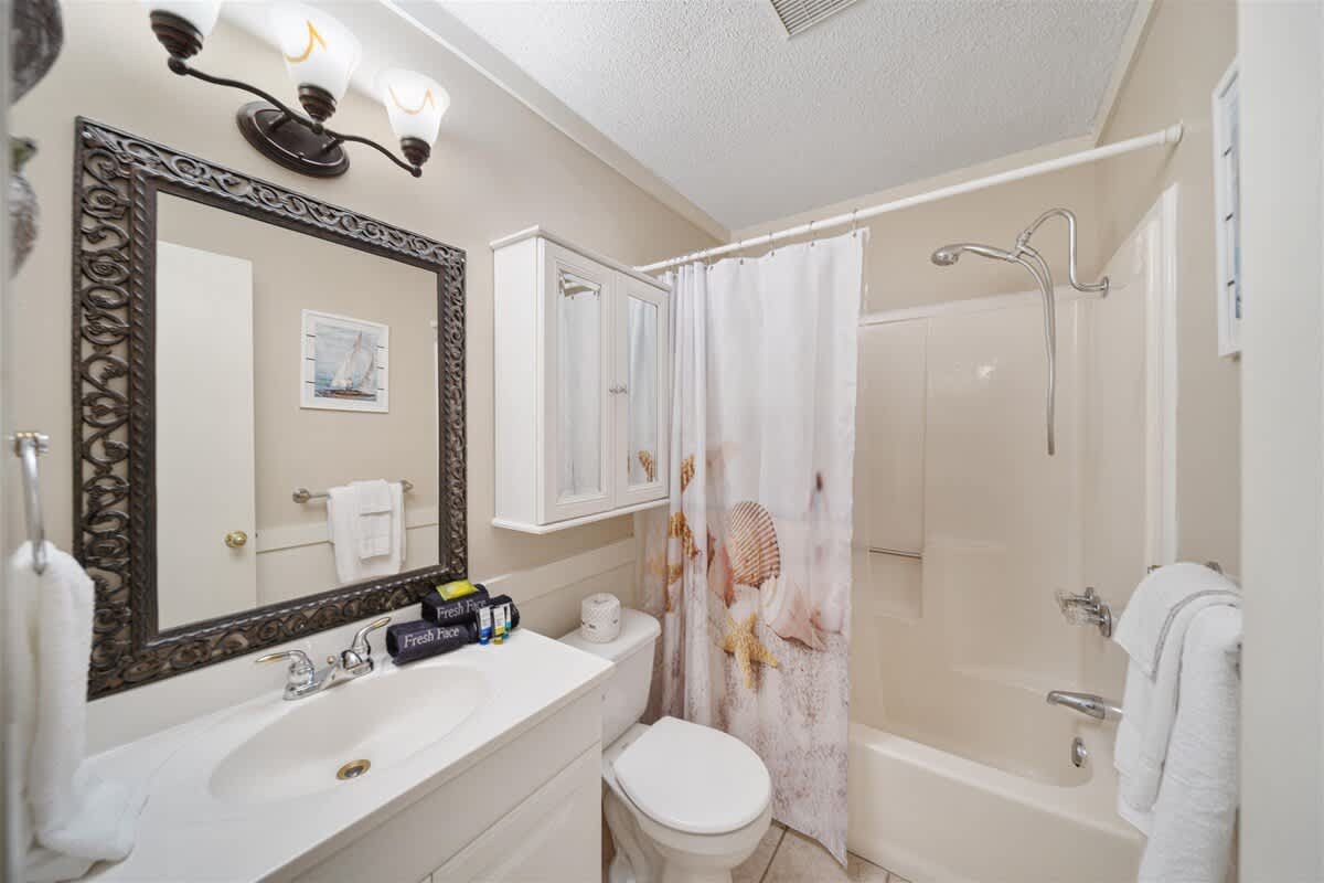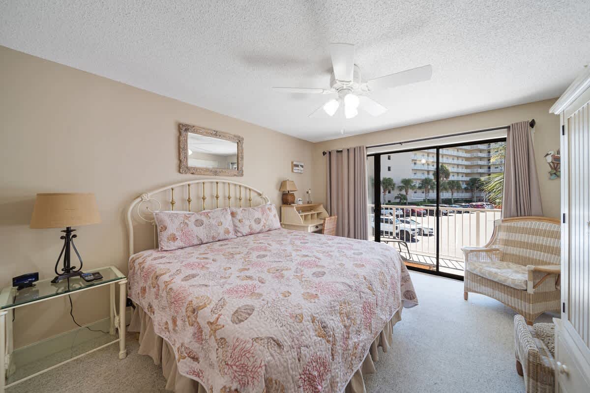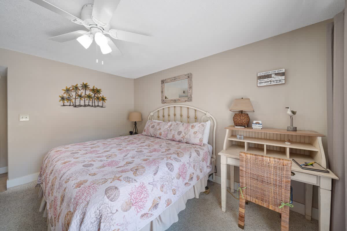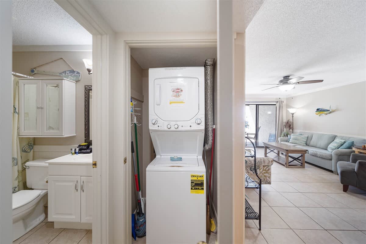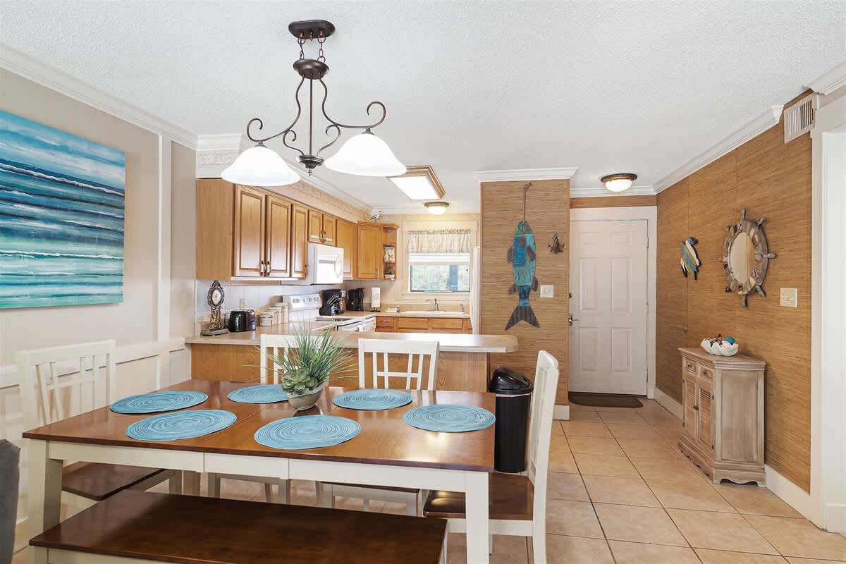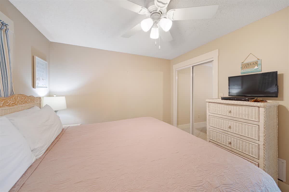 The fully equipped kitchen is stocked with cookware, utensils, and all the essentials for effortless vacation dining. Whether you're whipping up a seafood feast or grabbing a quick bite before hitting the beach, the breakfast bar with seating for two and a dining table for six make every meal a breeze. The primary bedroom features a king-size bed, plenty of storage, a flat-screen TV, and direct balcony access, perfect for waking up to a fresh Gulf breeze. The ensuite bathroom offers a tub-shower combo for a quick rinse or a long soak. The guest bedroom includes a comfortable King bed, its own flat-screen TV, and easy access to the second full bathroom. An in-unit washer and dryer ensure that packing light is never a problem.