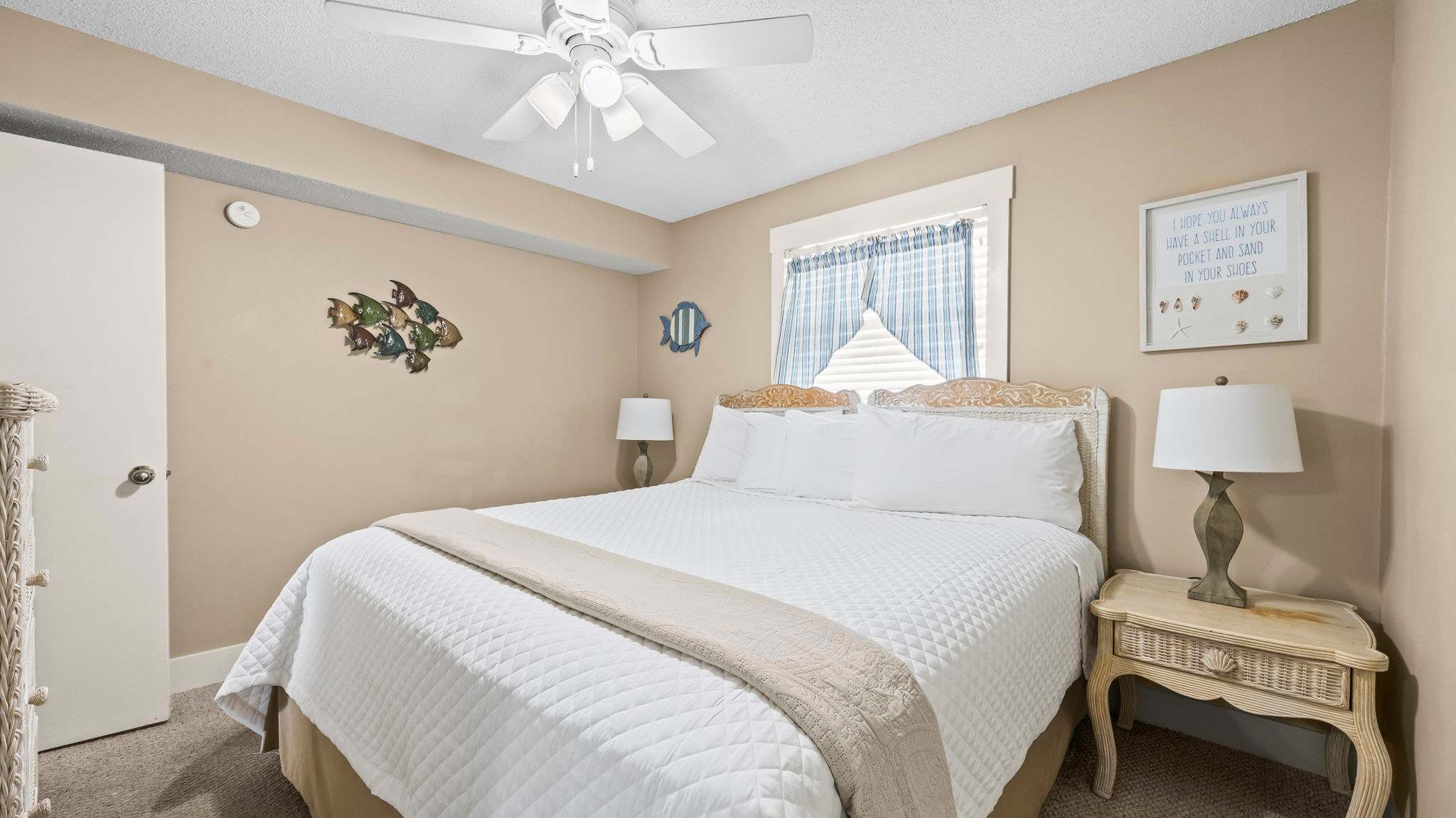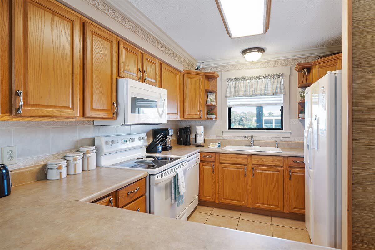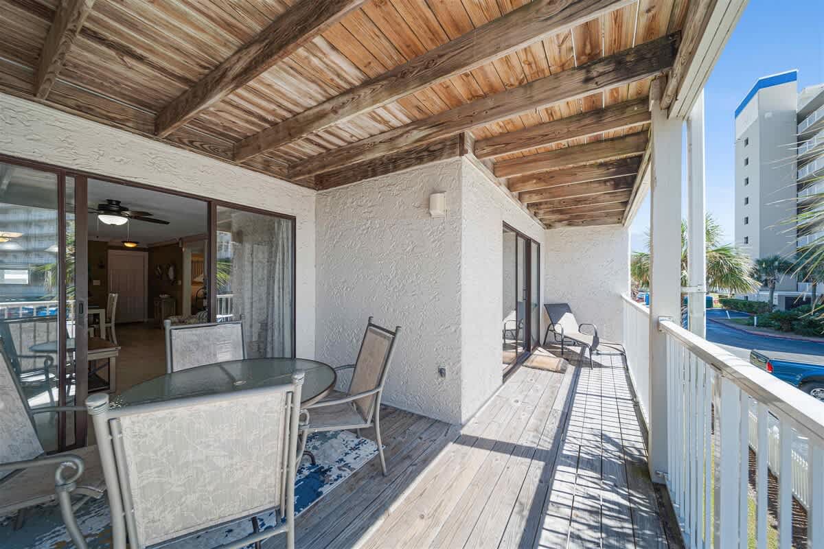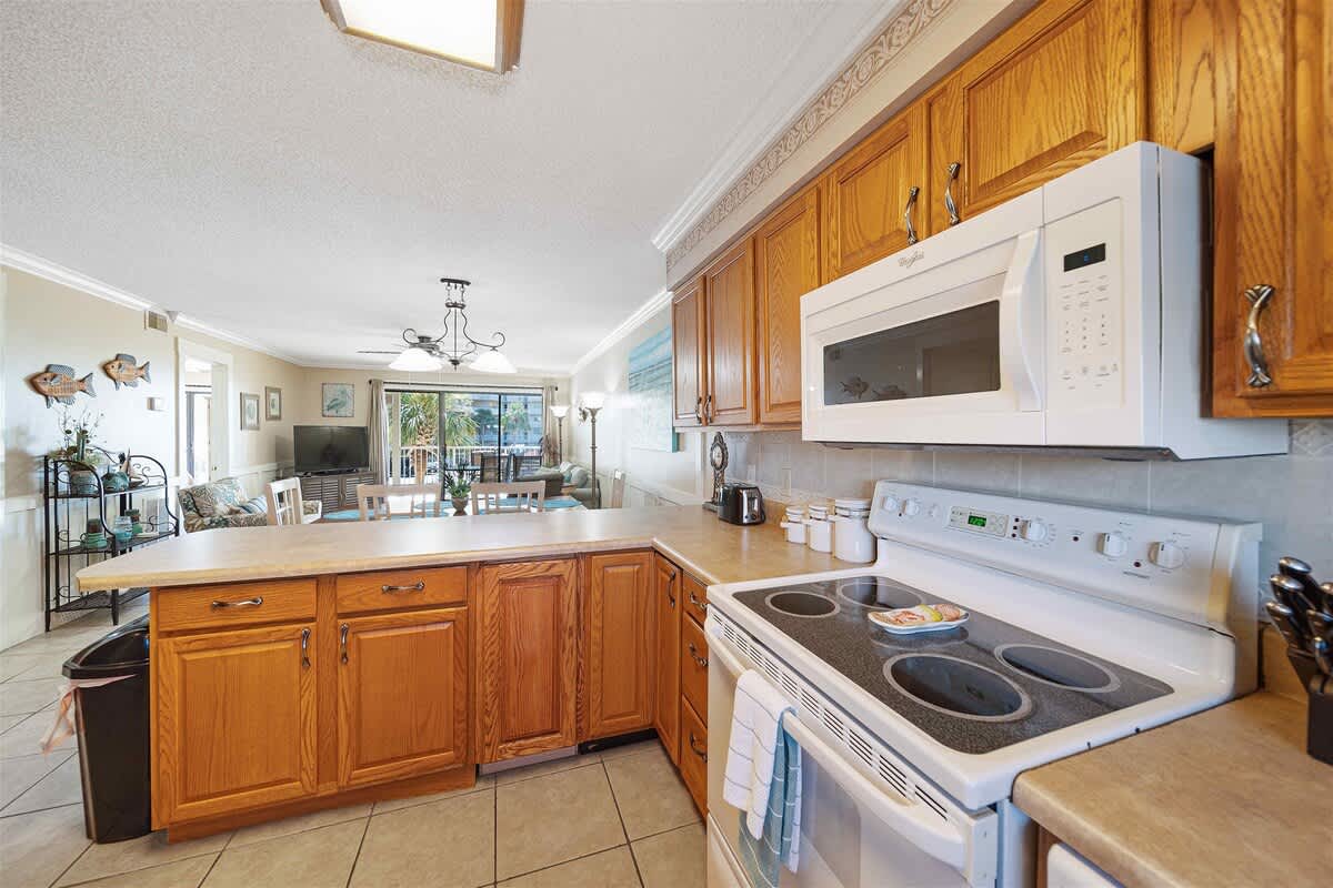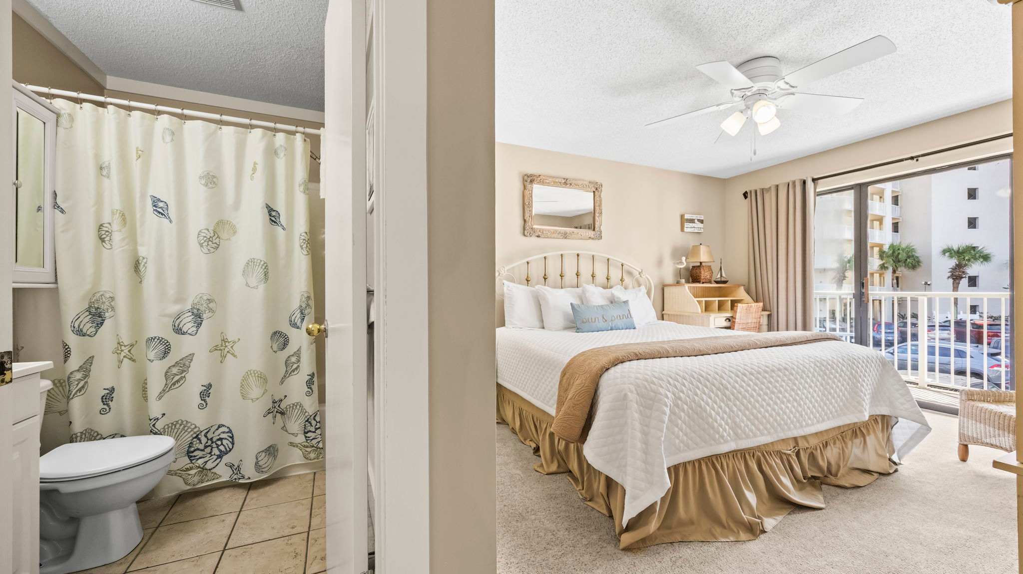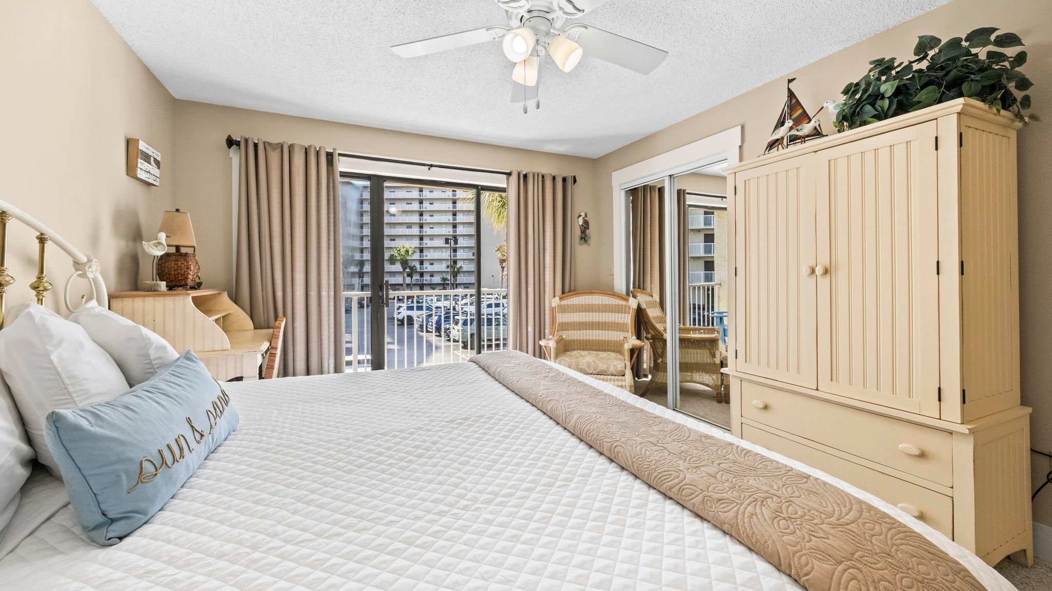 The fully equipped kitchen is stocked with cookware, utensils, and all the essentials for effortless vacation dining. Whether you're whipping up a seafood feast or grabbing a quick bite before hitting the beach, the breakfast bar with seating for two and a dining table for six make every meal a breeze. The primary bedroom features a king-size bed, plenty of storage, a flat-screen TV, and direct balcony access, perfect for waking up to a fresh Gulf breeze. The ensuite bathroom offers a tub-shower combo for a quick rinse or a long soak. The guest bedroom includes a comfortable King bed, its own flat-screen TV, and easy access to the second full bathroom. An in-unit washer and dryer ensure that packing light is never a problem.