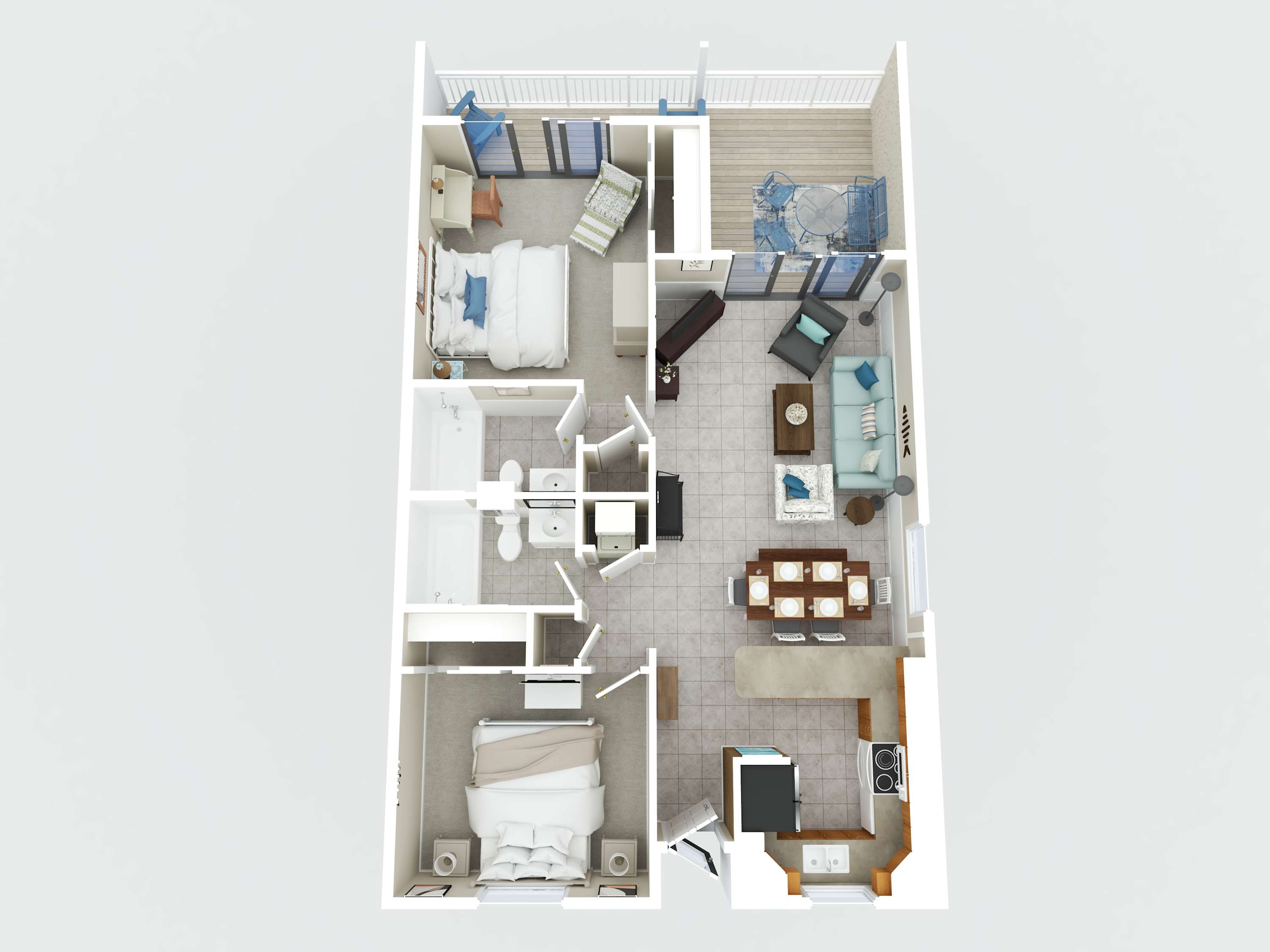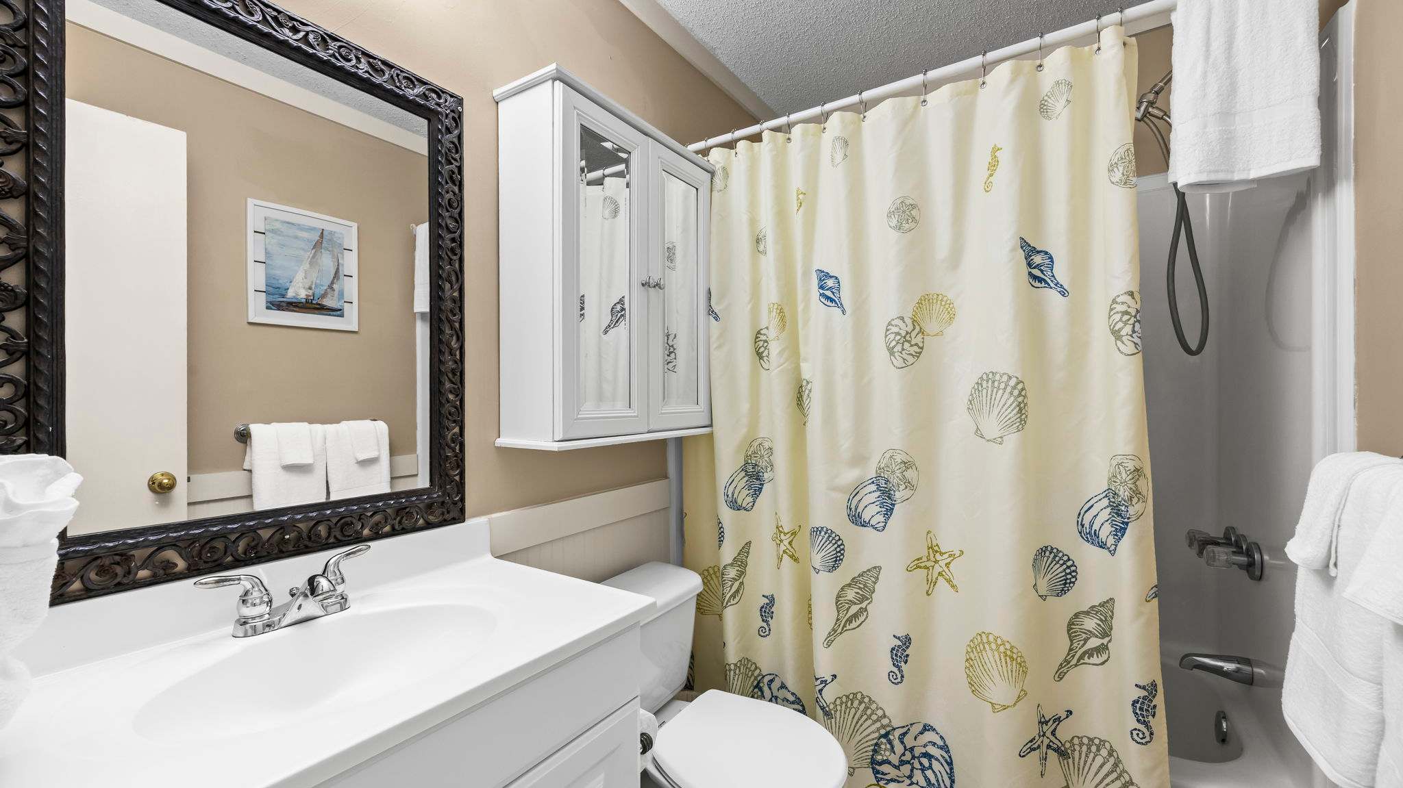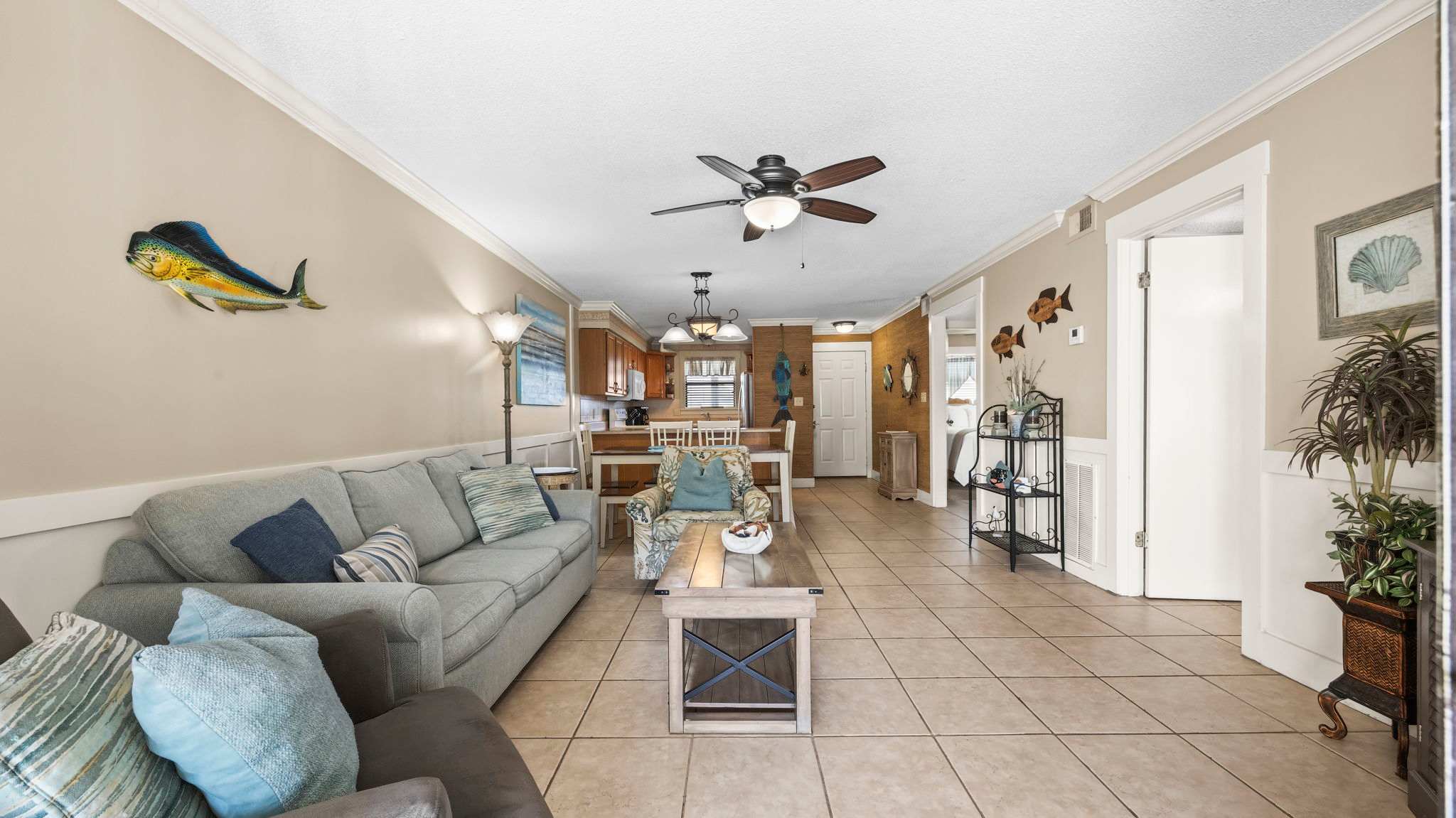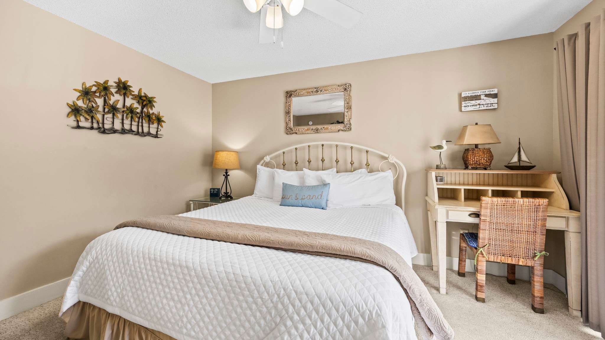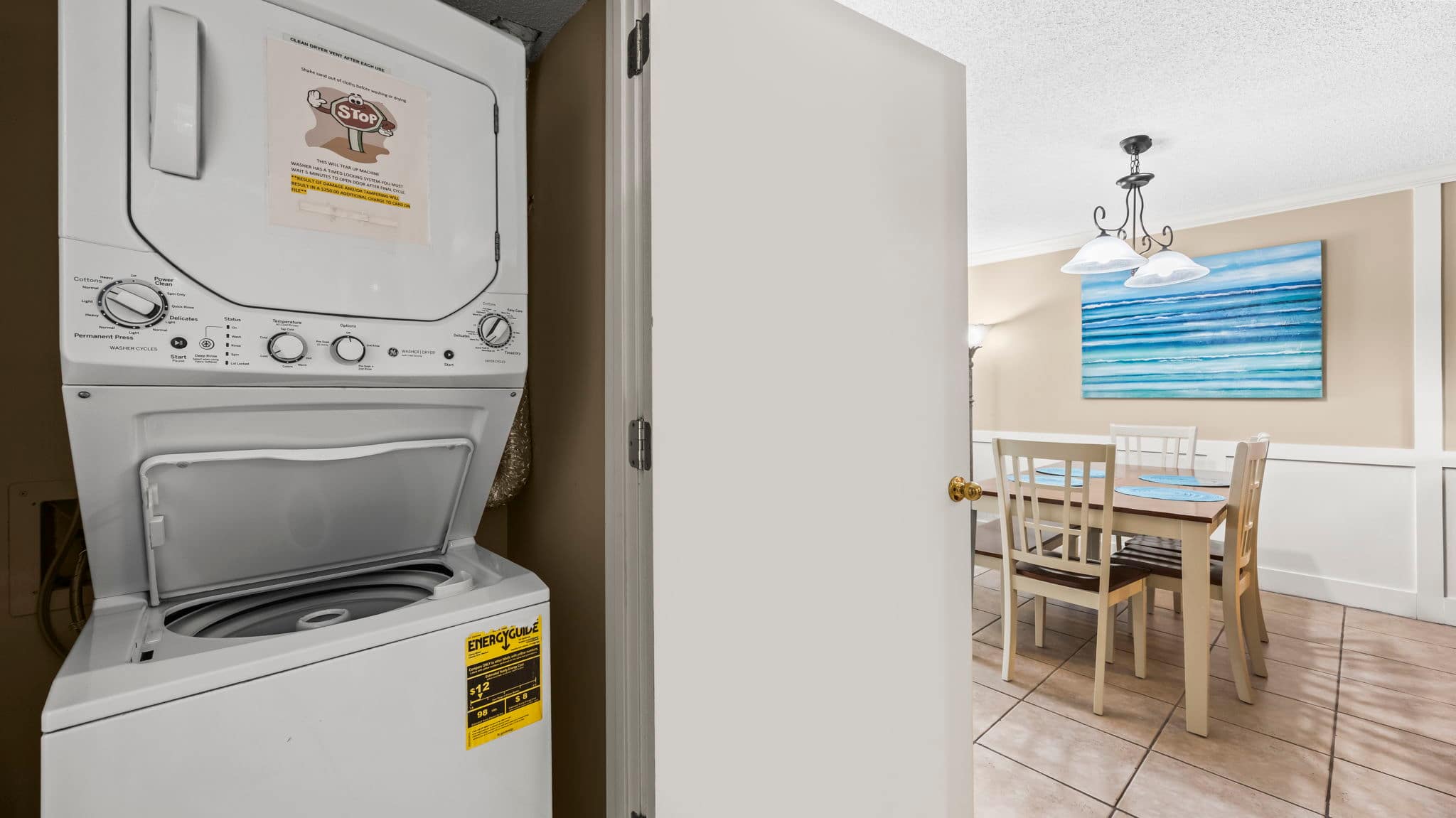 The fully equipped kitchen is stocked with cookware, utensils, and all the essentials for effortless vacation dining. Whether you're whipping up a seafood feast or grabbing a quick bite before hitting the beach, the breakfast bar with seating for two and a dining table for six make every meal a breeze. The primary bedroom features a king-size bed, plenty of storage, a flat-screen TV, and direct balcony access, perfect for waking up to a fresh Gulf breeze. The ensuite bathroom offers a tub-shower combo for a quick rinse or a long soak. The guest bedroom includes a comfortable King bed, its own flat-screen TV, and easy access to the second full bathroom. An in-unit washer and dryer ensure that packing light is never a problem.