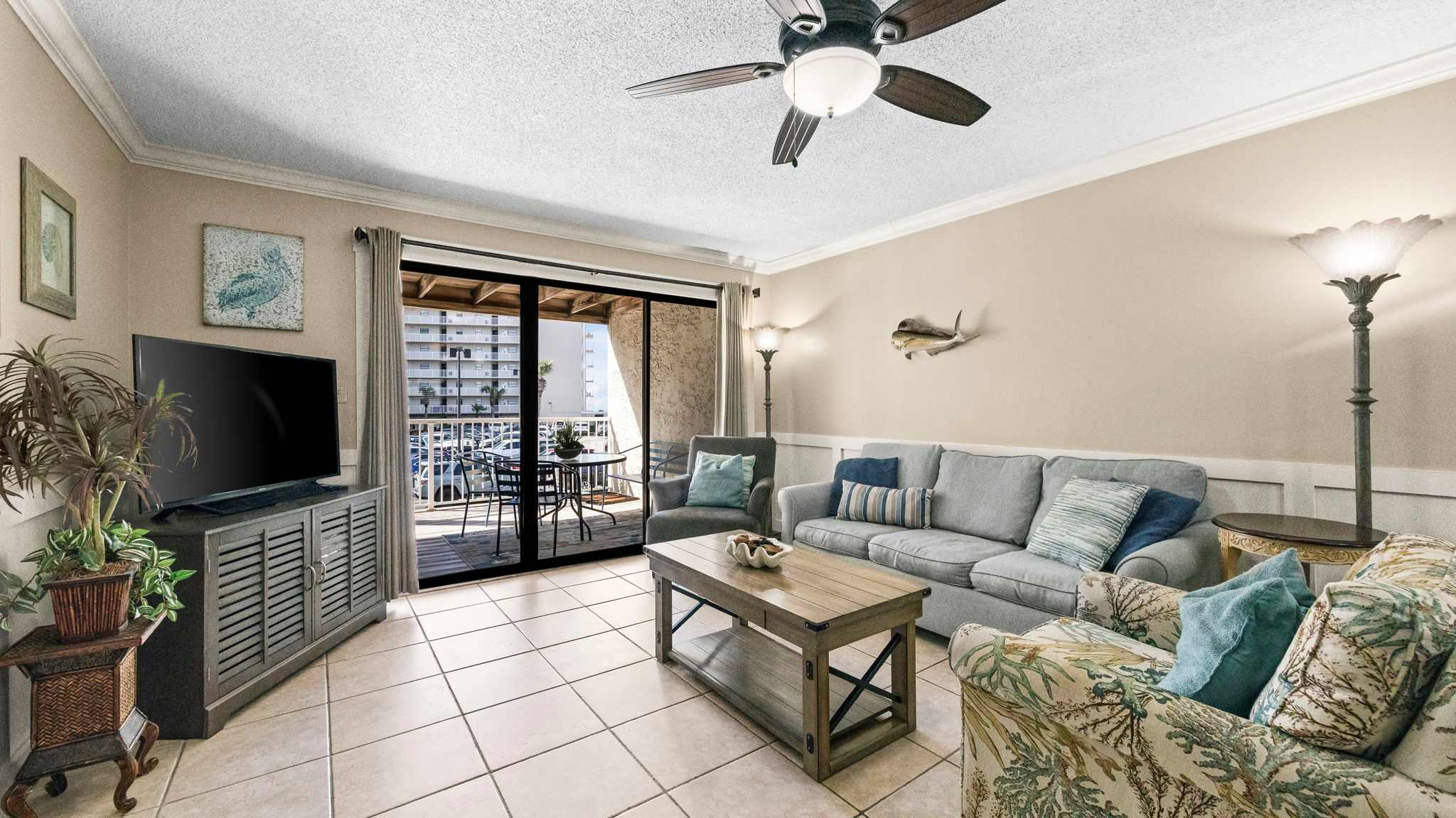 Kick back and soak in the beachside energy at Seaside Beach & Racquet 2203, a spacious two-bedroom, two-bathroom retreat in Orange Beach. This stylishly cozy condo delivers everything you need for a stress-free getaway—easy access to the sugar-white sands, resort-style amenities, and all the comforts of home with a splash of Gulf Coast charm. The bright and breezy living area invites you to unwind with a plush sofa, accent chairs, and a flat-screen TV for laid-back movie nights. Slide open the floor-to-ceiling glass doors and step onto your private balcony, where you can sip your morning coffee while taking in the fresh Gulf air.