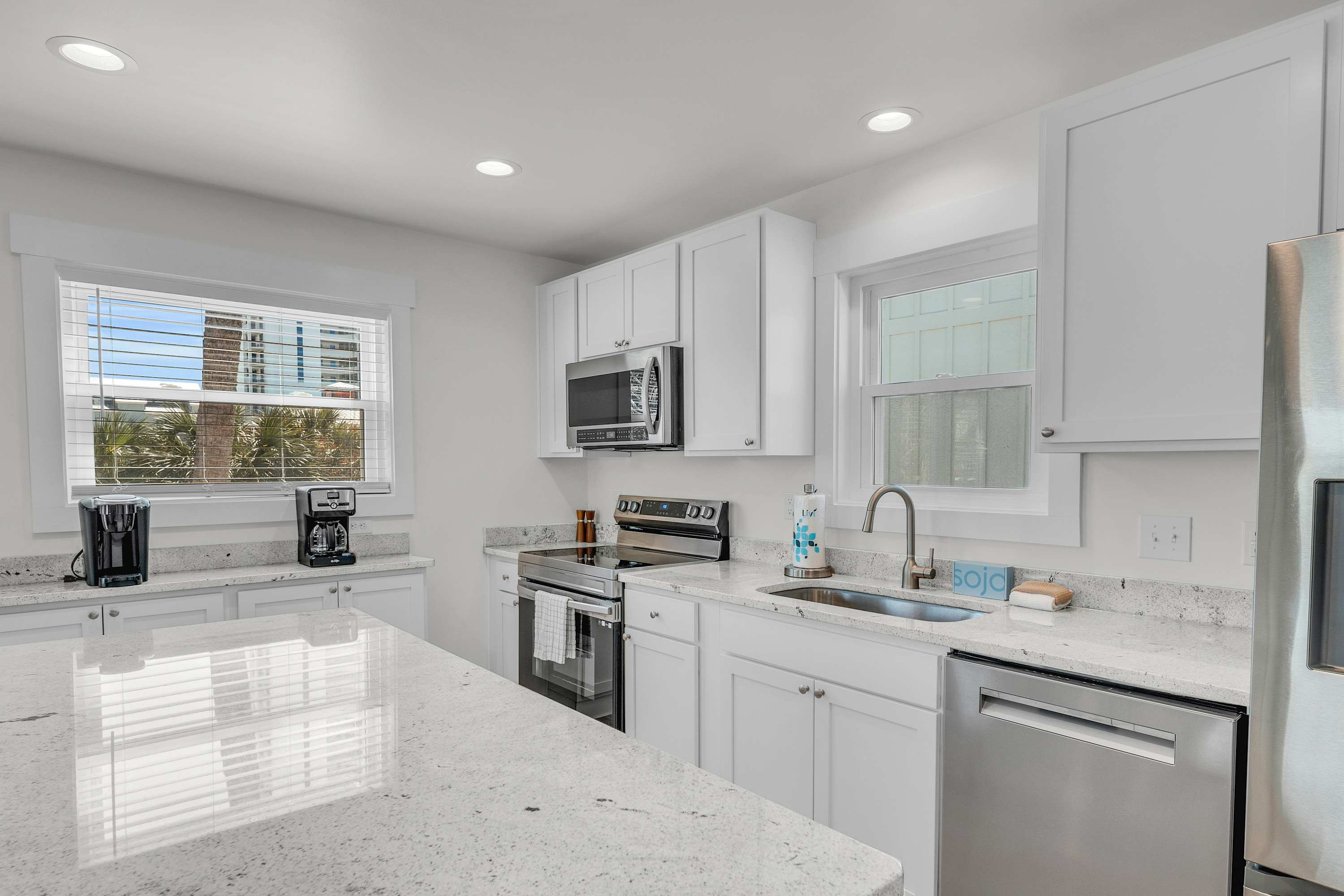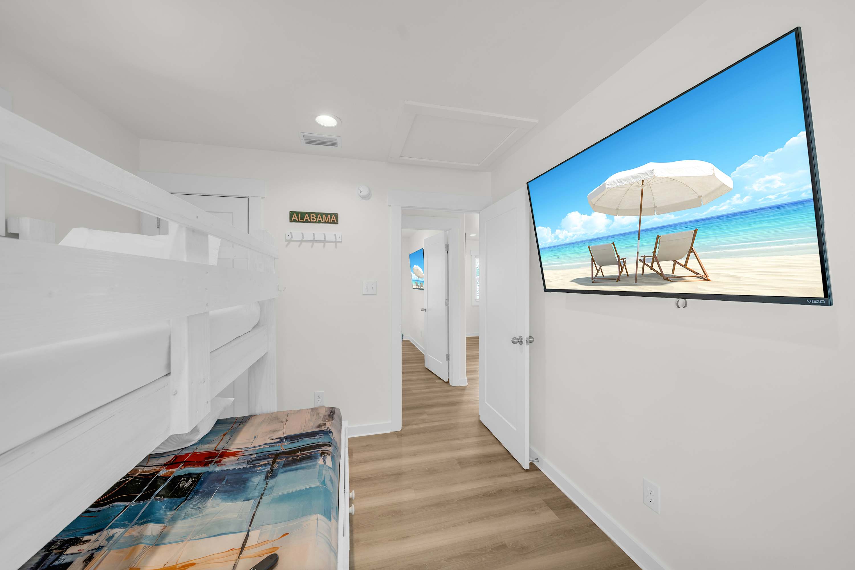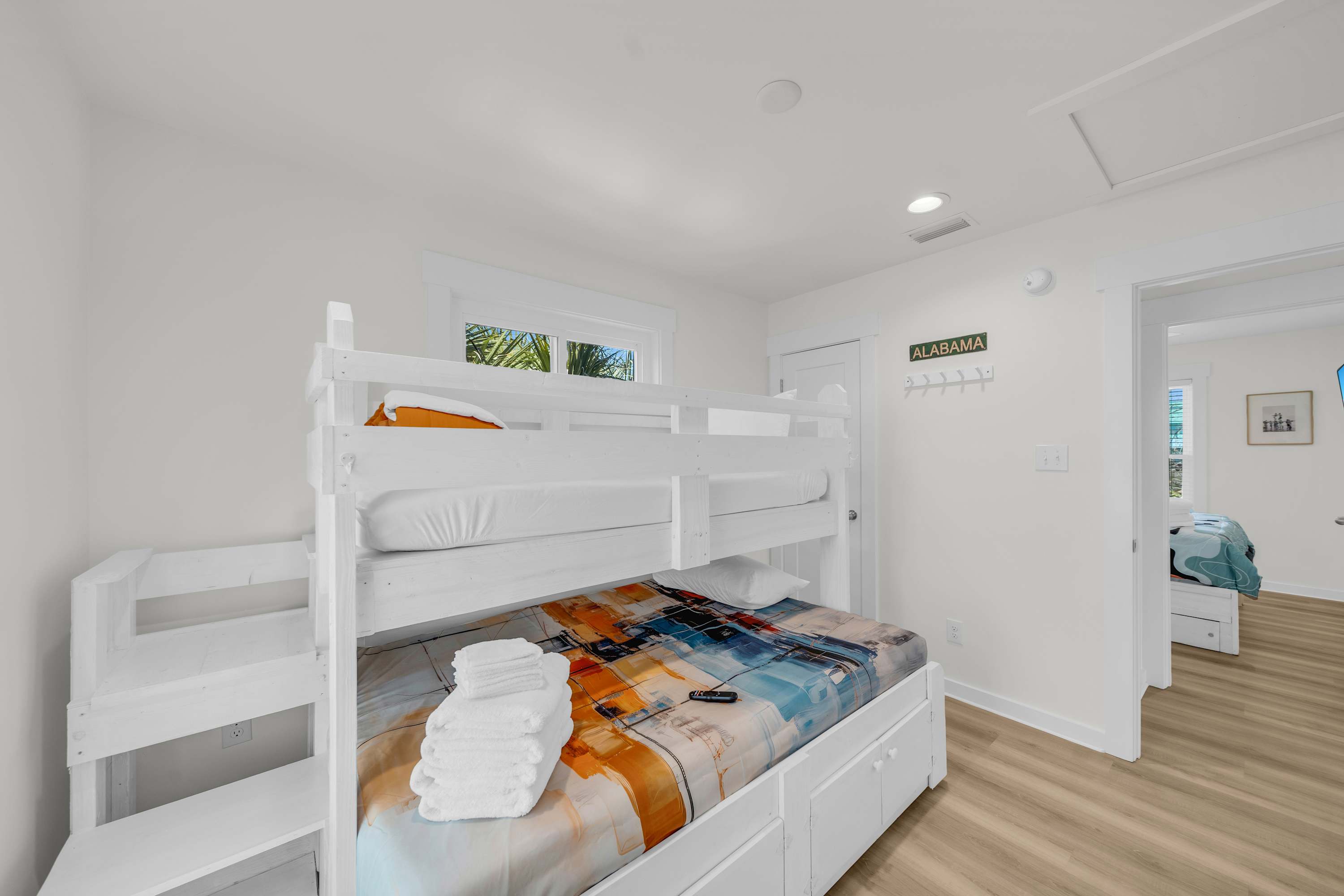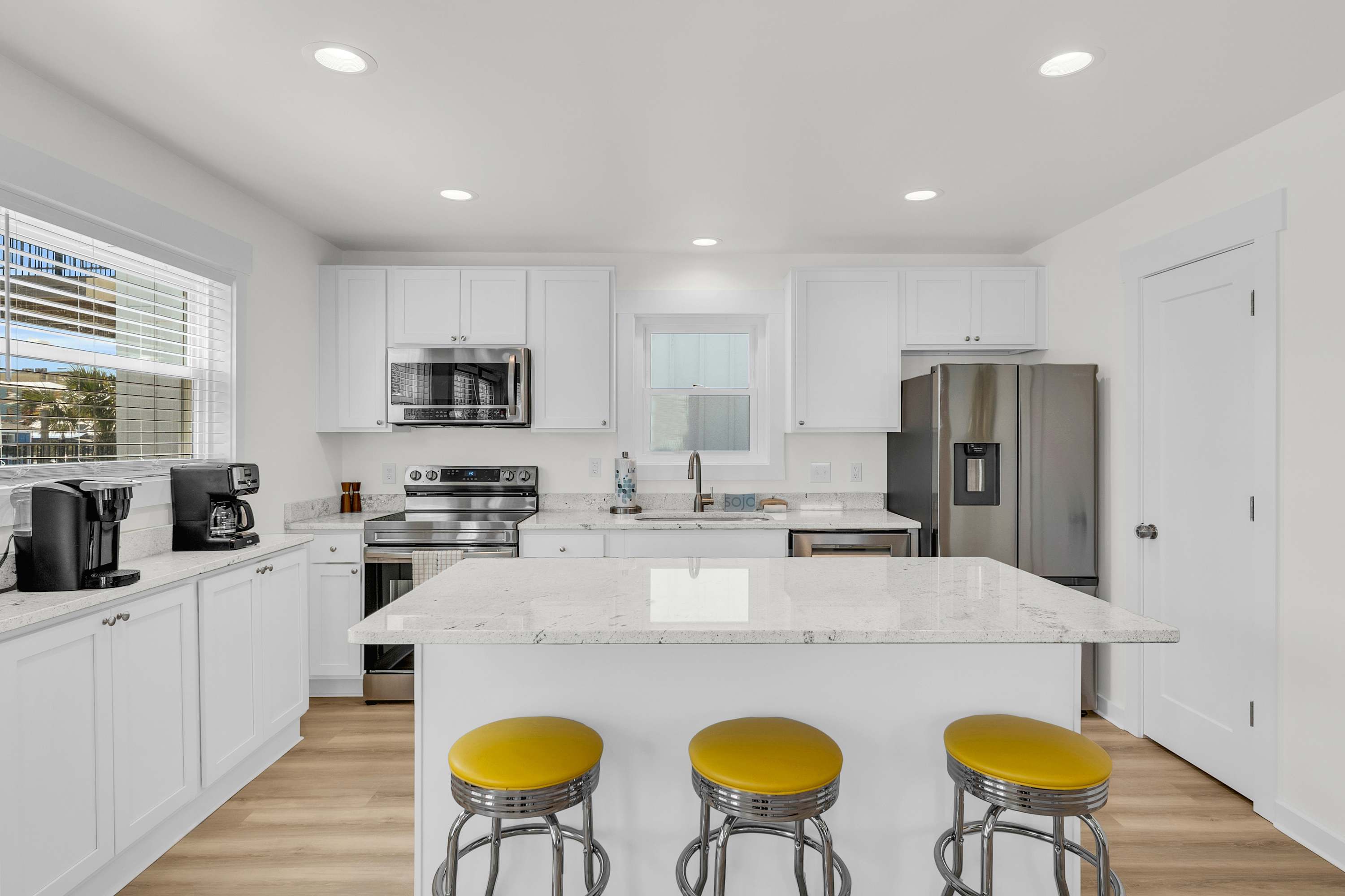 The primary bedroom features a queen bed with soft, coastal linens that’ll have you snoozing like a beach bum, while the second bedroom offers a twin over twin bunk bed that’s perfect for the kiddos or a couple of beach-loving pals. The fully-equipped kitchen is ready for whatever your crew craves, from fresh seafood feasts to quick bites before you hit the sand. A bright and clean design with white cabinets, modern appliances, and a large island with stylish yellow bar stools adds a pop of playful energy to your cooking sessions.