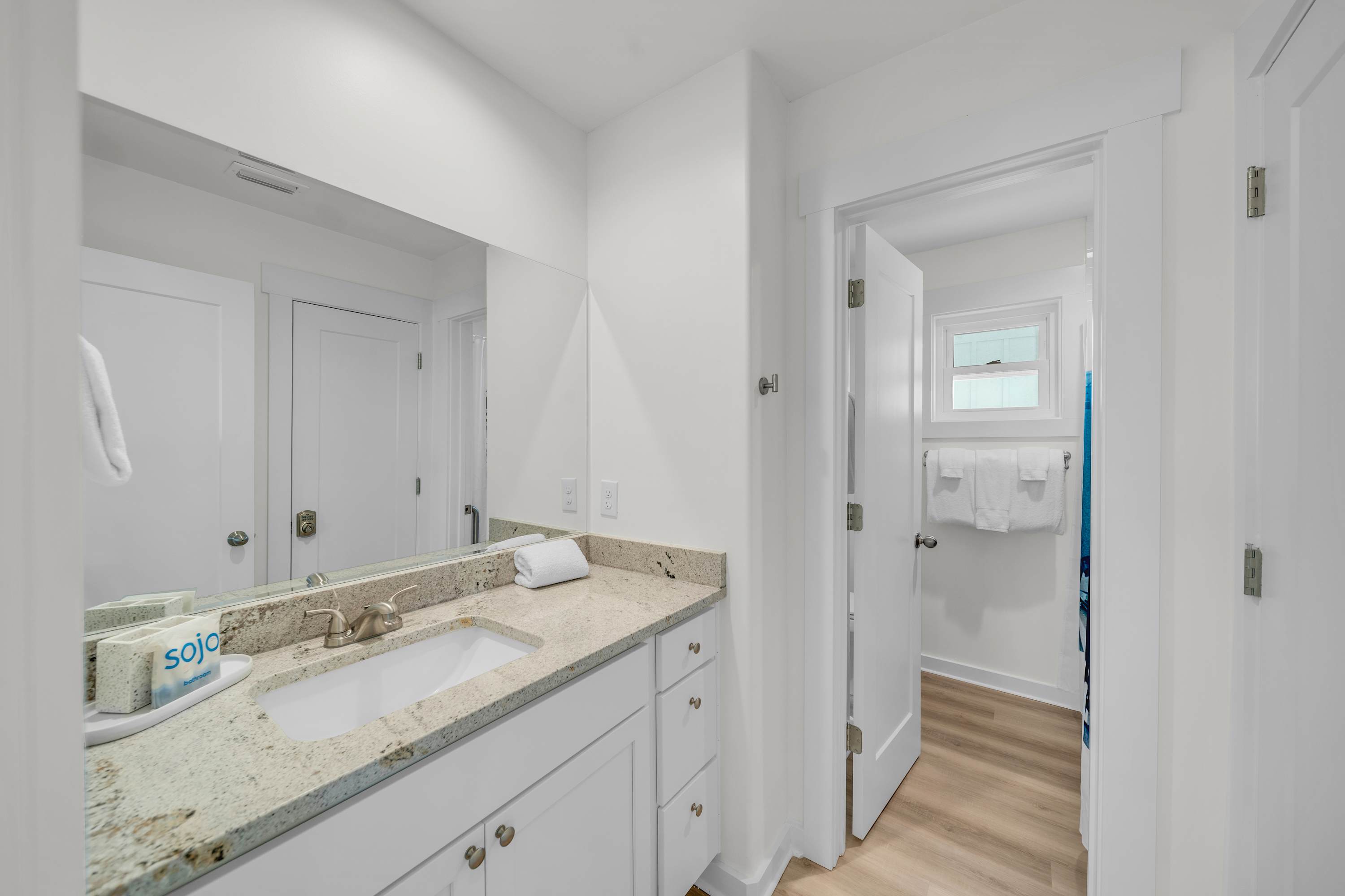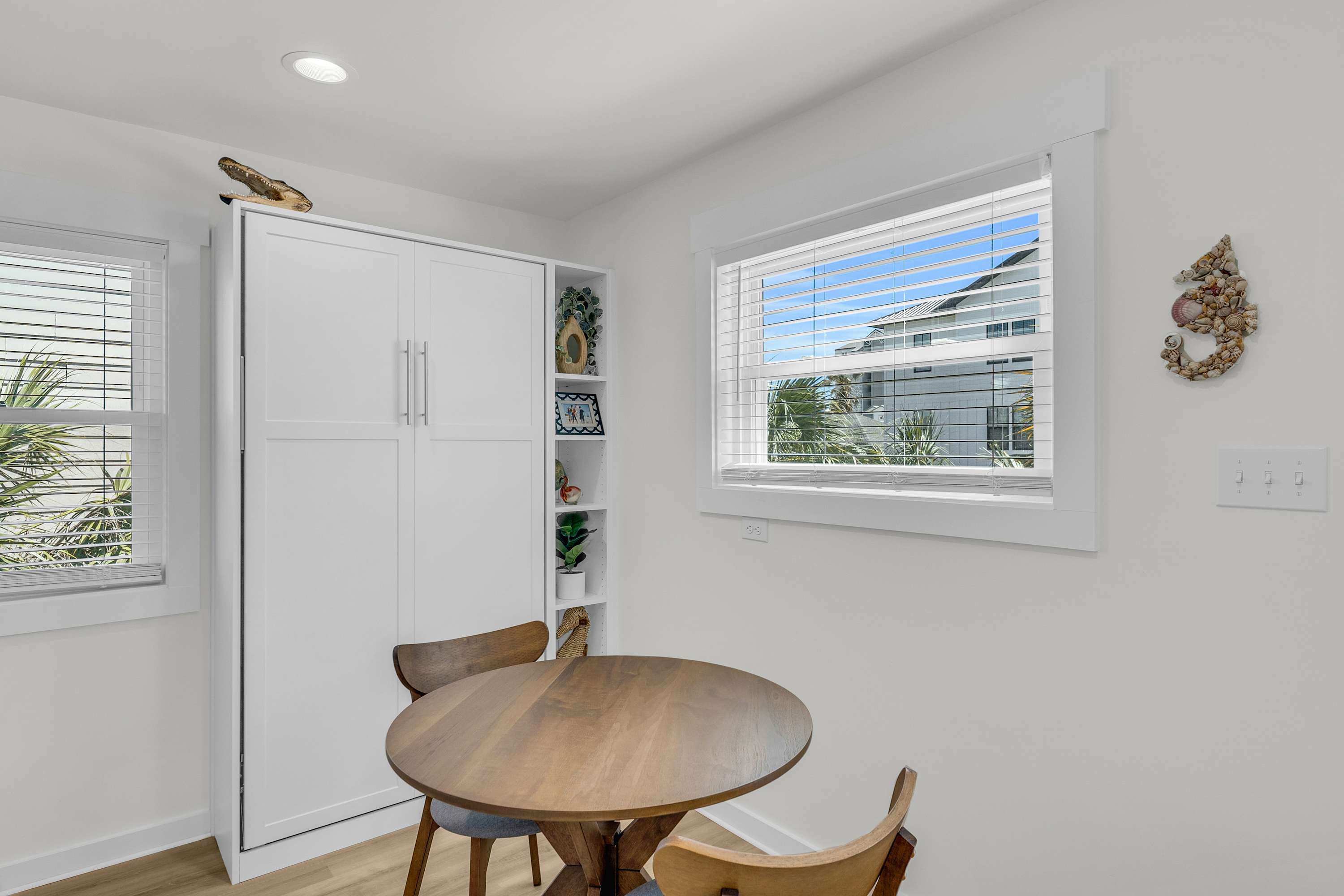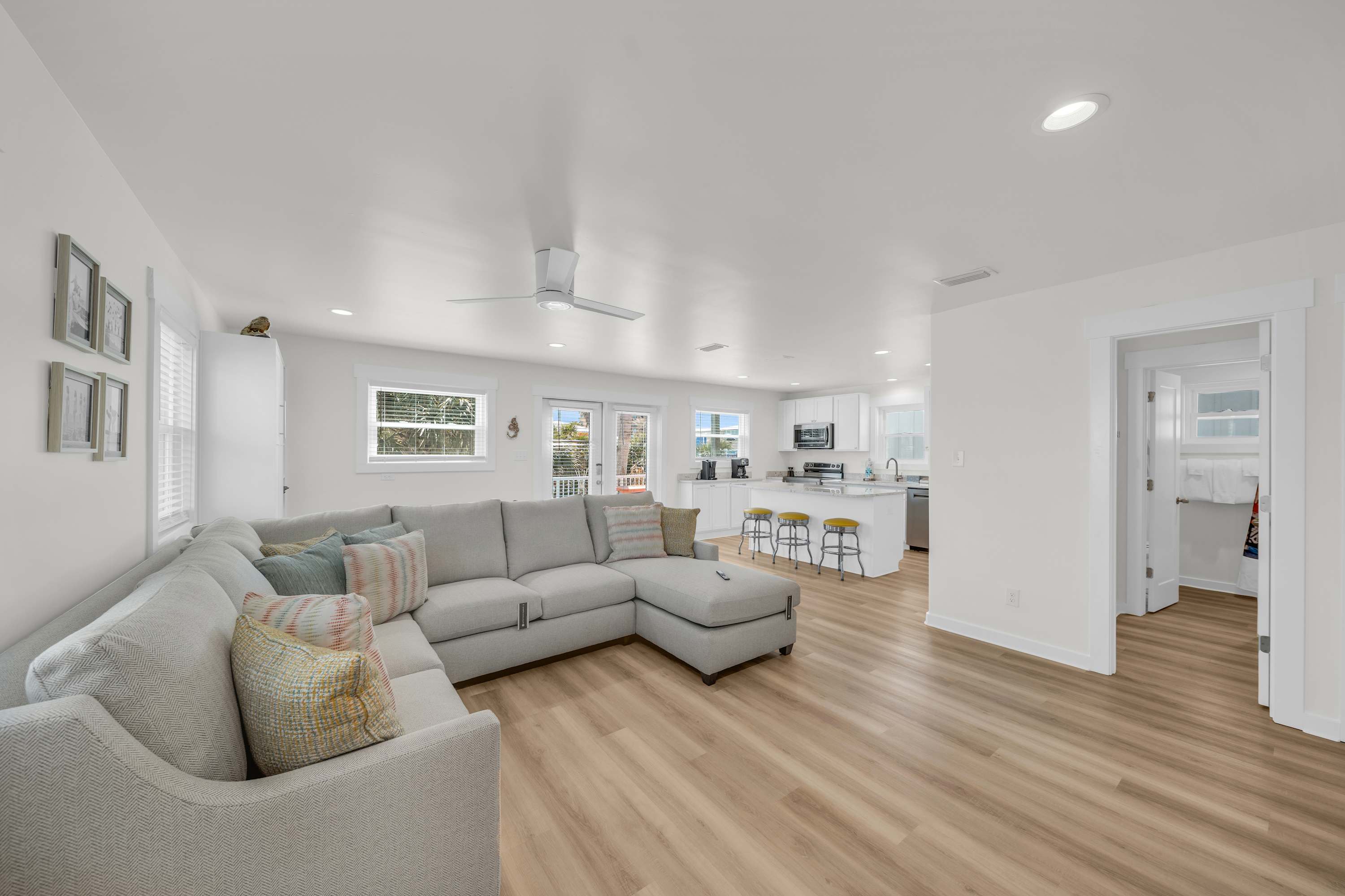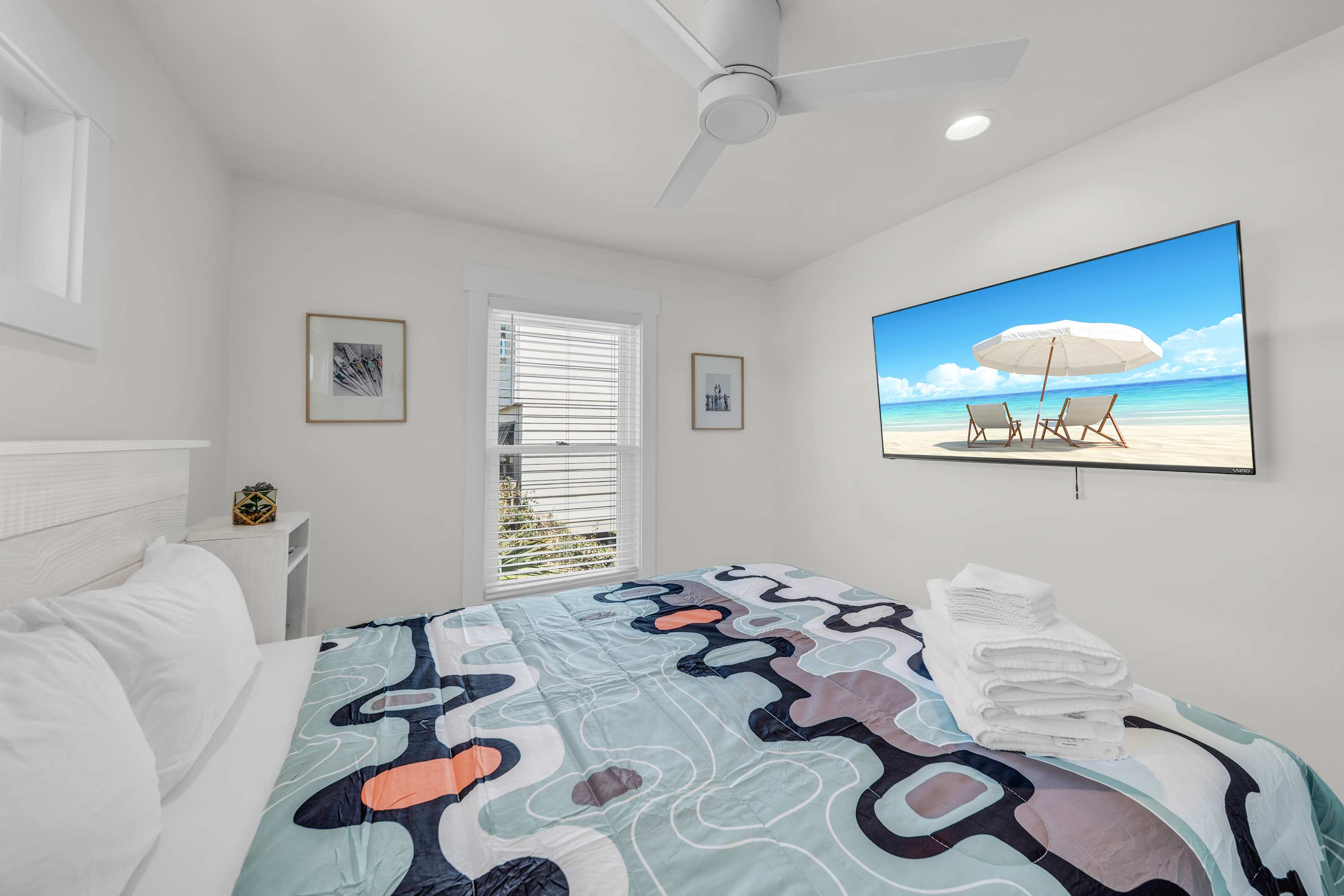 The primary bedroom features a queen bed with soft, coastal linens that’ll have you snoozing like a beach bum, while the second bedroom offers a twin over twin bunk bed that’s perfect for the kiddos or a couple of beach-loving pals. The fully-equipped kitchen is ready for whatever your crew craves, from fresh seafood feasts to quick bites before you hit the sand. A bright and clean design with white cabinets, modern appliances, and a large island with stylish yellow bar stools adds a pop of playful energy to your cooking sessions.